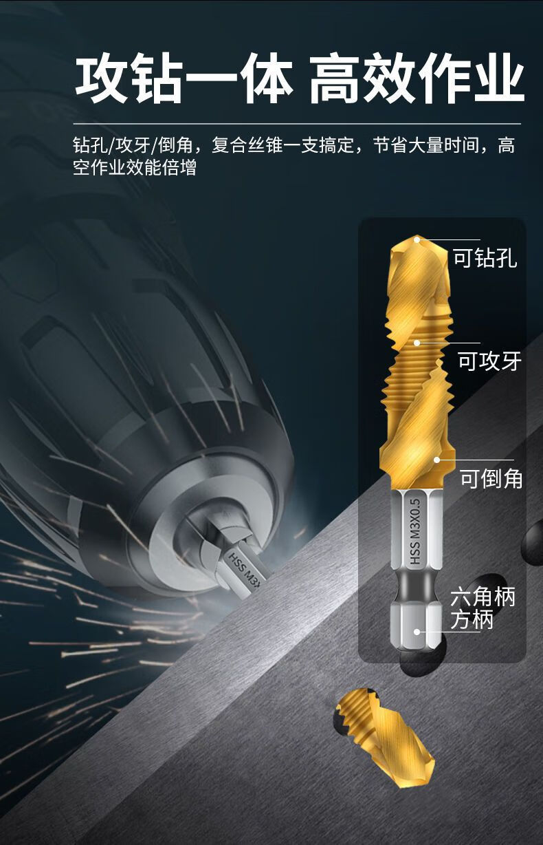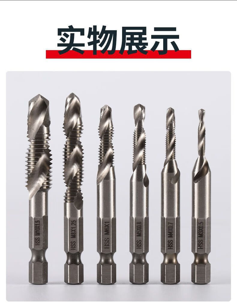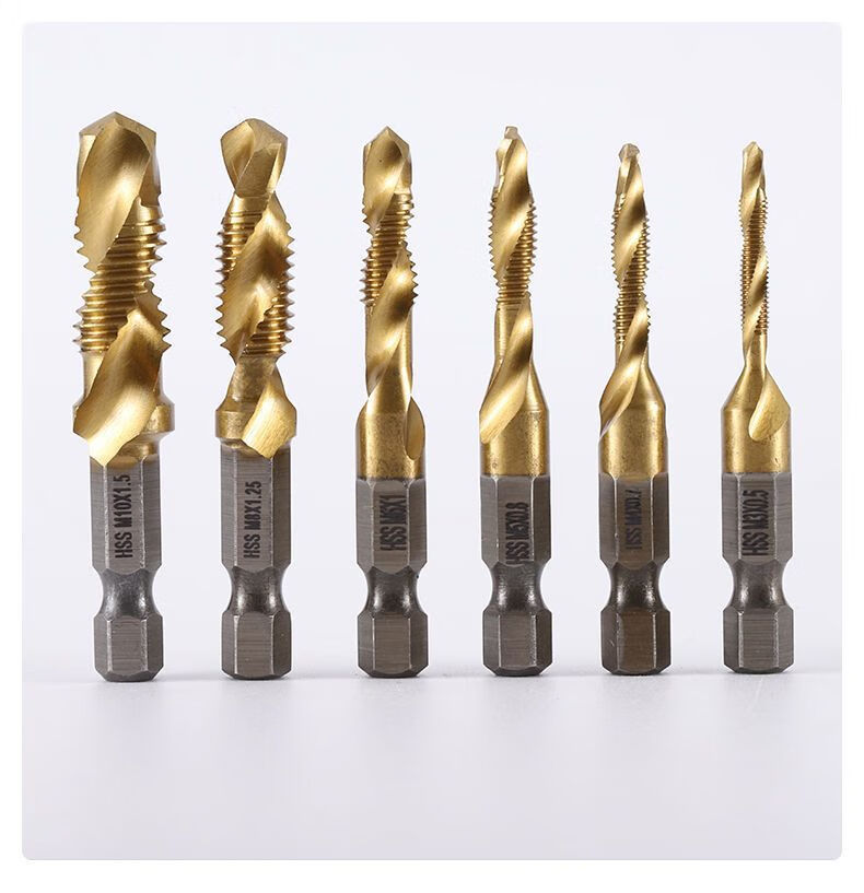 Lanlian composite tap for drilling and tapping machine, titanium-plated hexagonal handle thread tapping, electric drill bit tap set, 6pc short gold M3M4M5M6M8M10