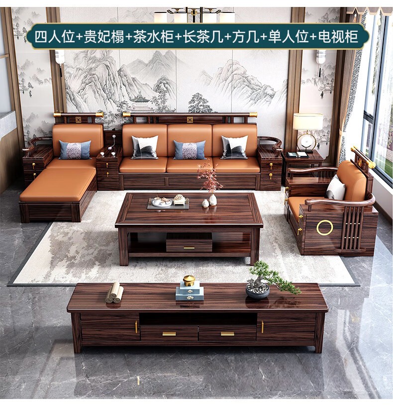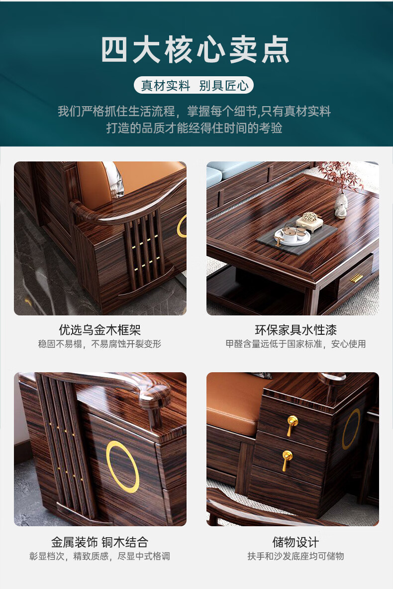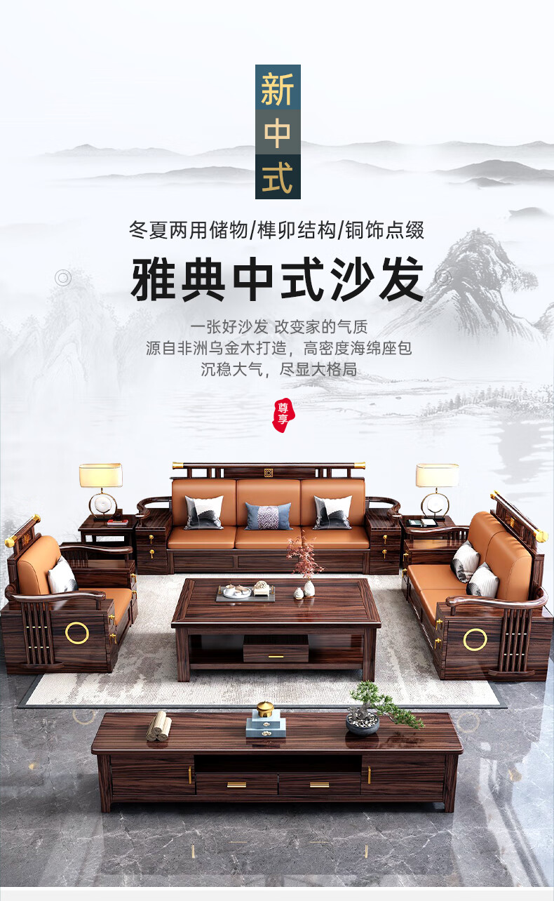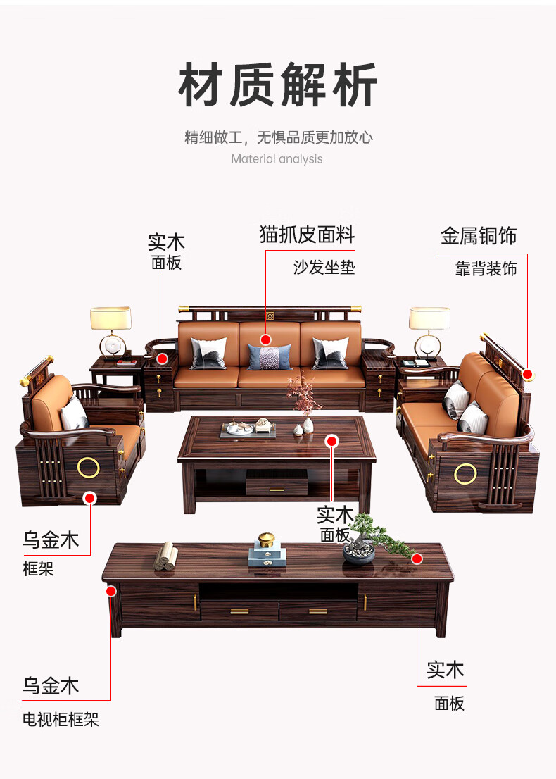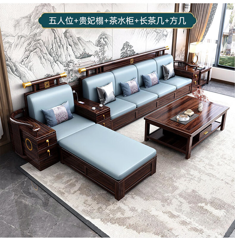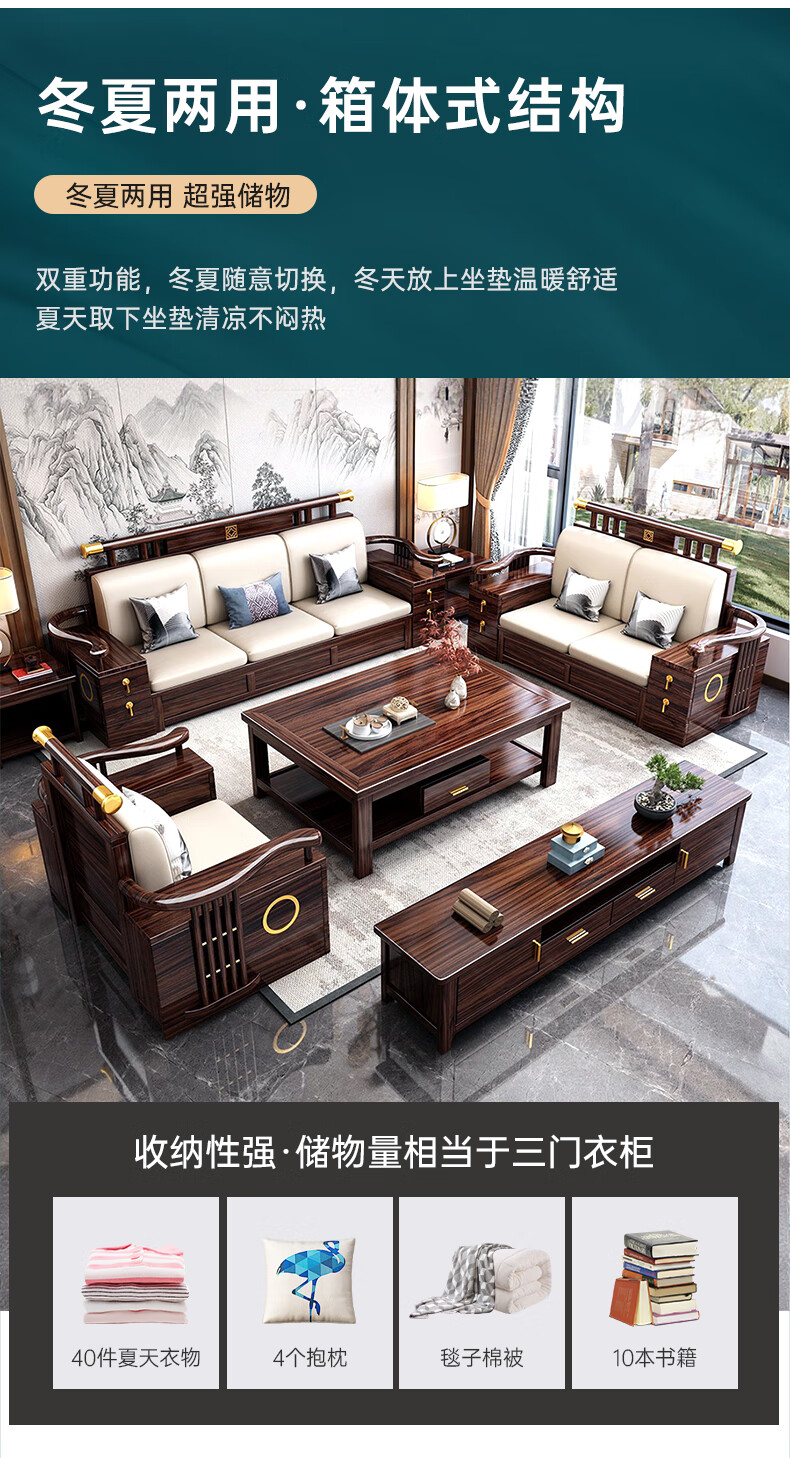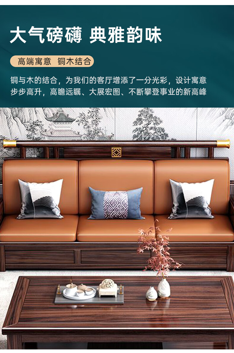 Youfanshi new Chinese style ebony solid wood sofa living room combination high-end cat claw leather winter and summer dual-use large apartment storage furniture 2+2+3+coffee table+square table+TV cabinet
