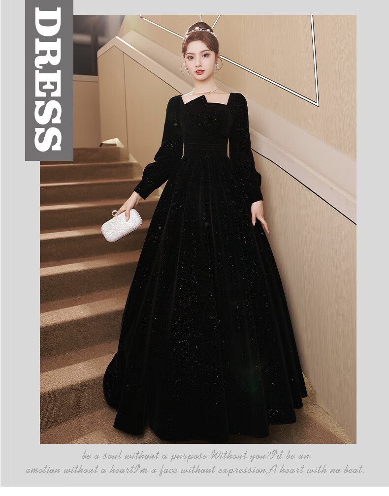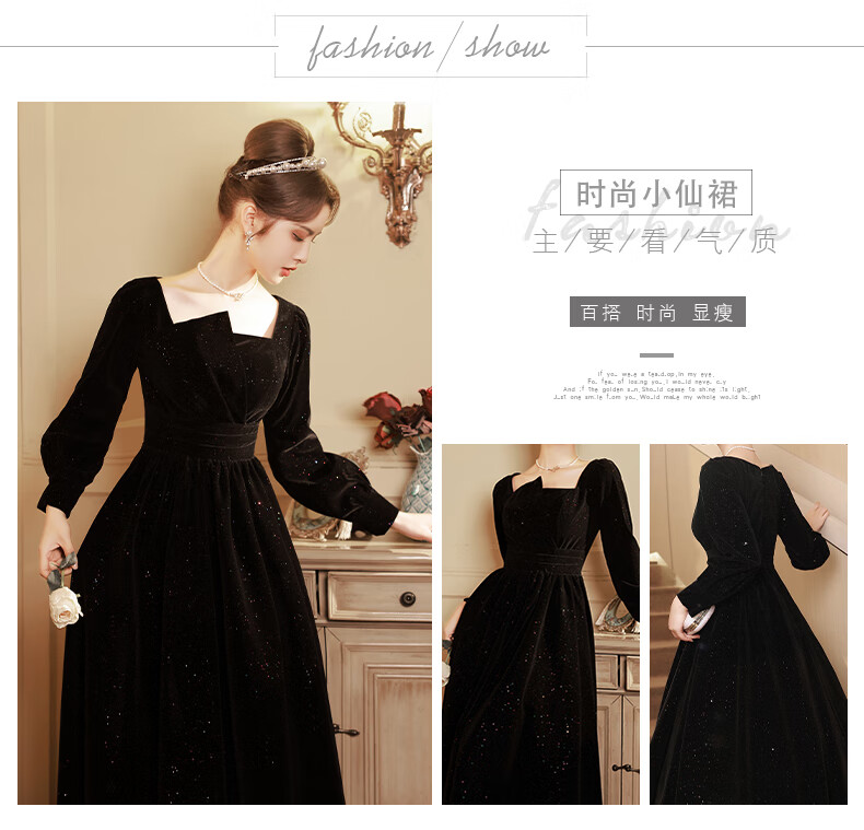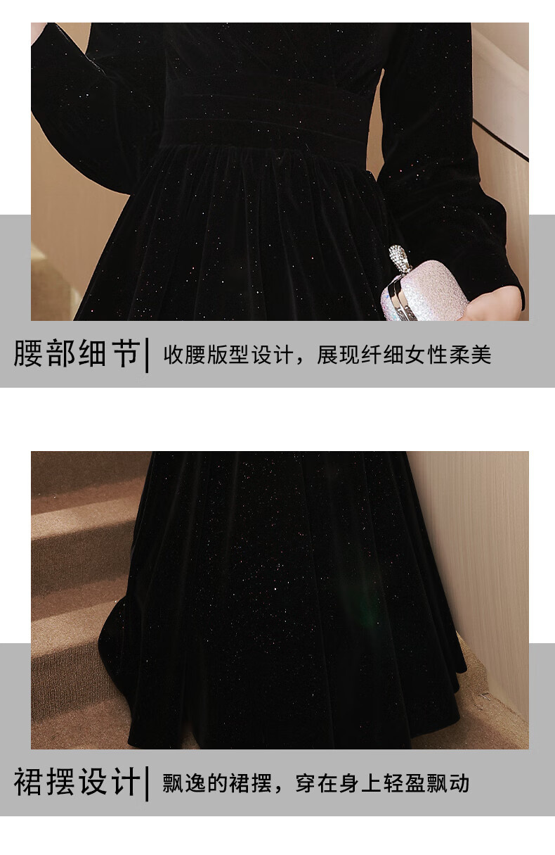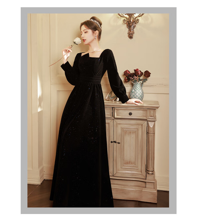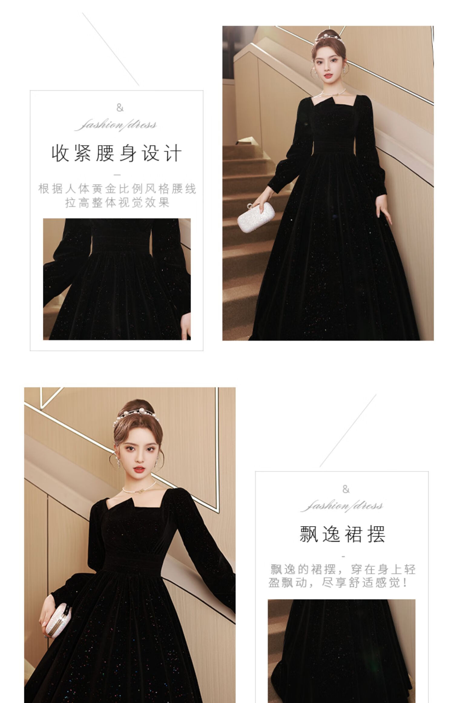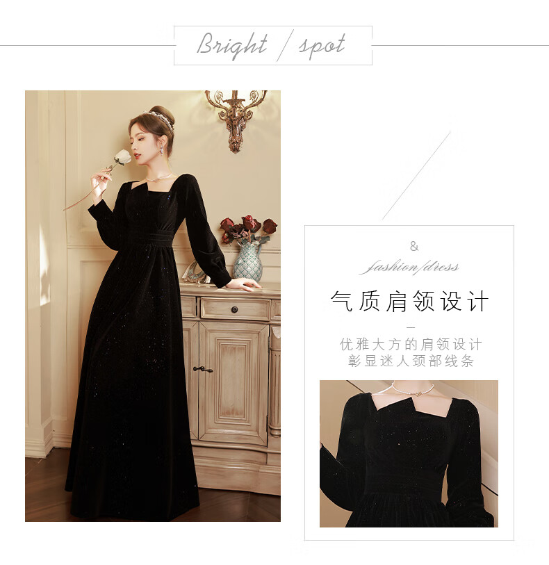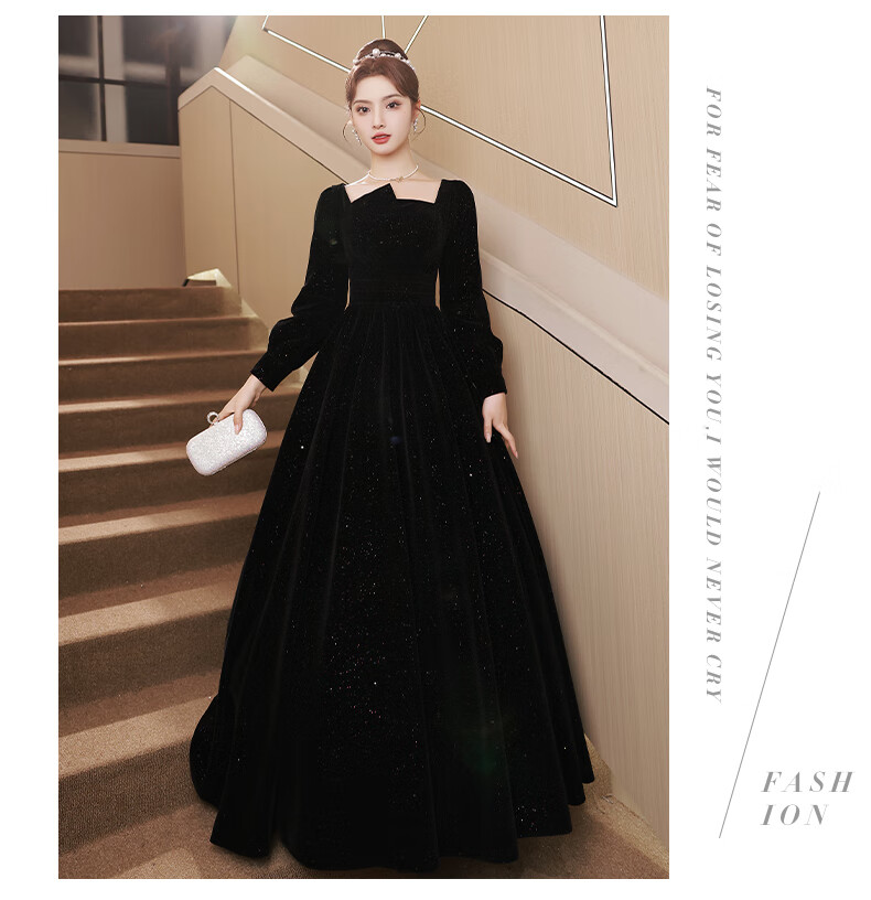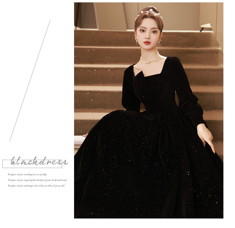 Libaixin black long-sleeved evening dress female celebrity banquet annual meeting long dress host French adult ceremony art test dress autumn and winter blue 2XL recommended 122-128Jin Jin equals 0.5 kg
