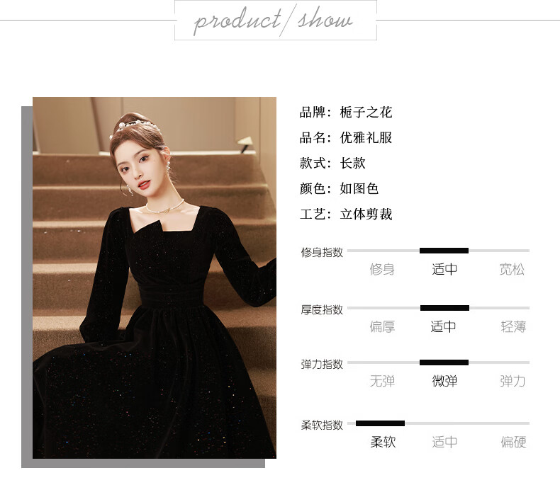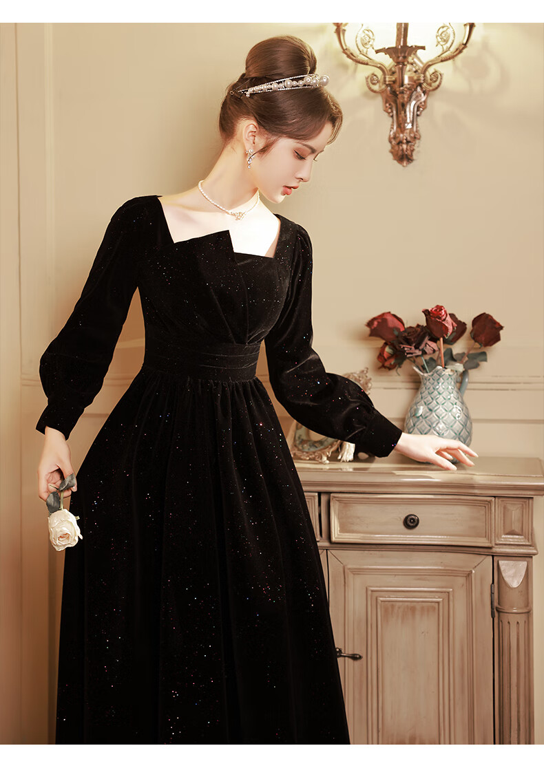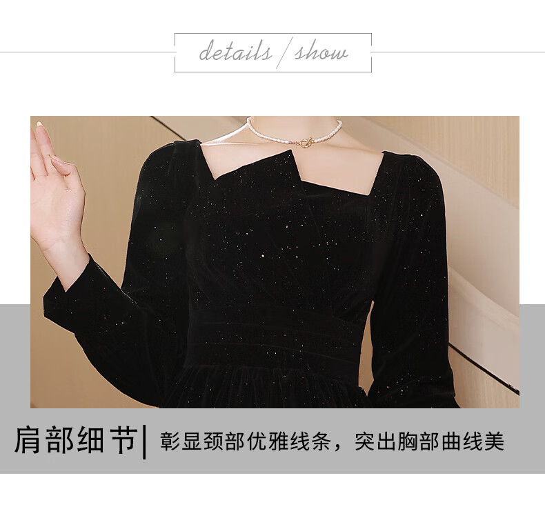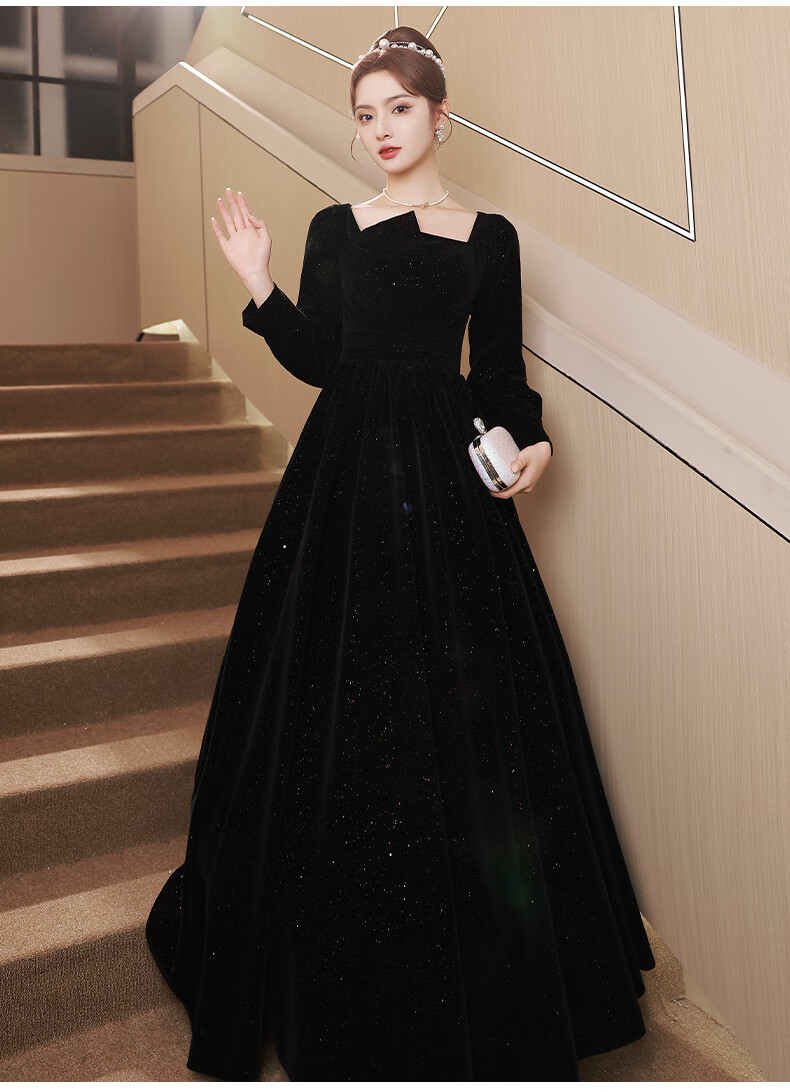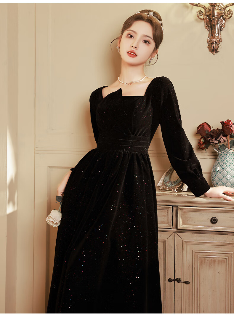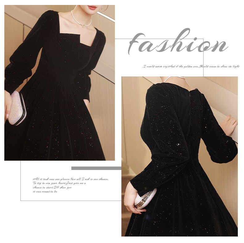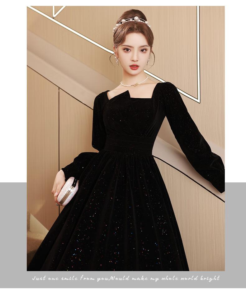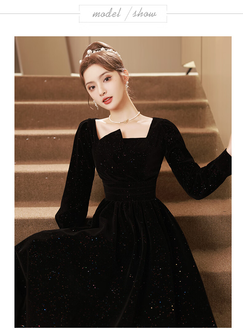 Libaixin black long-sleeved evening dress female celebrity banquet annual meeting long dress host French adult ceremony art test dress autumn and winter blue 2XL recommended 122-128Jin Jin equals 0.5 kg