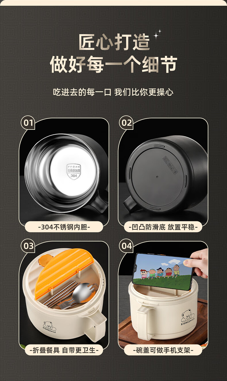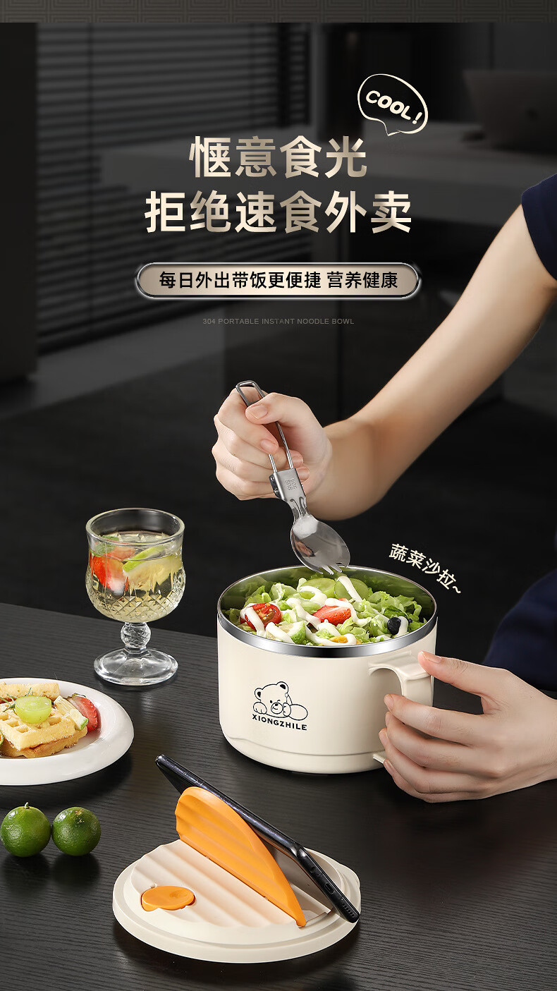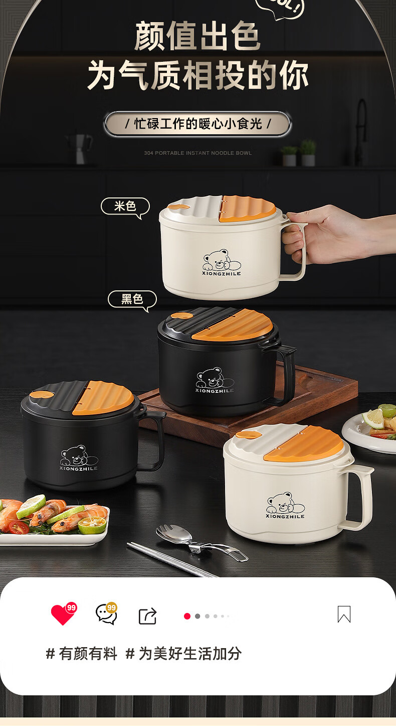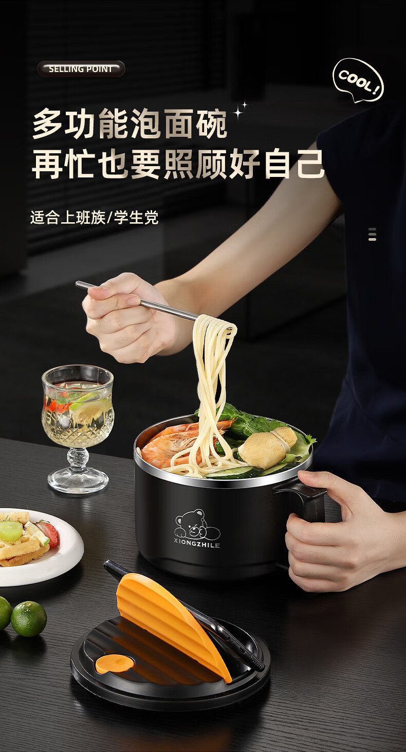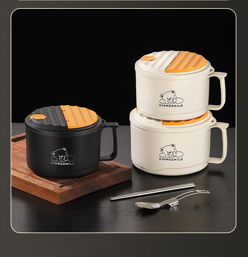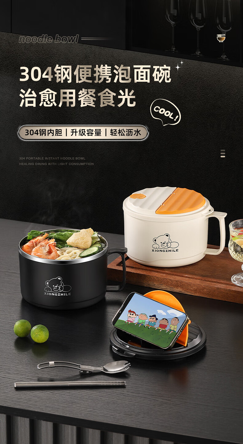 Shumi ins style 304 stainless steel instant noodle bowl with lid, drainable, student lunch box, dormitory large capacity instant noodle bowl, easy to wash 304 JG black 1700 with lid, with stainless steel folding tableware