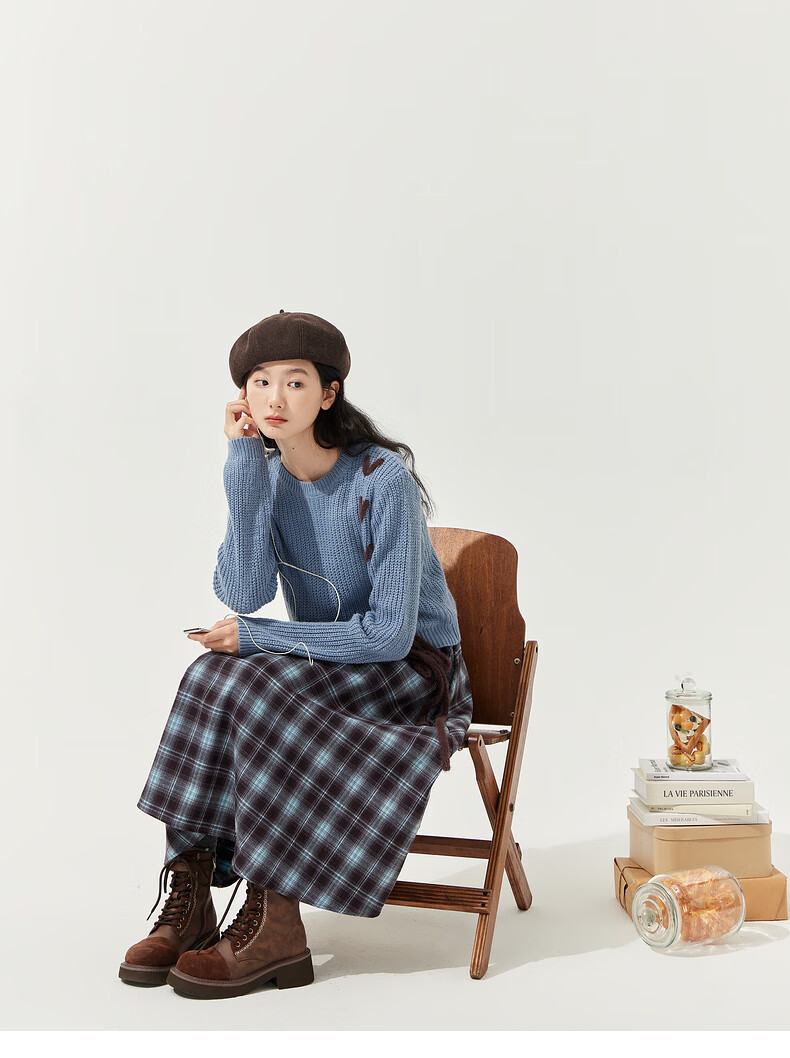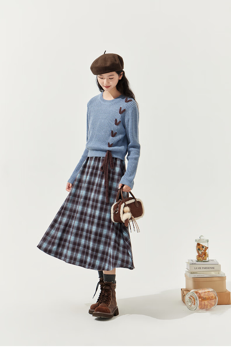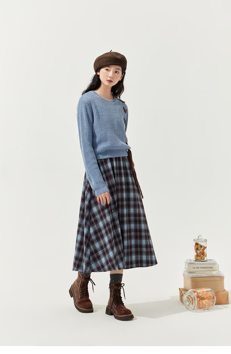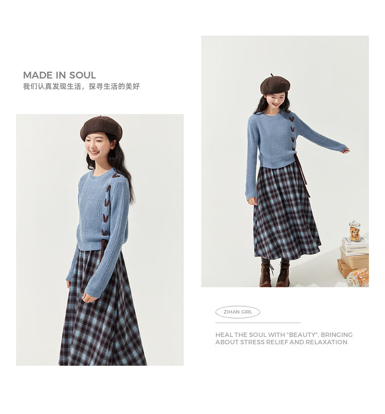 Zihan (ZIHAN) Zihan blue plaid suspender dress wool pullover sweater two-piece suit for women 2025 winter new style blue plaid M