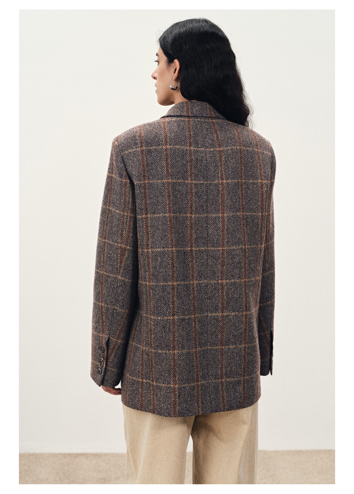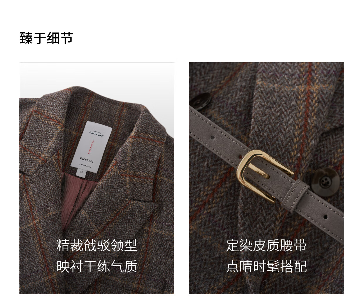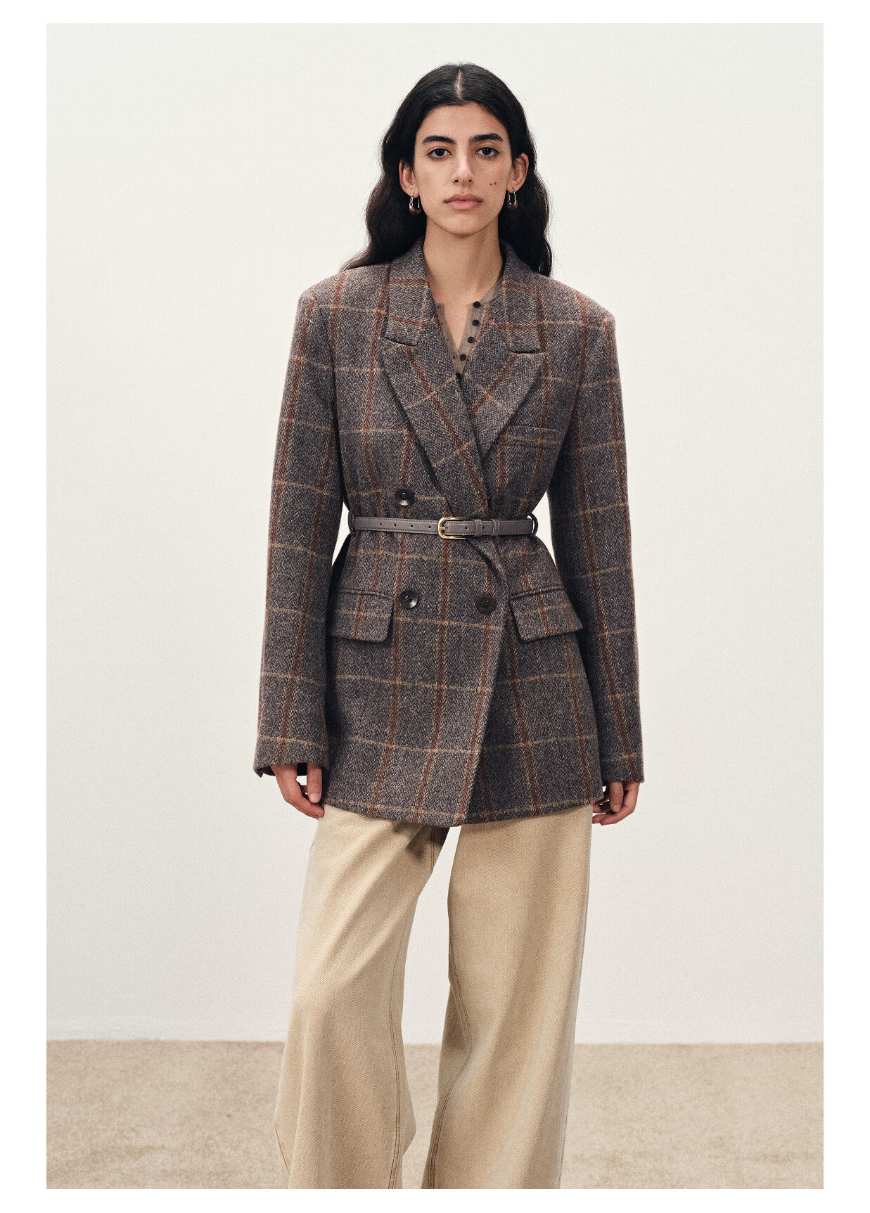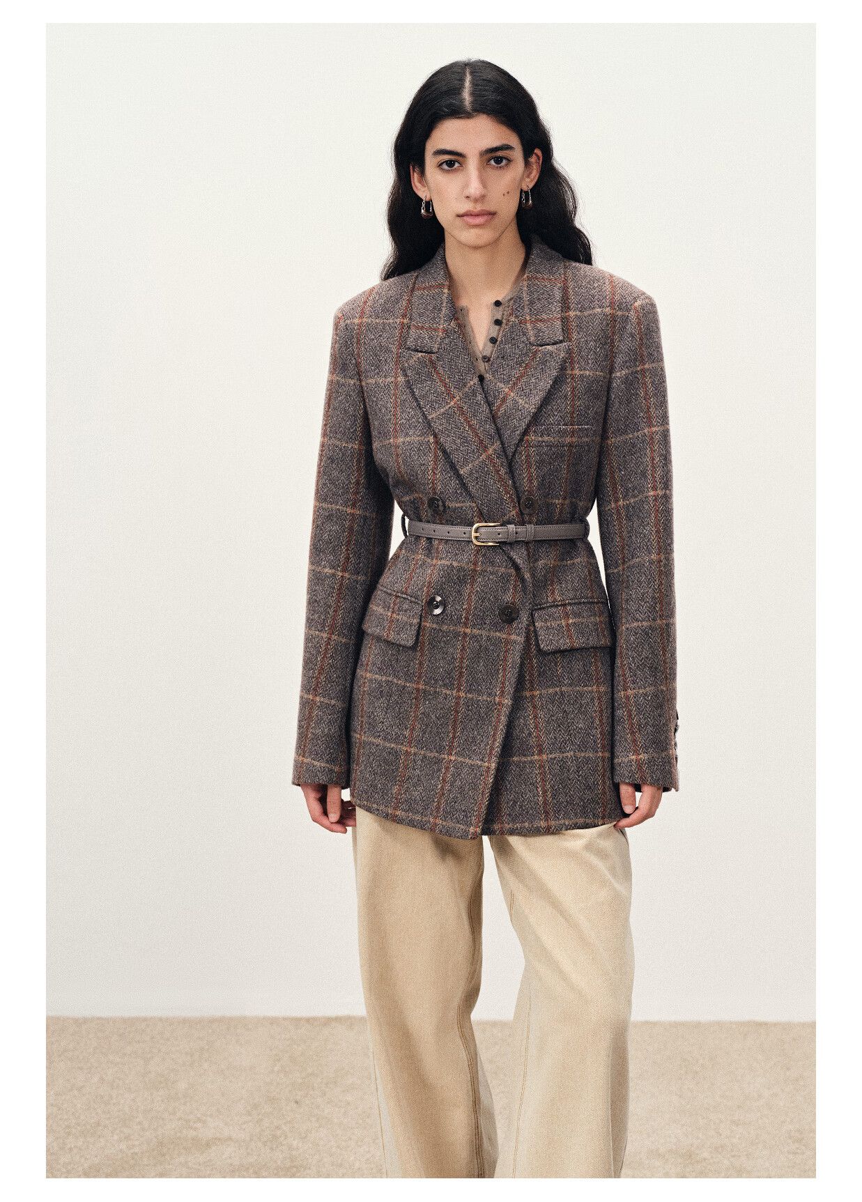 Fabrique retro plaid belted lapel collar wool blazer Plaid XS