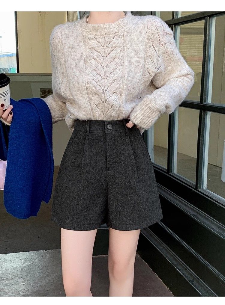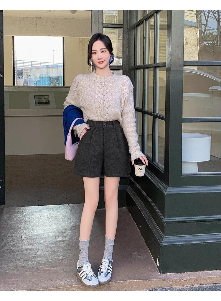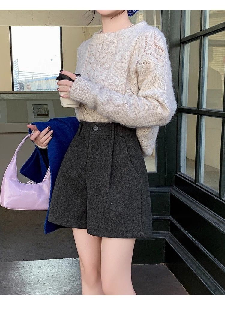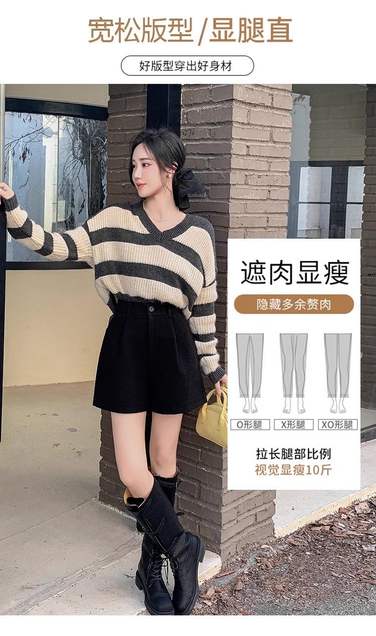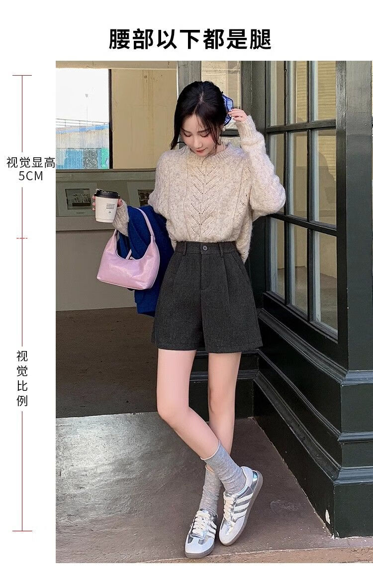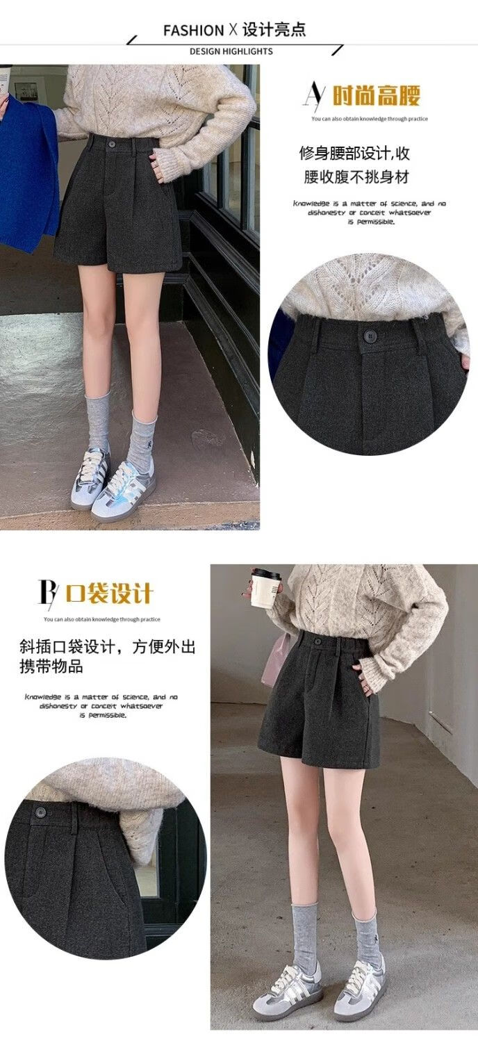 Korean style woolen shorts for women 2025 autumn and winter high-waisted hip-covering wide-leg pants for small people A-line Martin boot pants M01 black without belt M recommended 95-105Jin Jin equals 0.5 kg