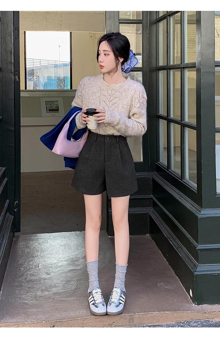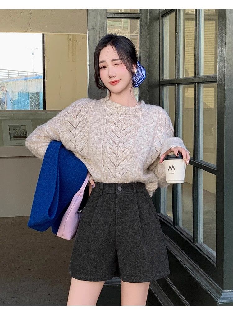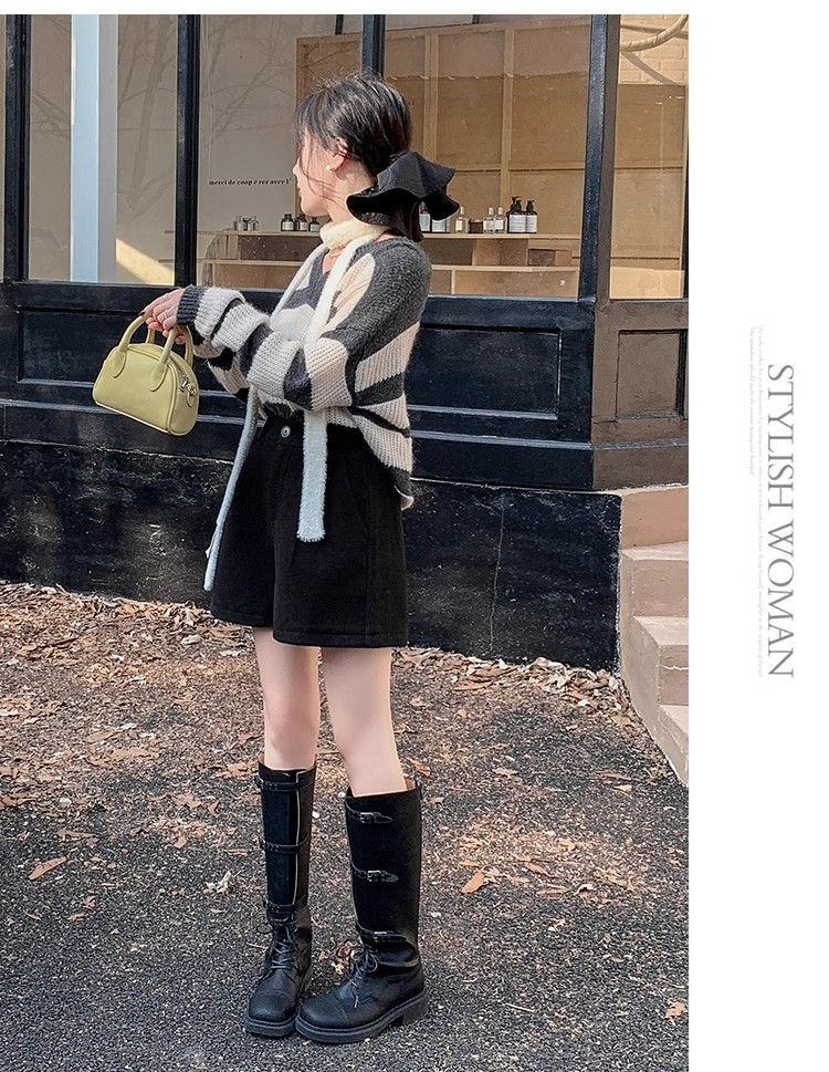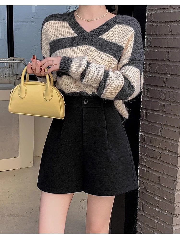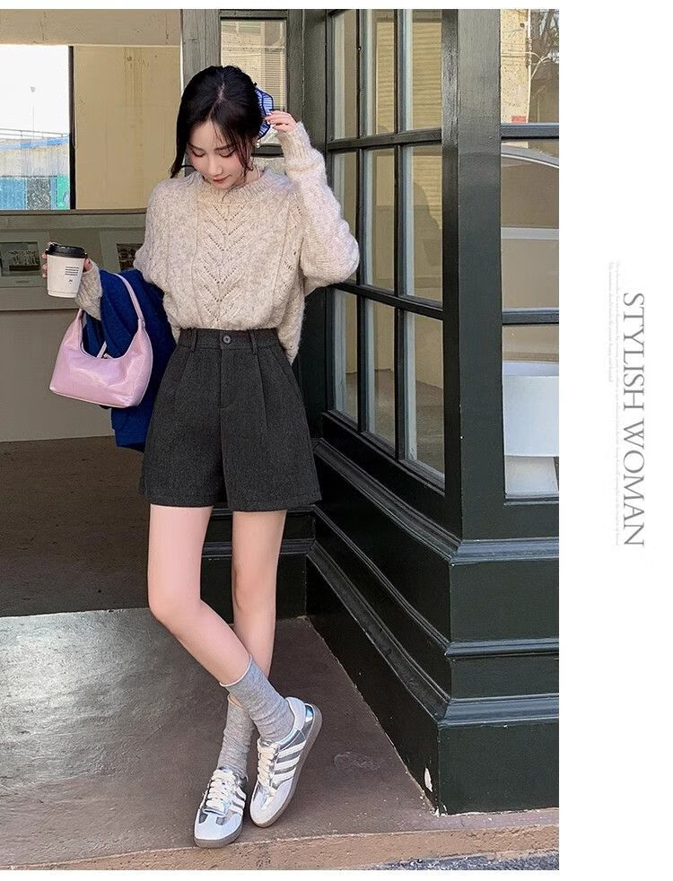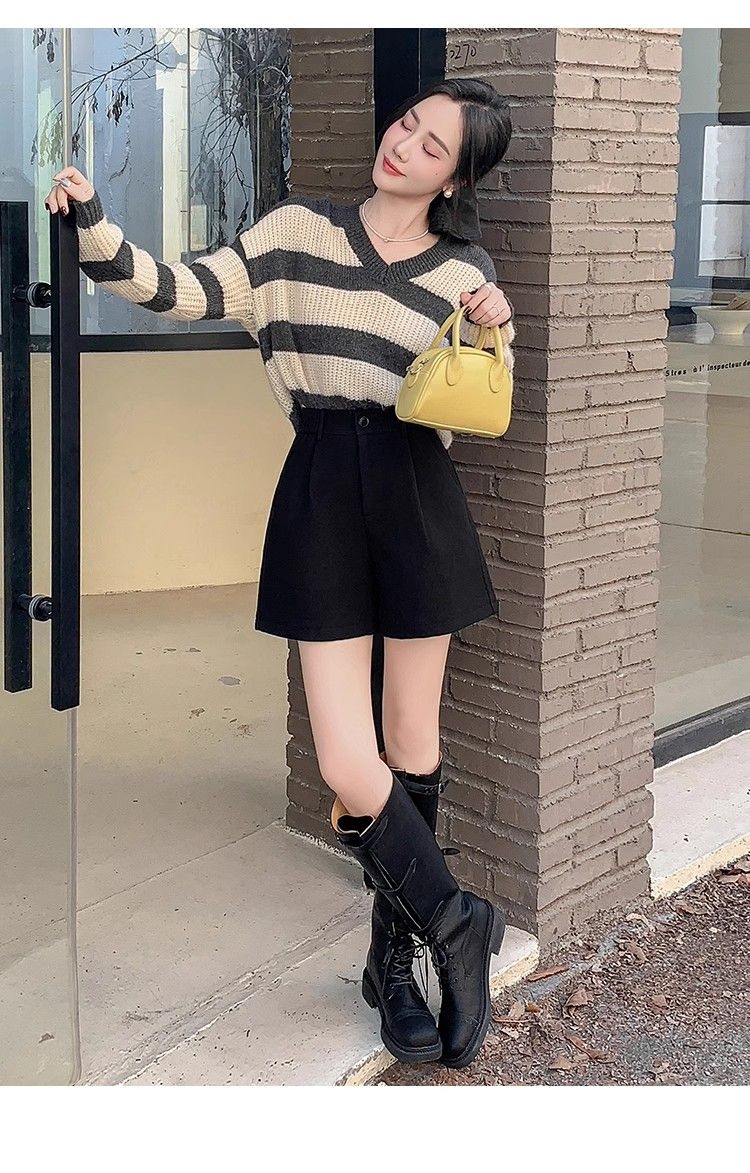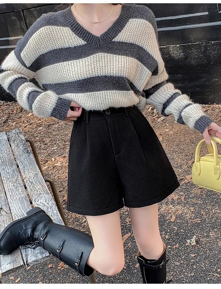 Korean style woolen shorts for women 2025 autumn and winter high-waisted hip-covering wide-leg pants for small people A-line Martin boot pants M01 black without belt M recommended 95-105Jin Jin equals 0.5 kg