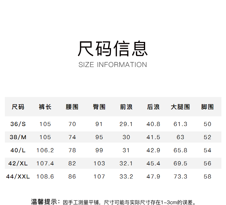 Outseam (cm) 99 cm 101.5 cm 104 cm 106.5 cm 109 cm