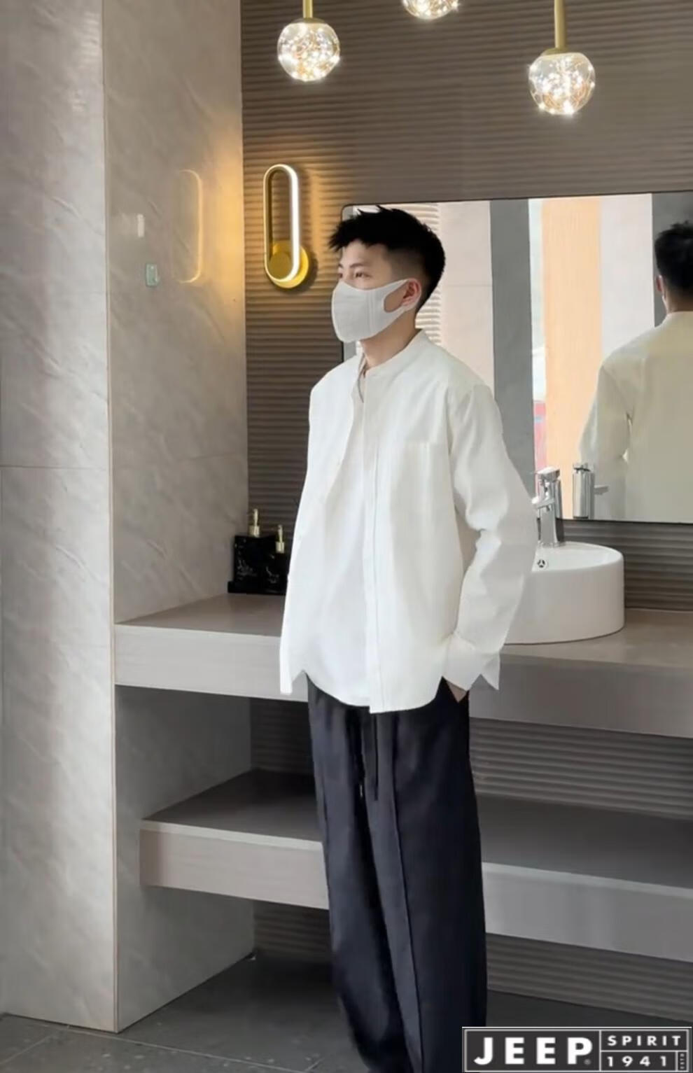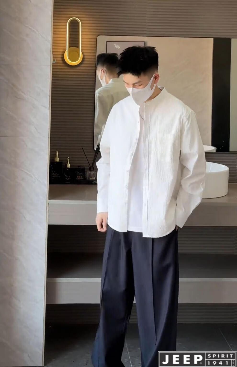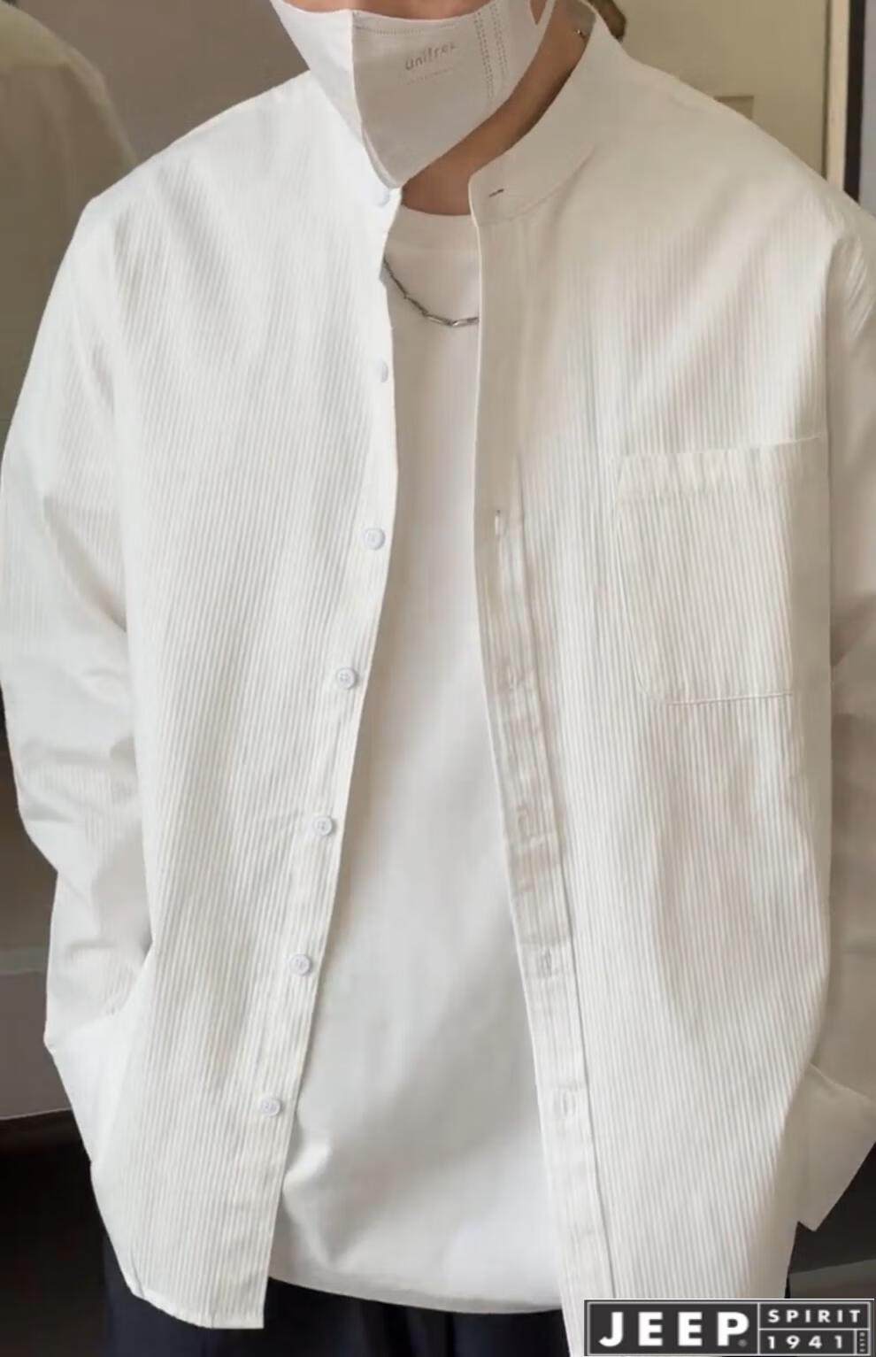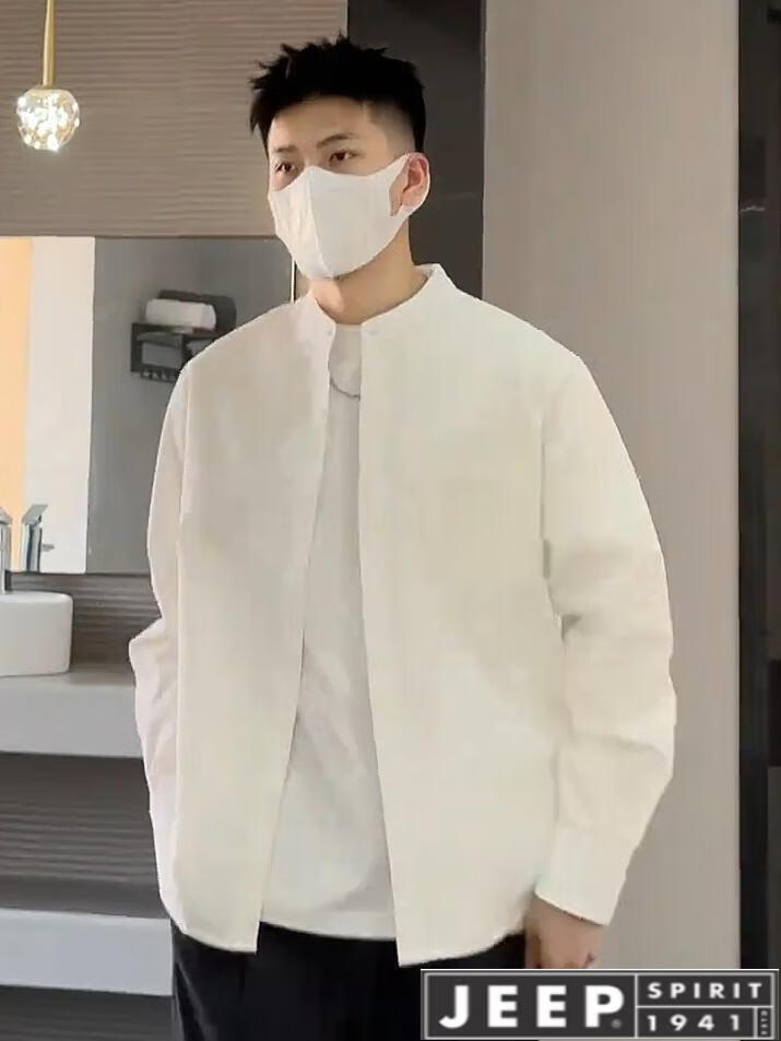 JEEP2025 Spring and Autumn Simple Henry Collar Casual Shirt Men's Fashion Old Money Style Loose Versatile Textured Long-Sleeved Top White M 100-130Jin Jin is equal to 0.5 kg