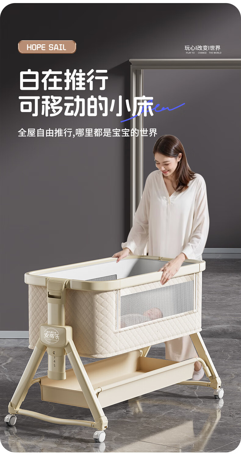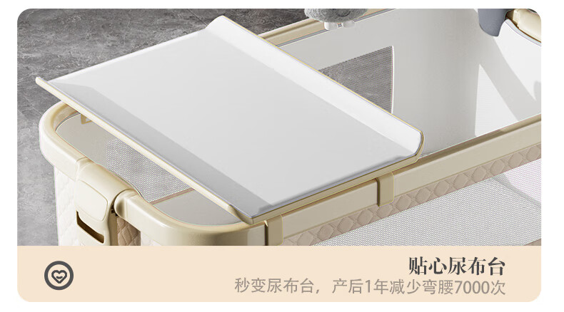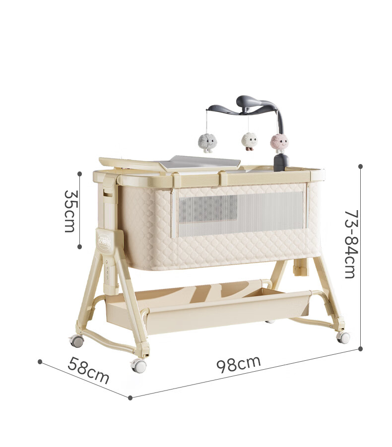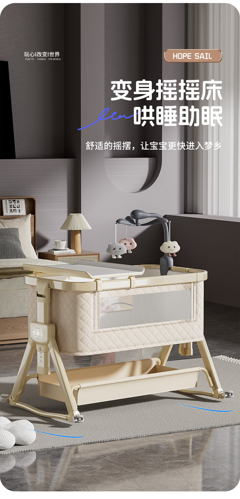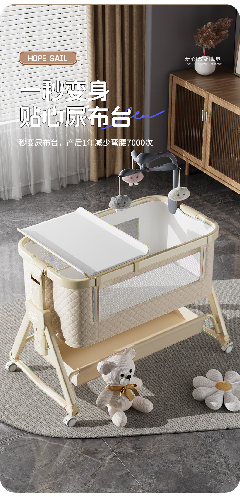 Antile crib multi-functional foldable and splicable 0-3 year old baby rocking bed with changing table Morandi white 4.8CM latex coconut palm pad + mosquito net changing table + bed bell multi-functional crib baby rocking bed spliced large bed