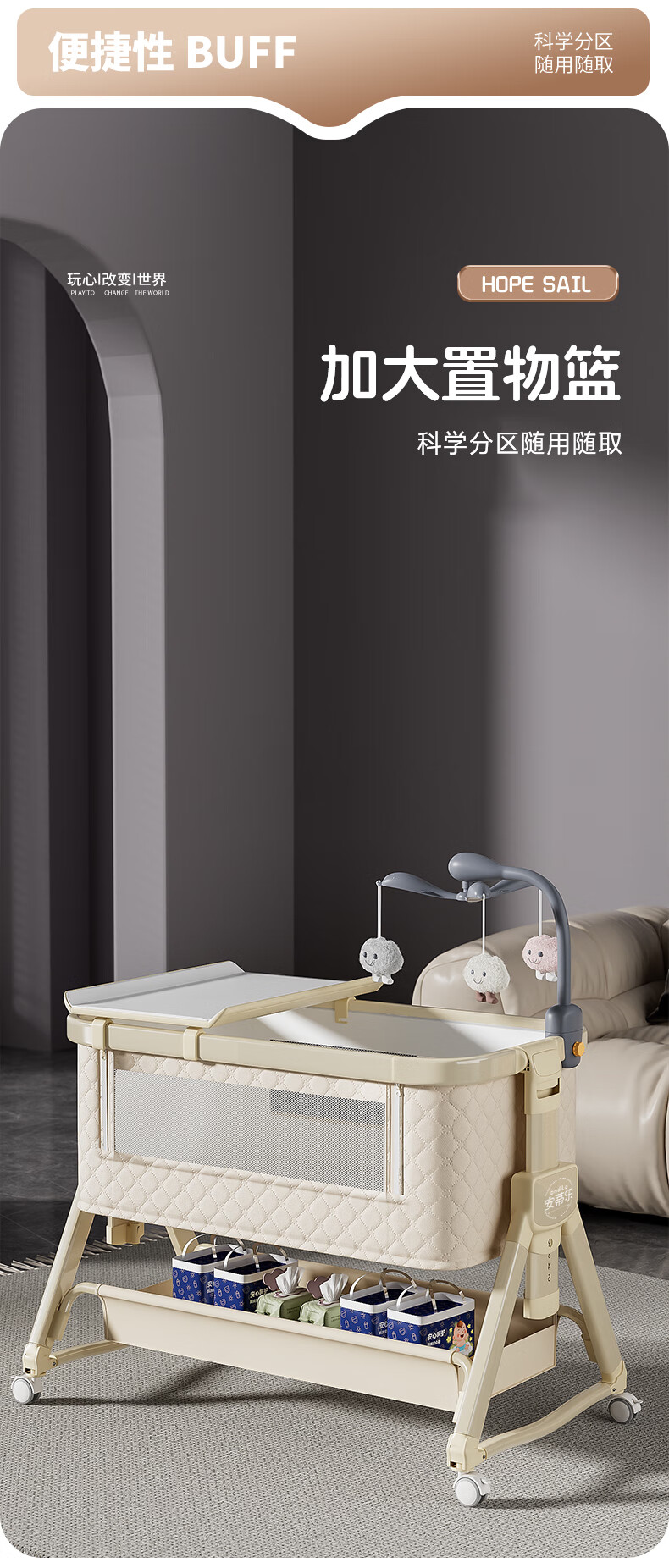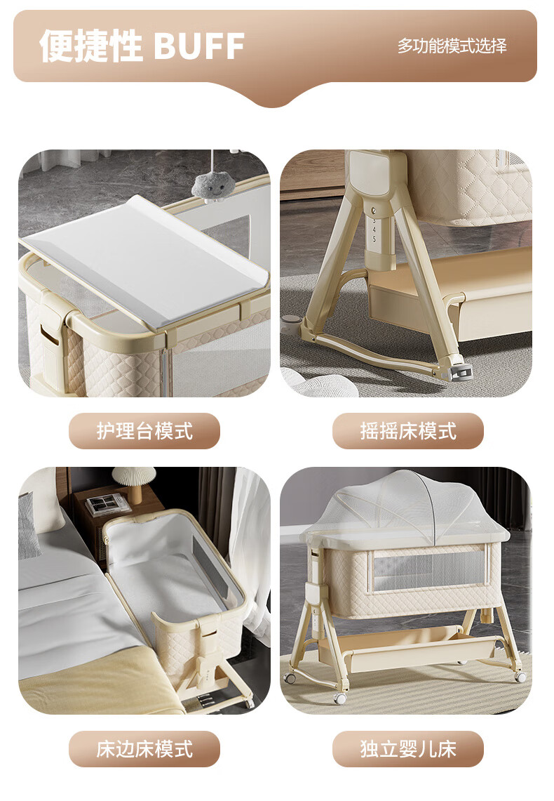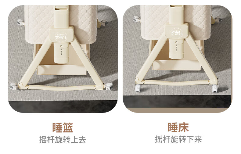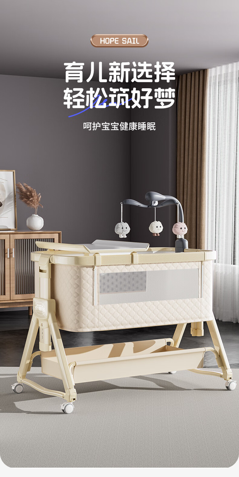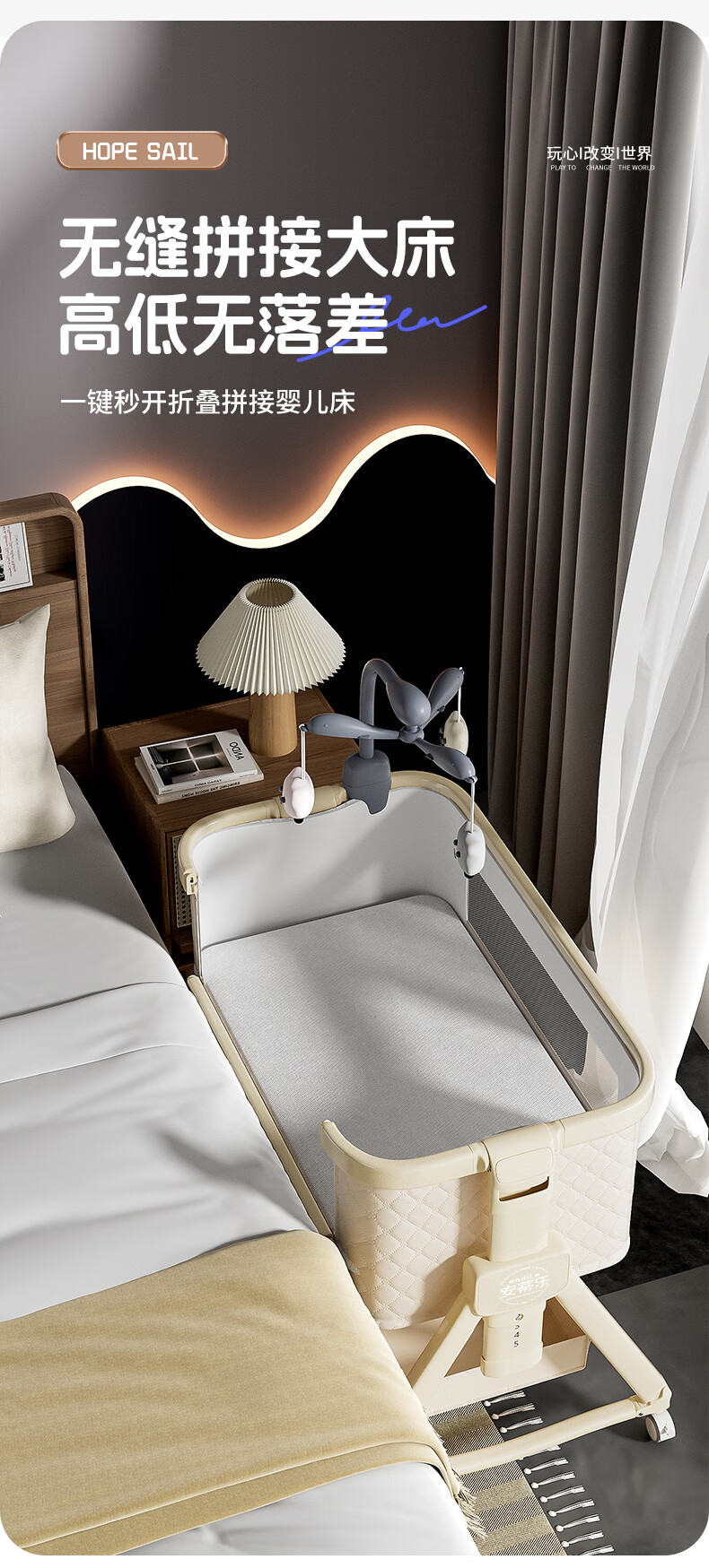 Antile crib multi-functional foldable and splicable 0-3 year old baby rocking bed with changing table Morandi white 4.8CM latex coconut palm pad + mosquito net changing table + bed bell multi-functional crib baby rocking bed spliced large bed