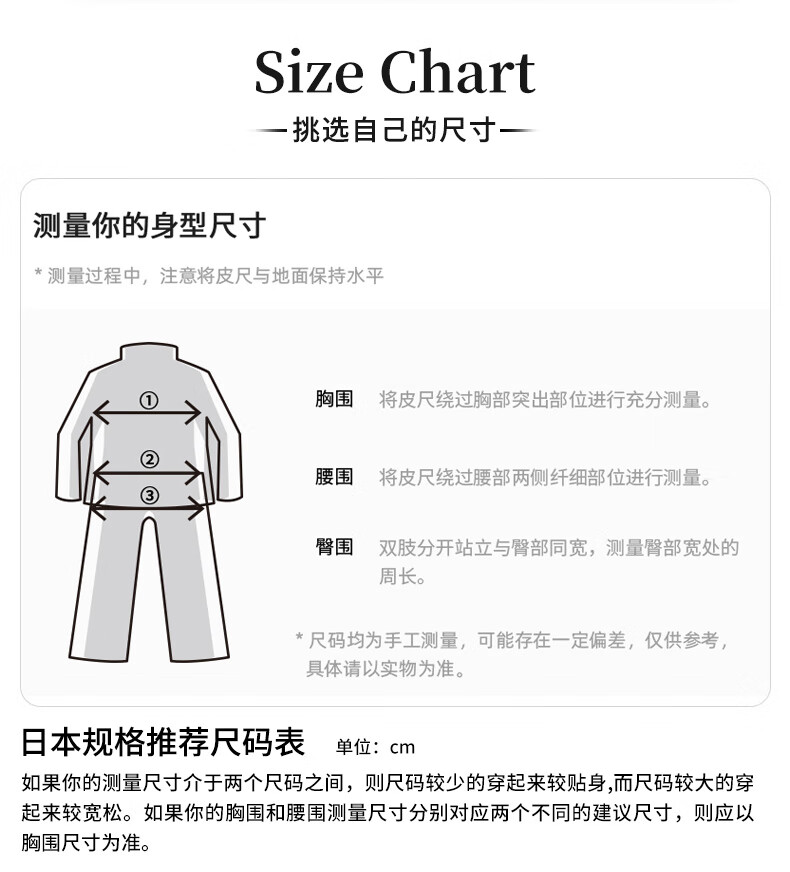 China (cm) 165 / 88-90 170 / 96-98 175 / 108-110 180 / 118-122 185 / 126-130