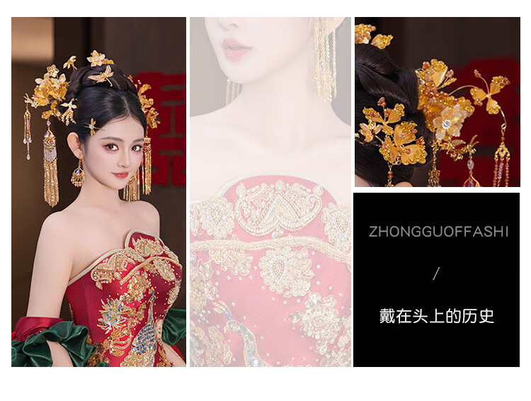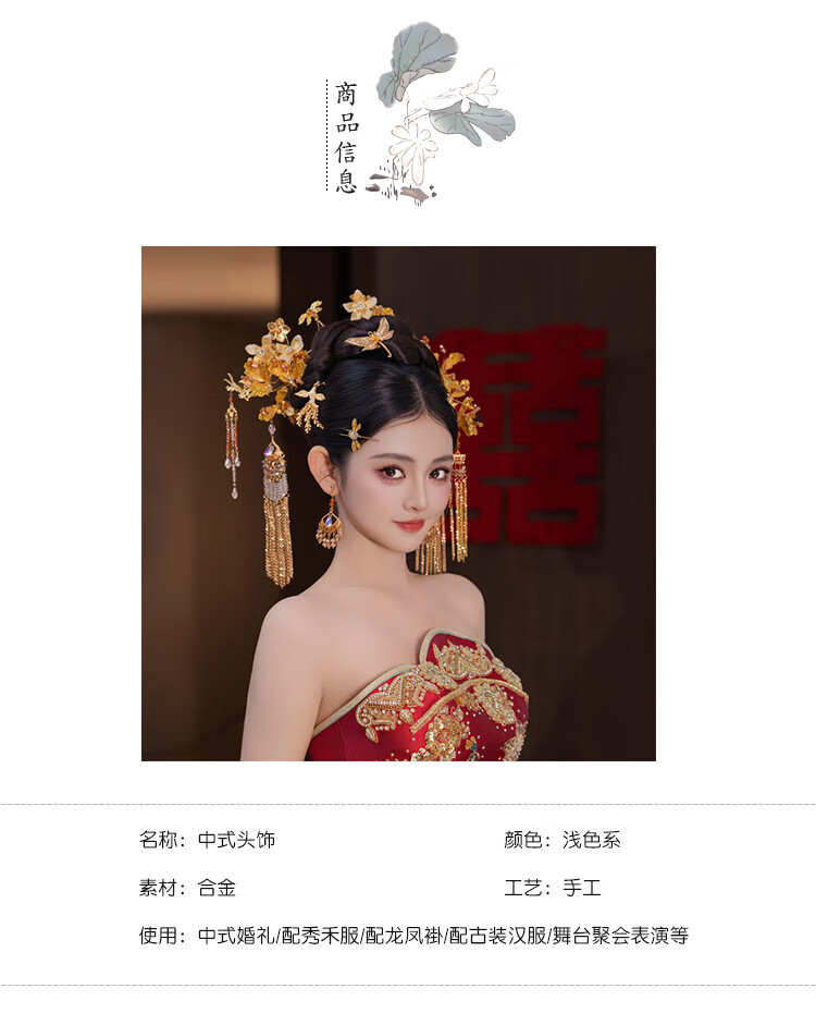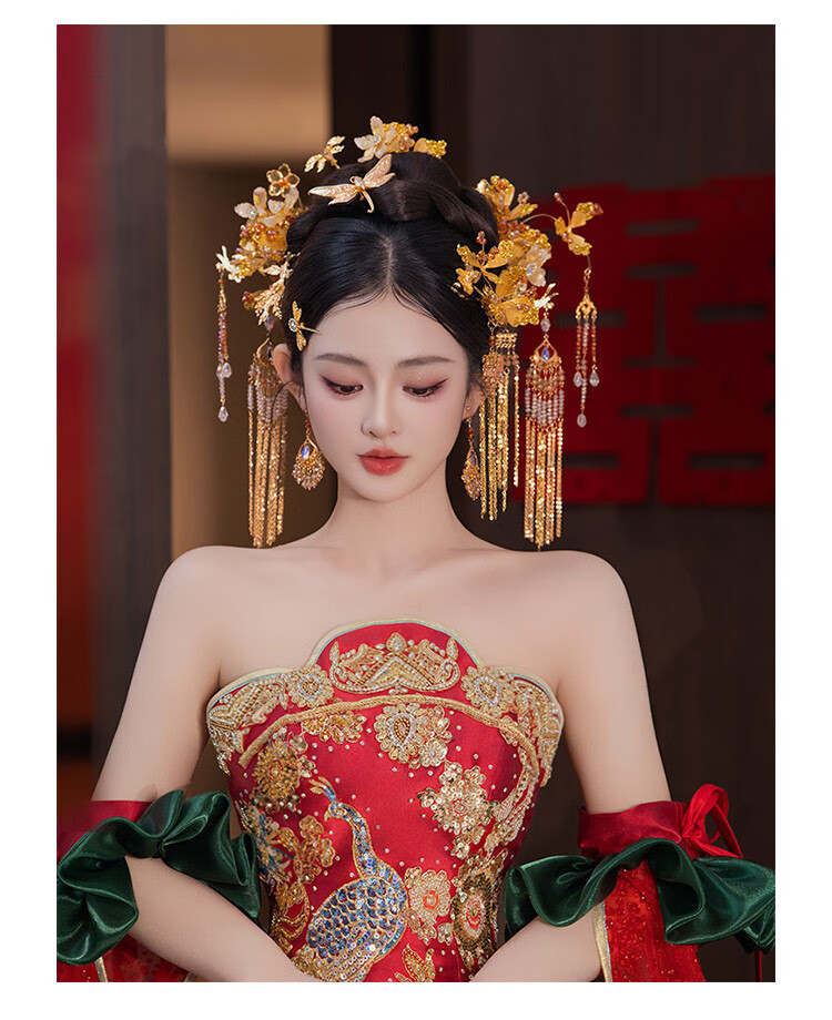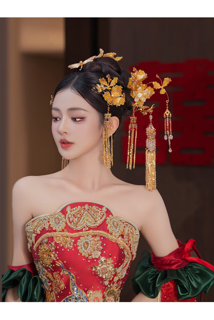 DUALMELLA bridal Chinese Xiuhe dress golden headdress flower tassel hairpin classical dragonfly new dragon and phoenix gown knot headdress set G0196