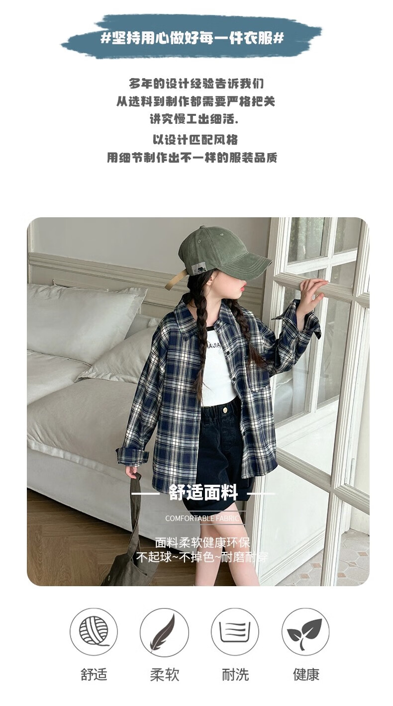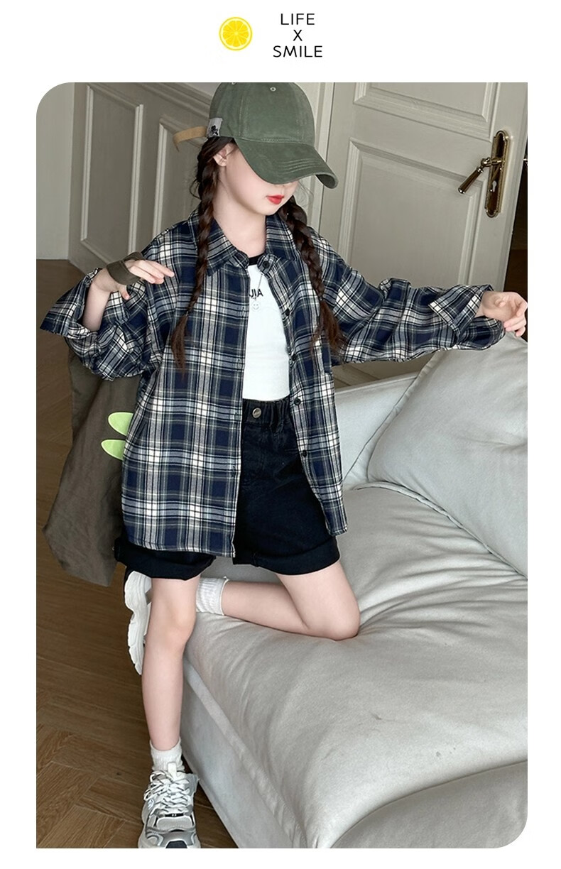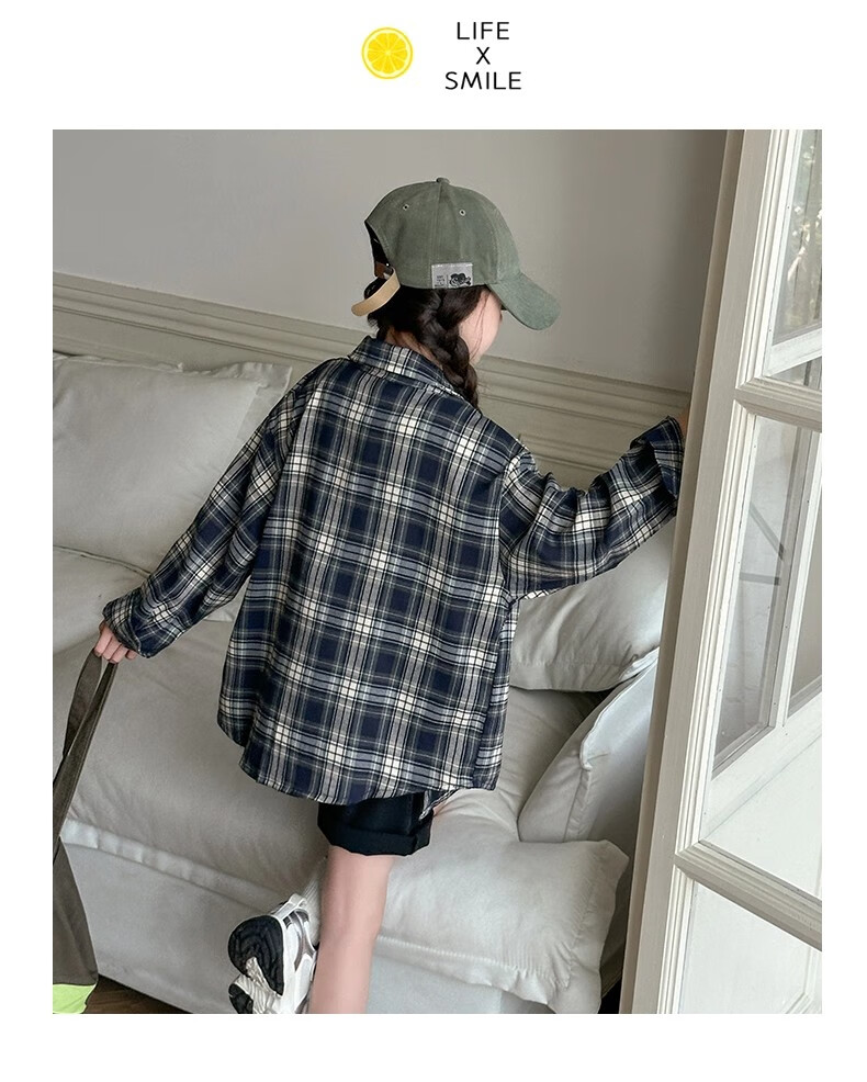 Girls' plaid shirt, spring and autumn, Korean style lazy style long-sleeved coat for older children, autumn children's fashionable shirt, autumn wear, navy 150