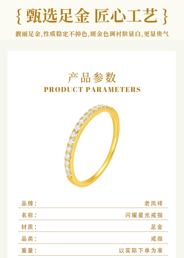 Lao Fengxiang Gold Sparkling Starlight Ring Women's Pure Gold Versatile Ring Bracelet Valentine's Day Birthday Gift for Girlfriend and Wife Sparkling Starlight Ring Circle No. 13 Approximately 0.8g