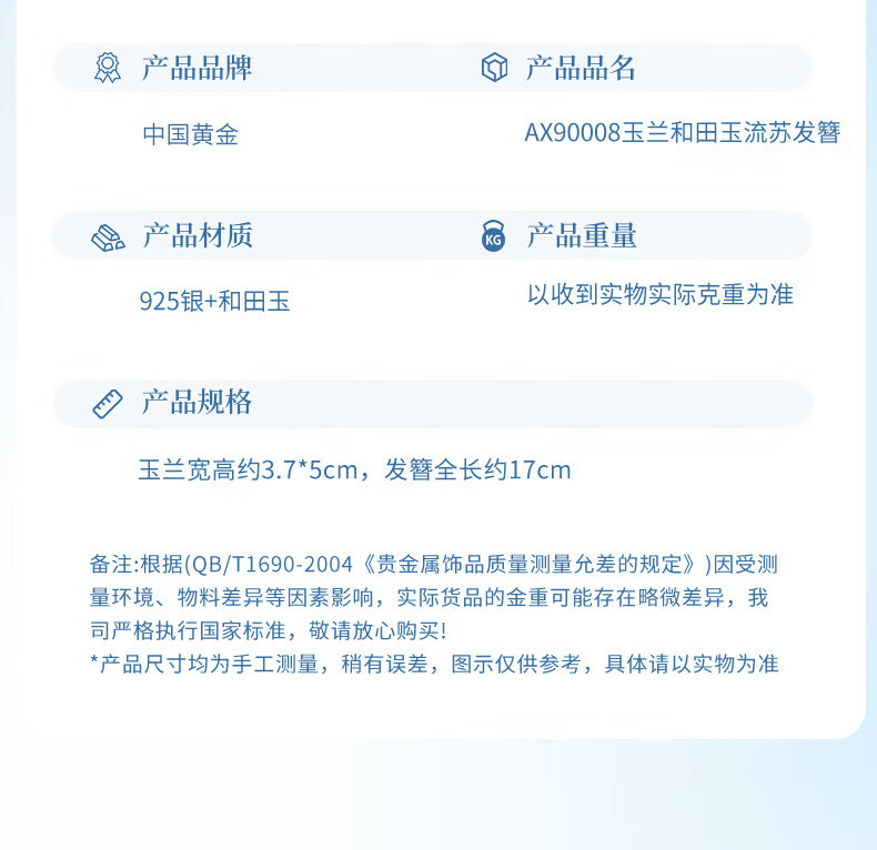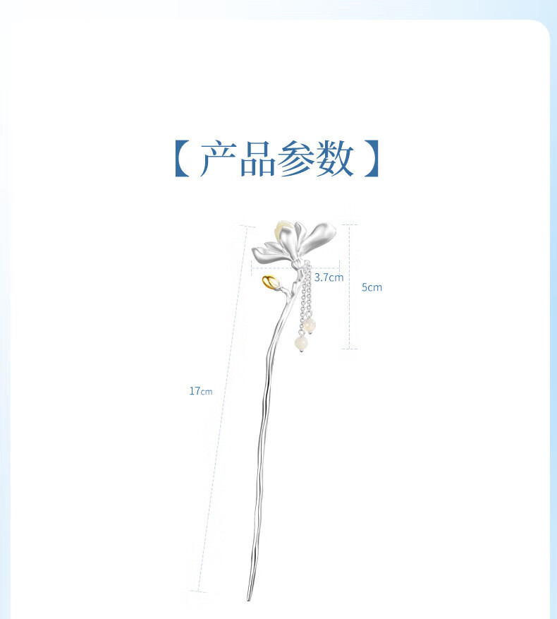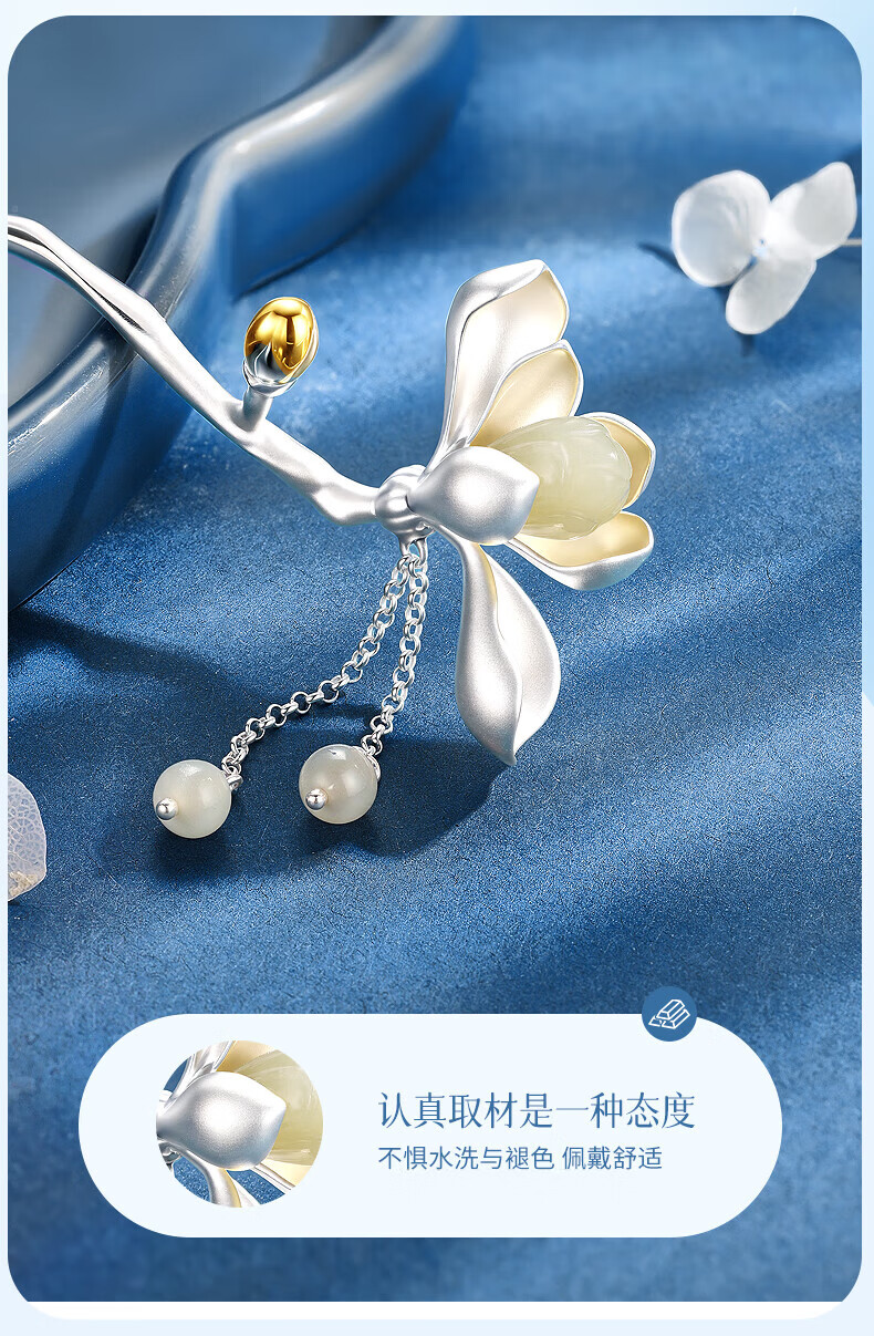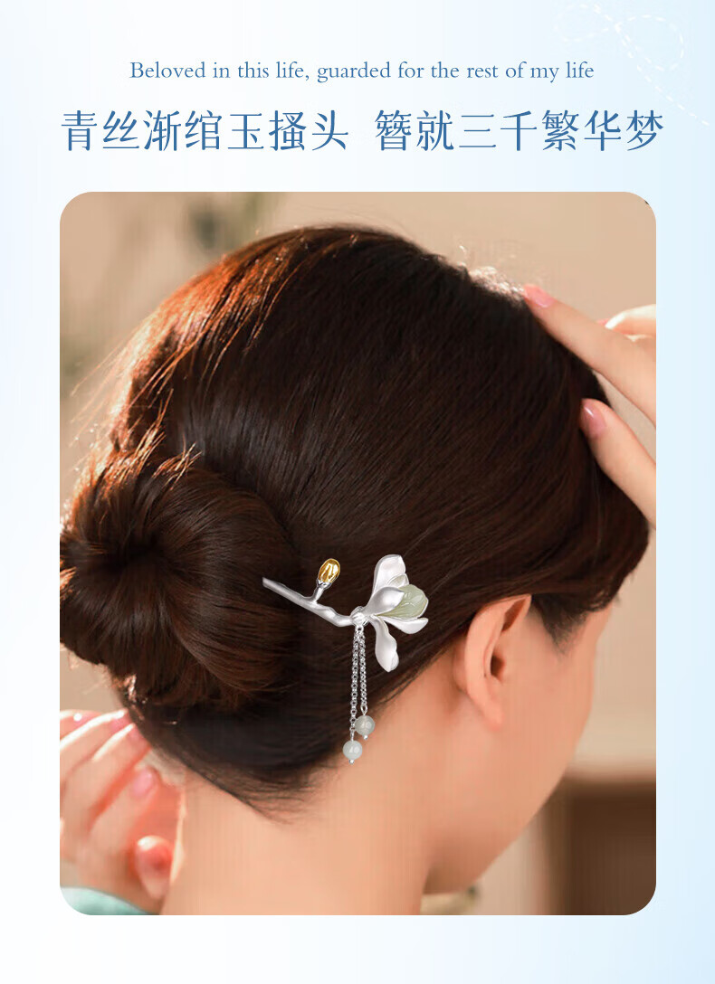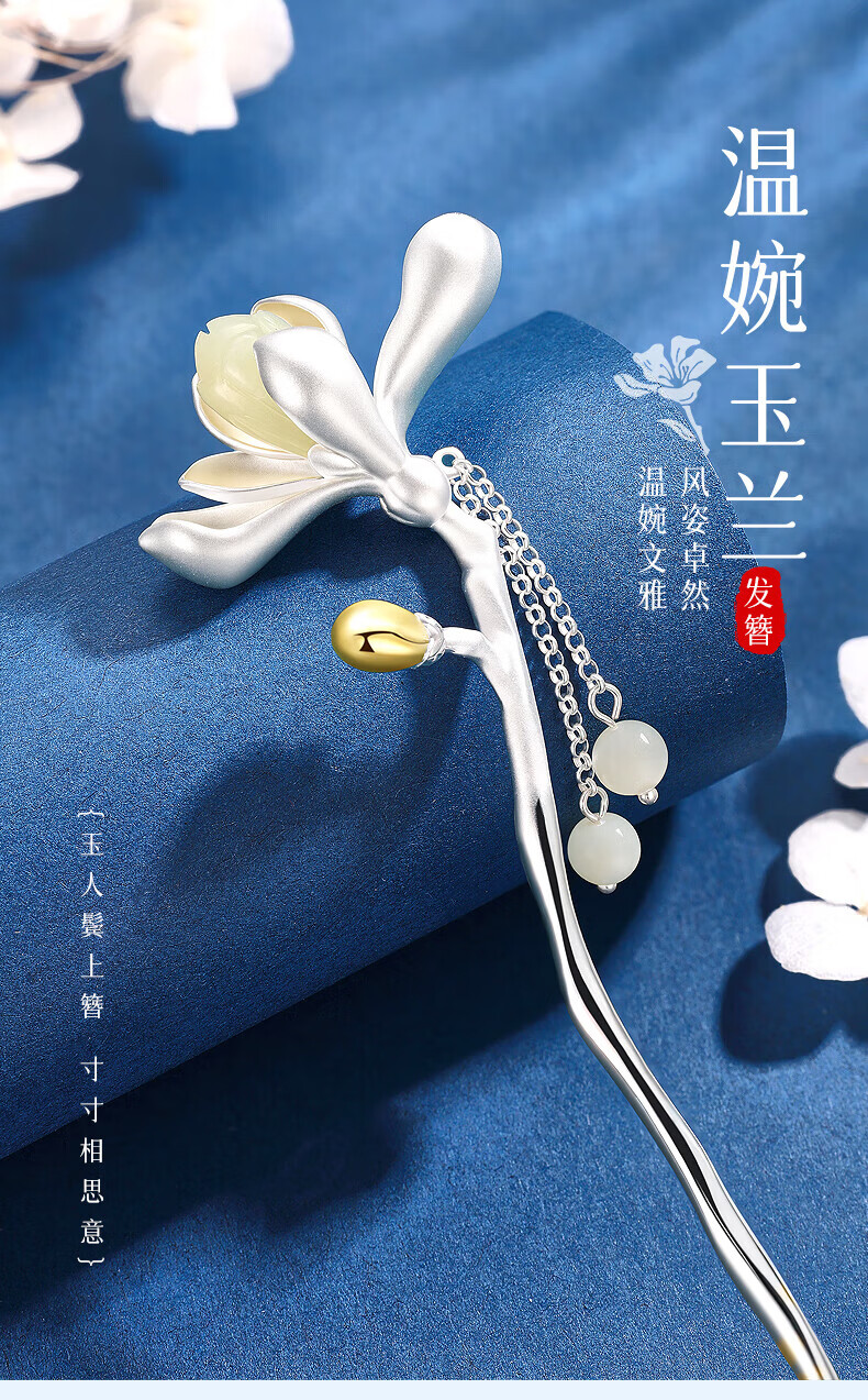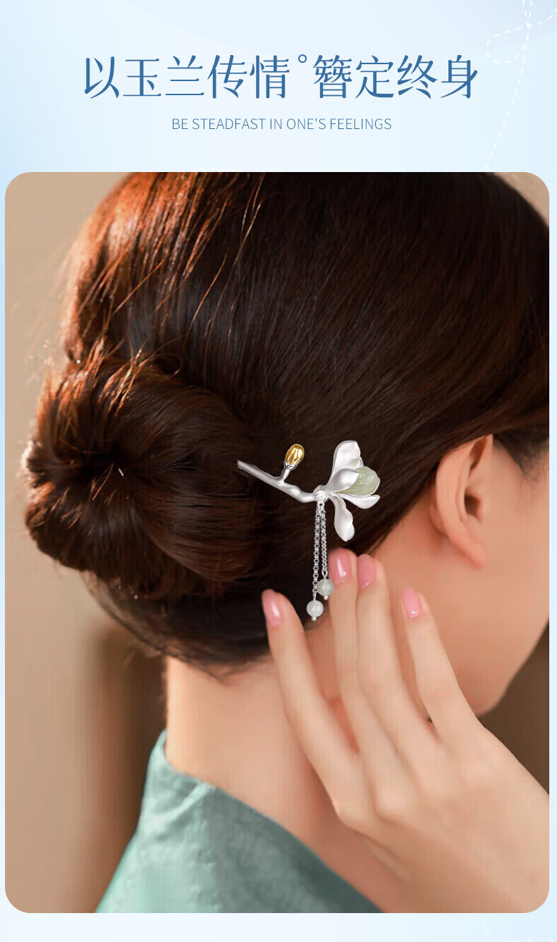 China Gold (CHINA GOLD) Magnolia Hairpin Women's New Chinese Style Ancient Style Silver Hairpin Hair Accessory Birthday Gift for Girlfriend and Wife to Commemorate High-level Magnolia and Hetian Jade Tassel Hairpin