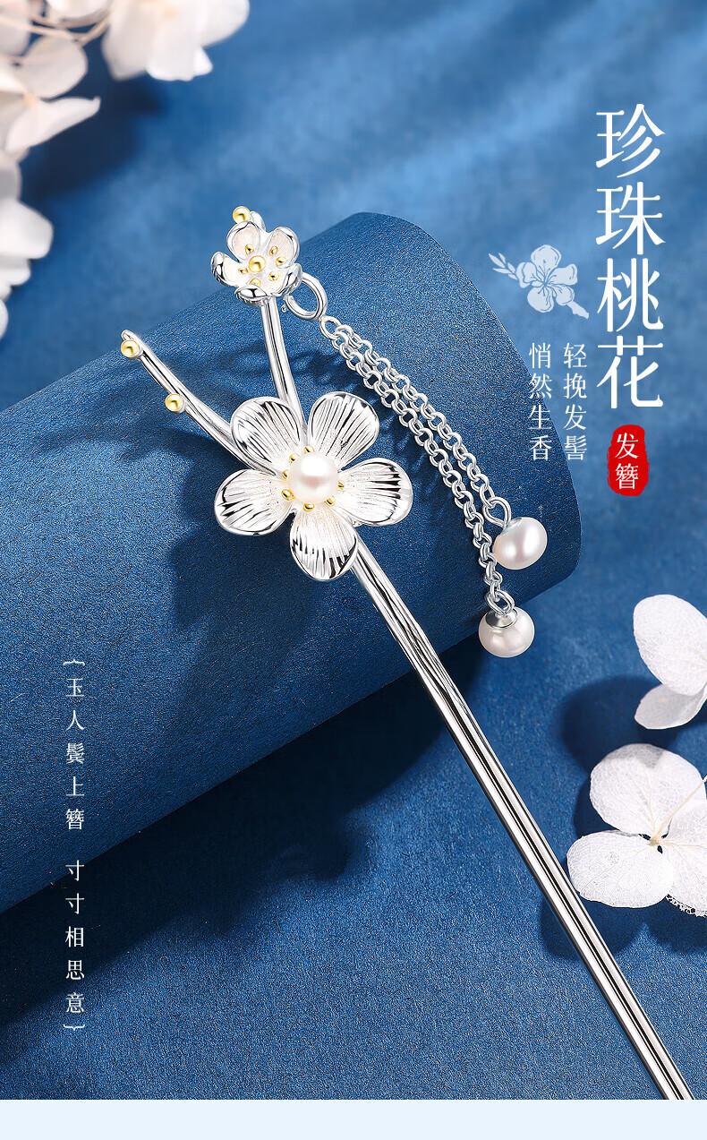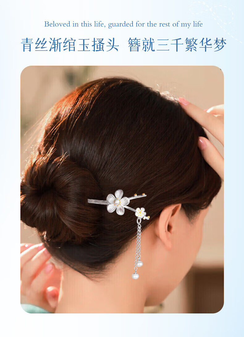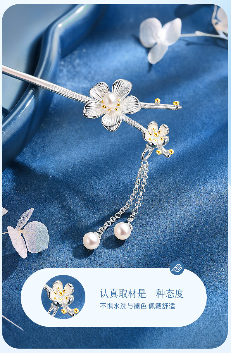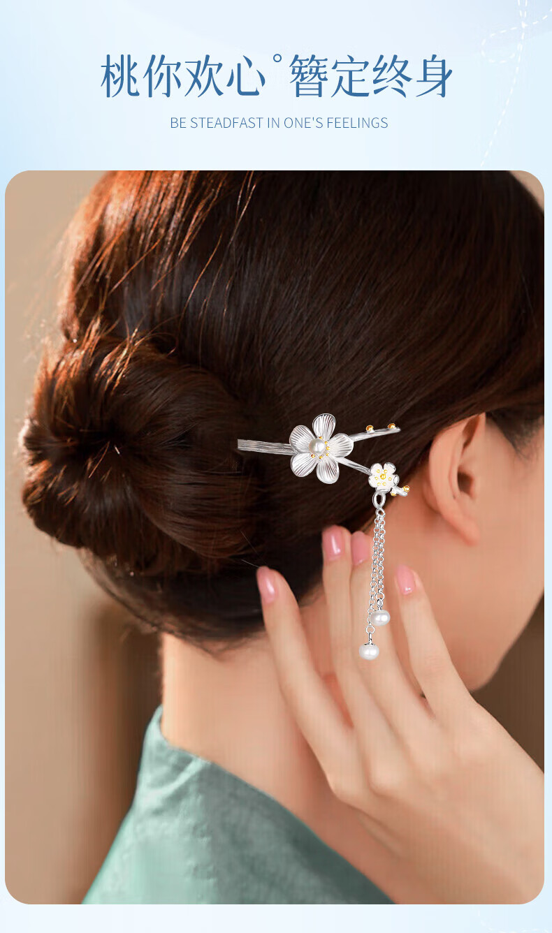 China Gold (CHINA GOLD) Pearl Hairpin Women's New Chinese Style Ancient Style Silver Hairpin Hair Accessory Birthday Gift for Girlfriend and Wife to Commemorate High-end Pearl Butterfly Peach Blossom Branch Tassel Hairpin