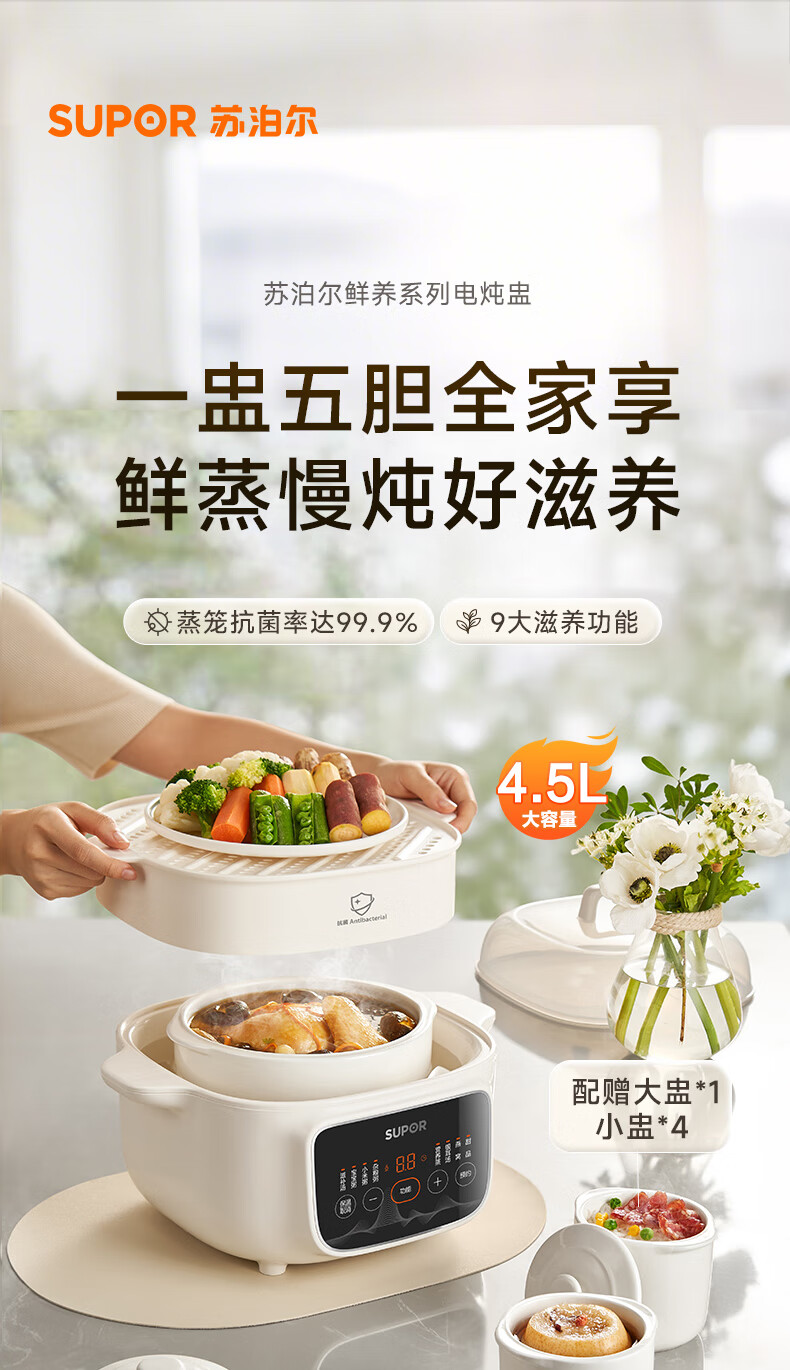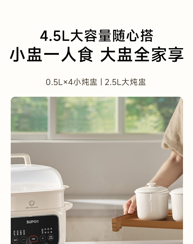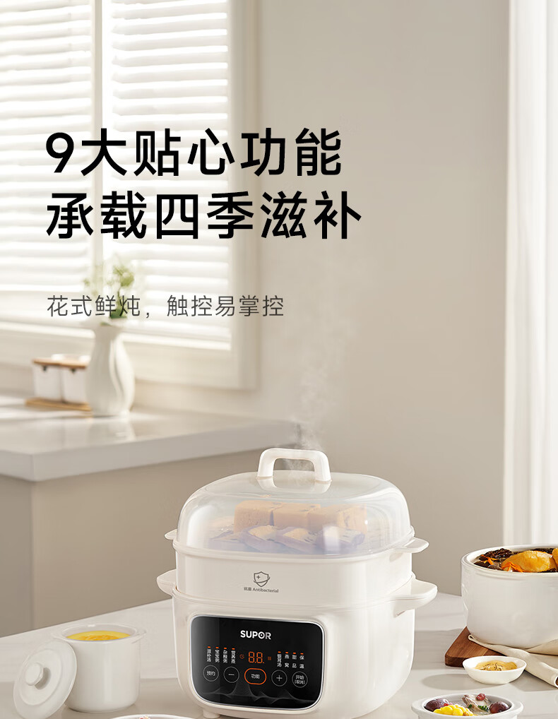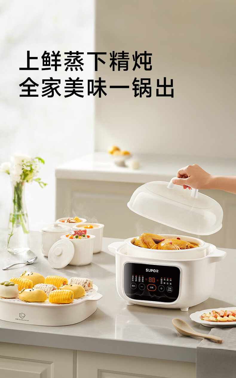 SUPOR electric stew pot, household 2.5L electric stew pot, water-proof electric stew pot, ceramic fully automatic soup stew all-in-one electric pot, stew and steaming all-in-one stew pot, electric steamer, five bladders in one pot, antibacterial steamer 2.5L