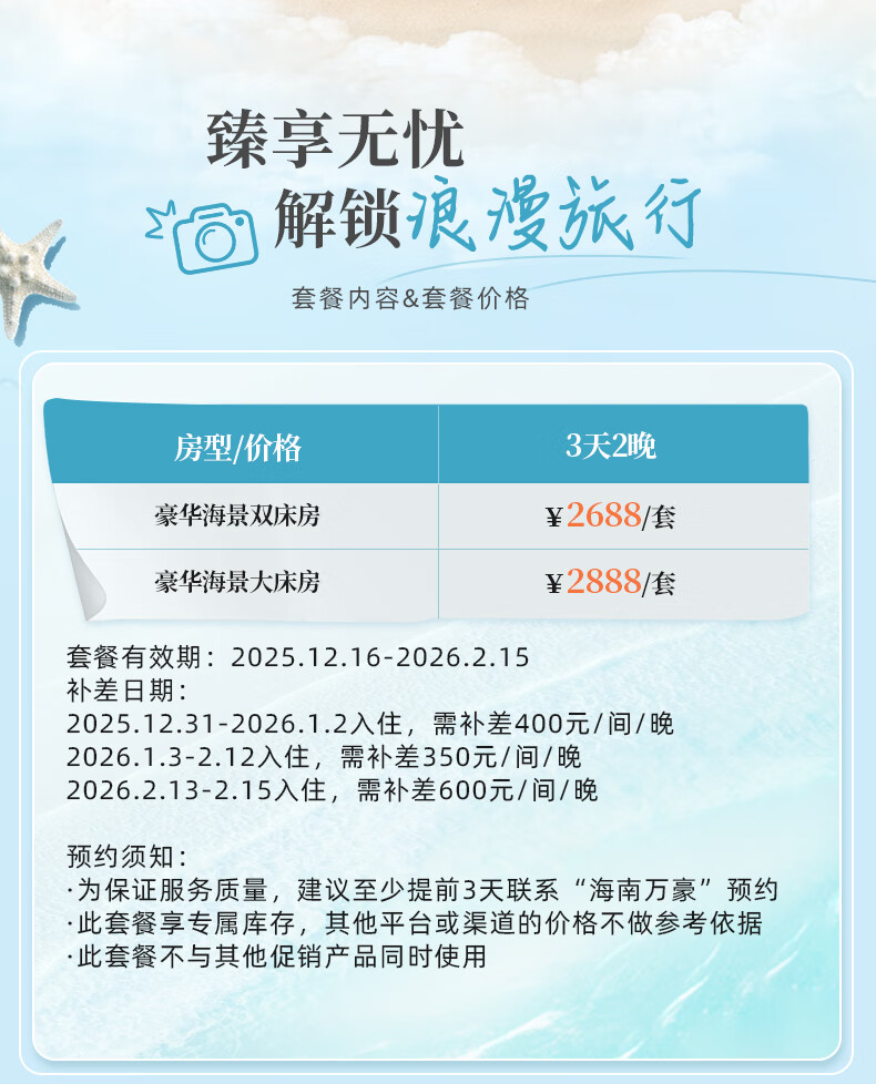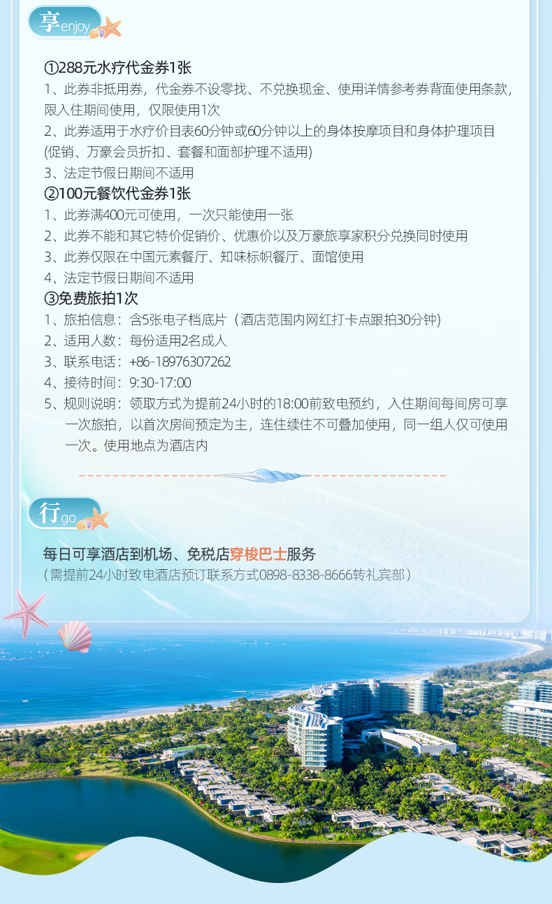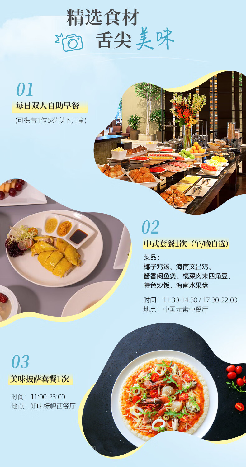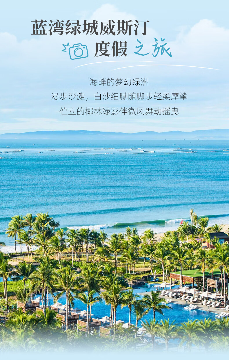 Breakfast and dinner included. Marriott Hainan Blue Bay Westin 2 nights in a Deluxe Sea View Room with breakfast and play package. 2 nights in a Deluxe Sea View Queen Room (including breakfast + 1 Chinese dinner + play)