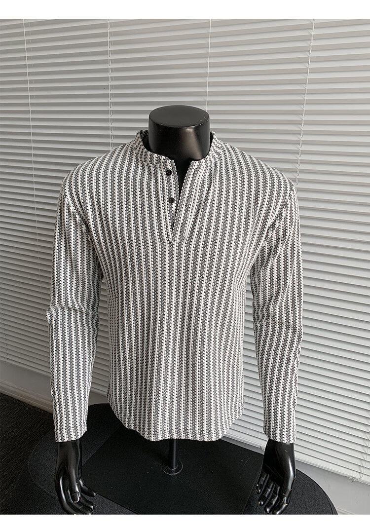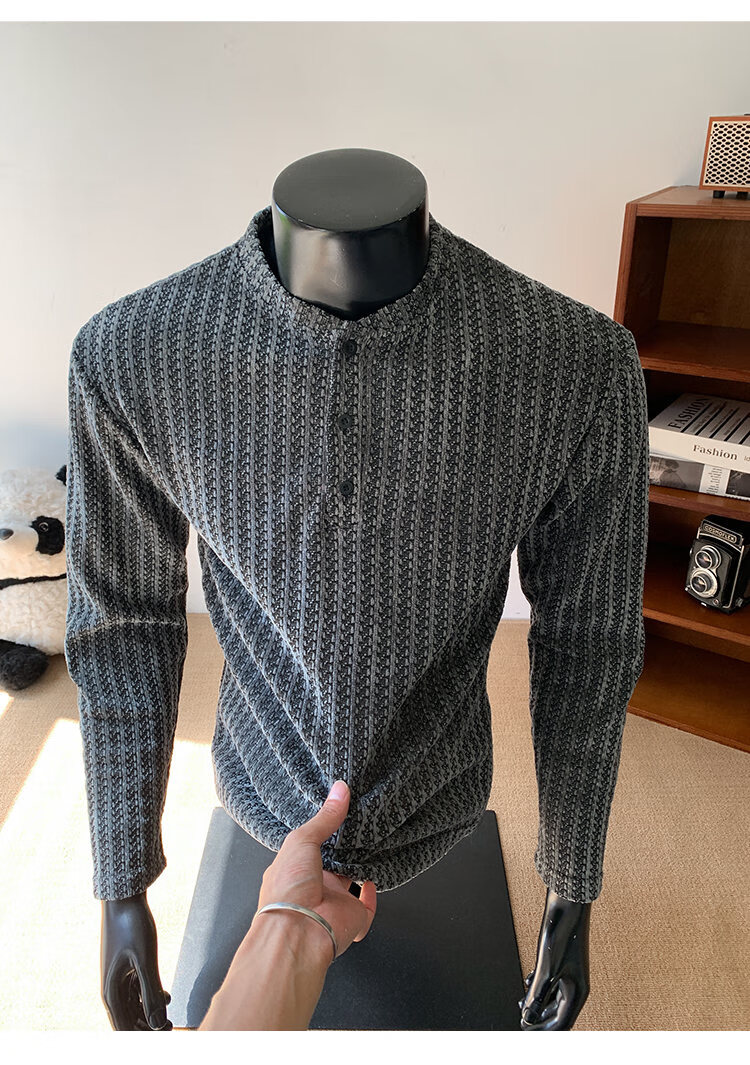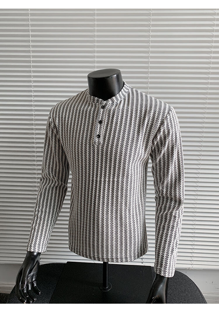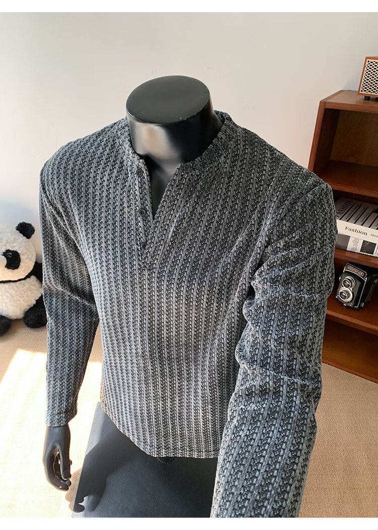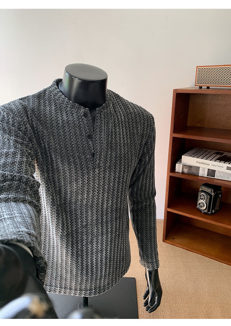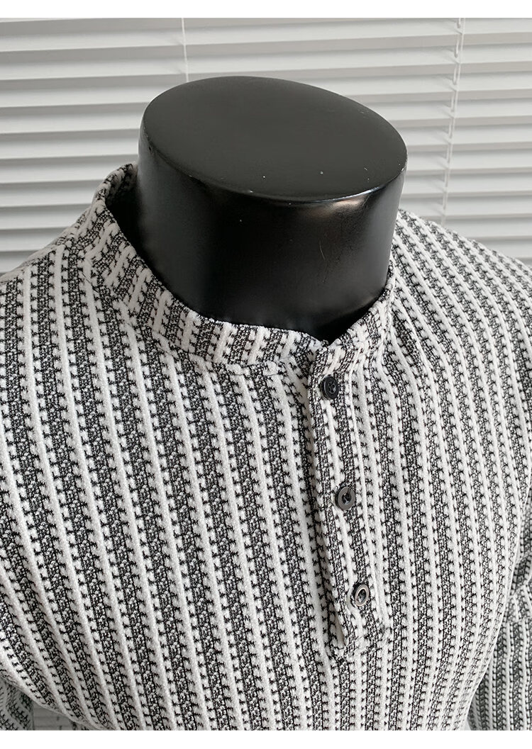 PUGESI American heavy henley shirt men's autumn black and white striped long-sleeved T-shirt herringbone pattern stand-up collar inner base sweatshirt gray 3XL