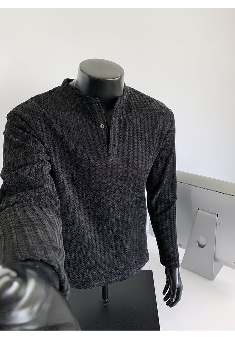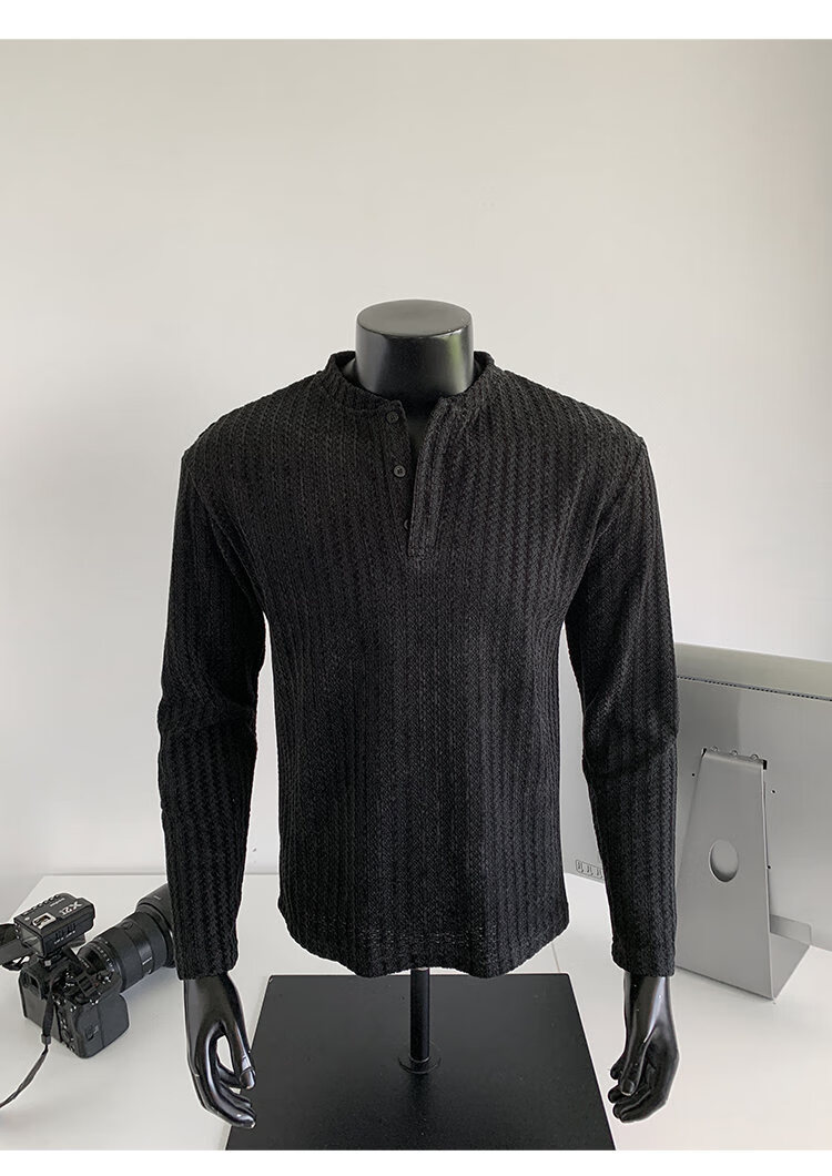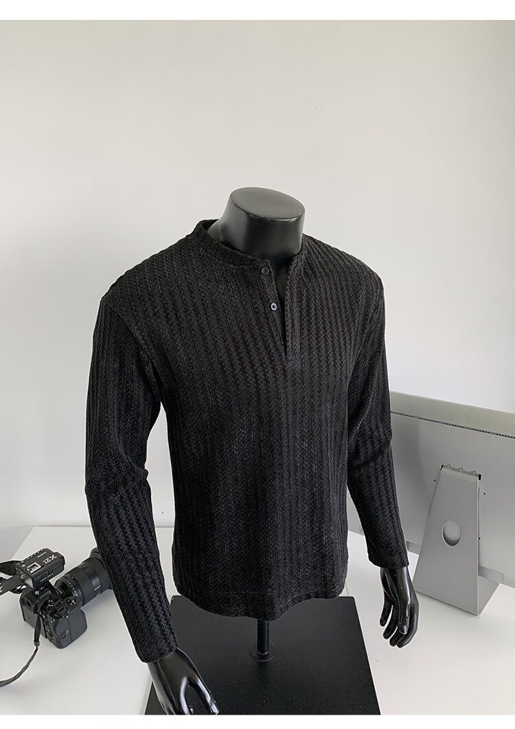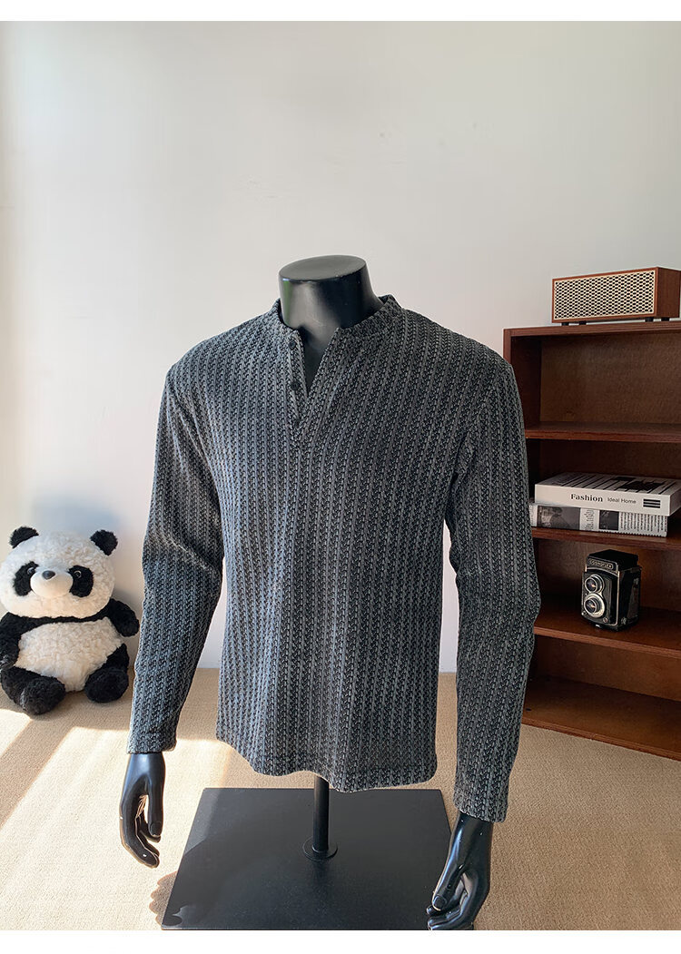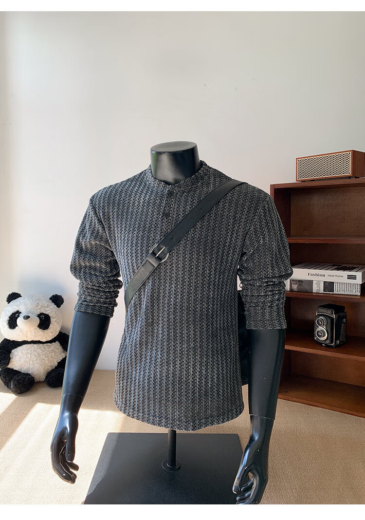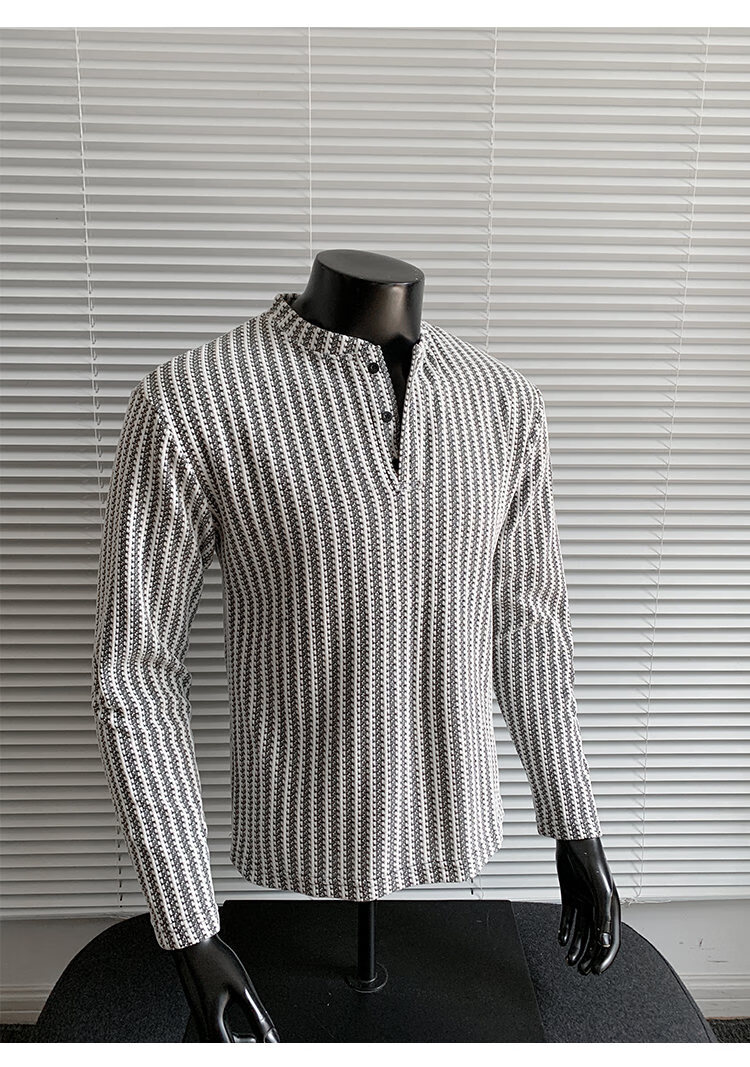 PUGESI American heavy henley shirt men's autumn black and white striped long-sleeved T-shirt herringbone pattern stand-up collar inner base sweatshirt gray 3XL