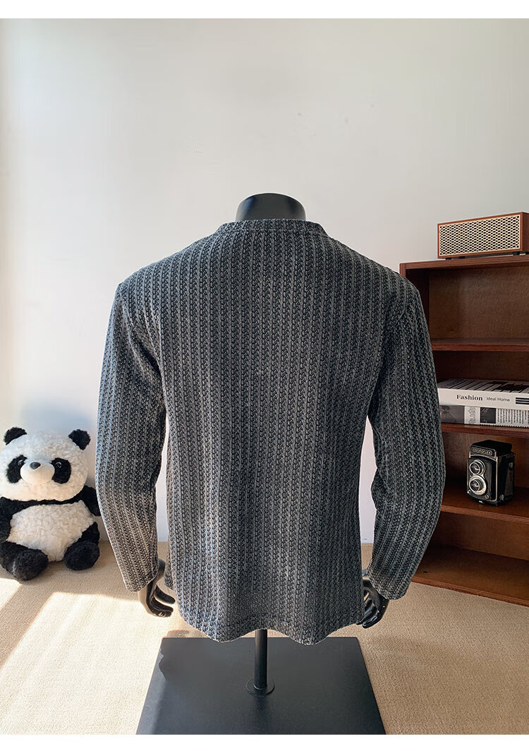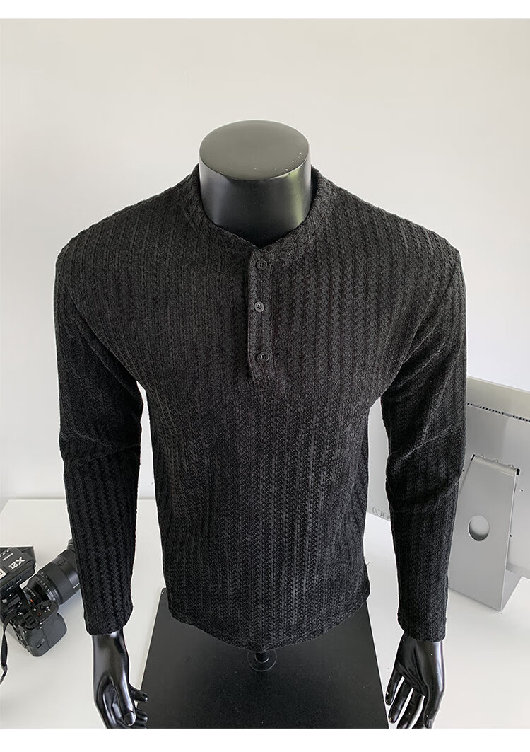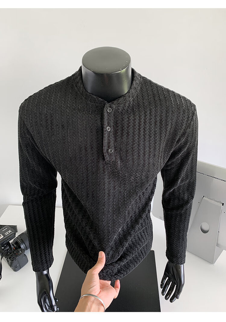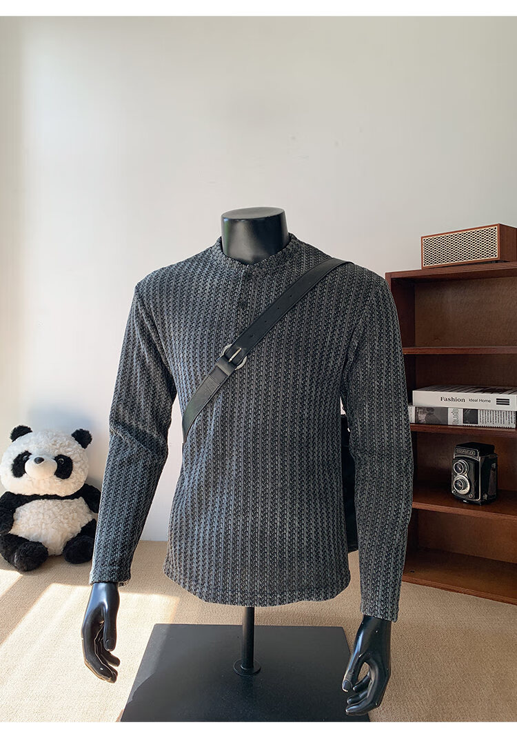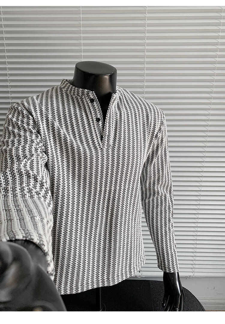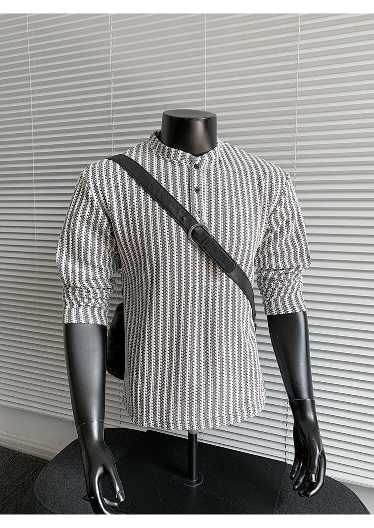 PUGESI American heavy henley shirt men's autumn black and white striped long-sleeved T-shirt herringbone pattern stand-up collar inner base sweatshirt gray 3XL