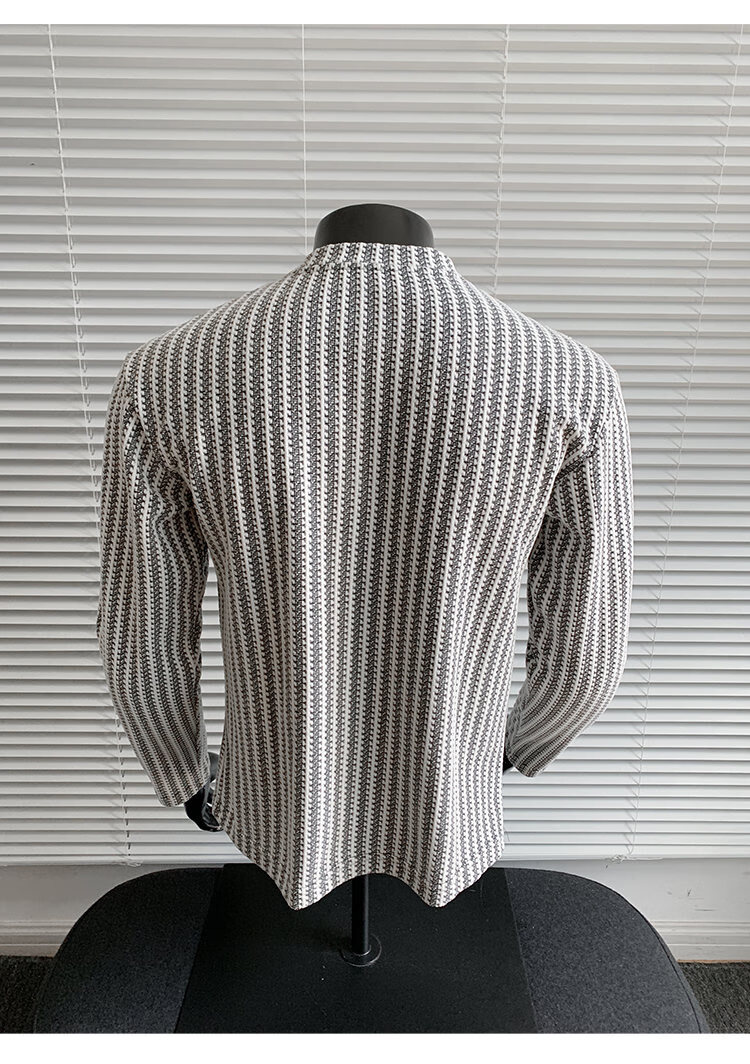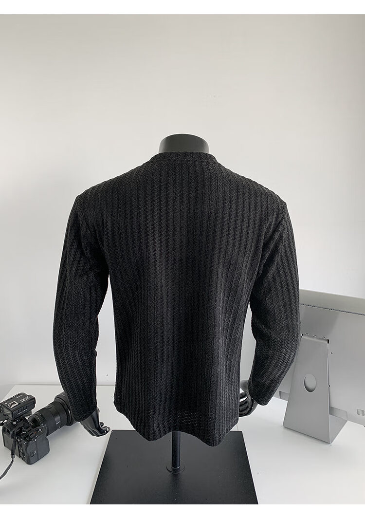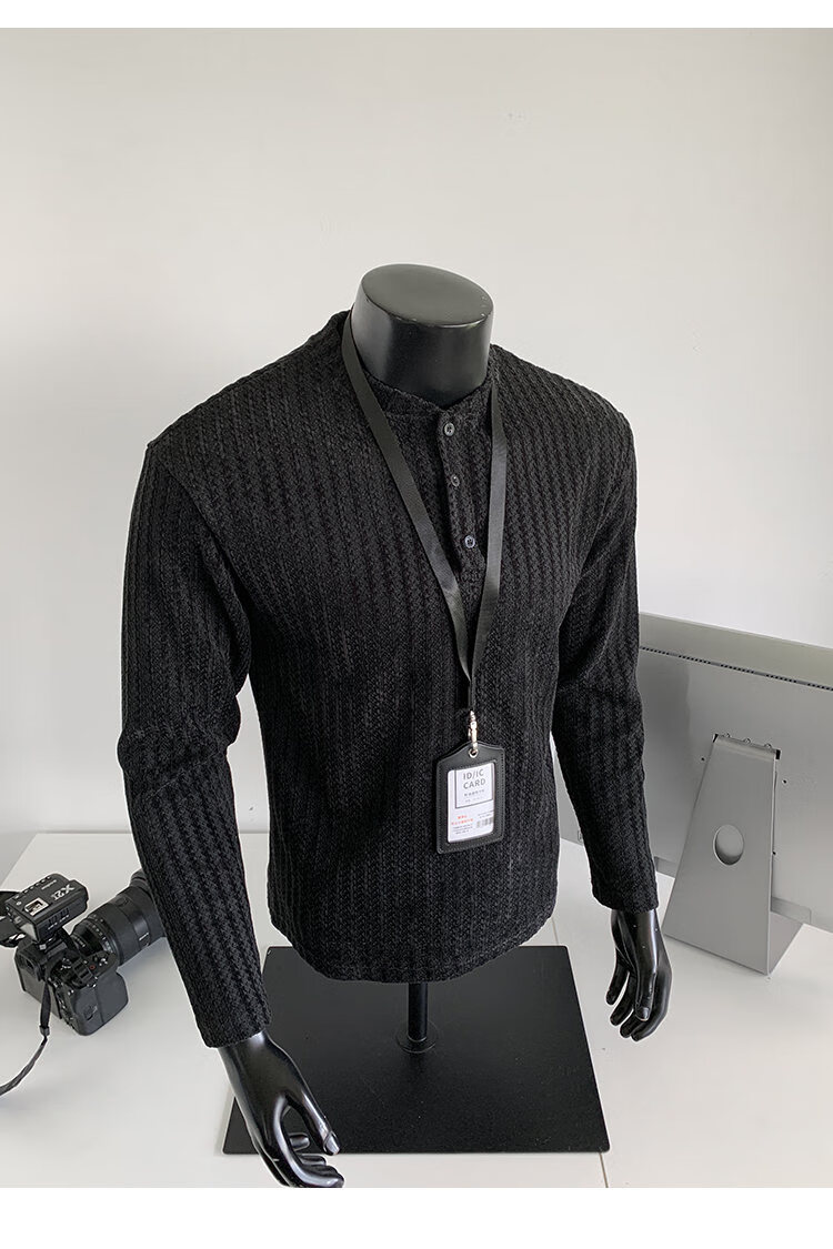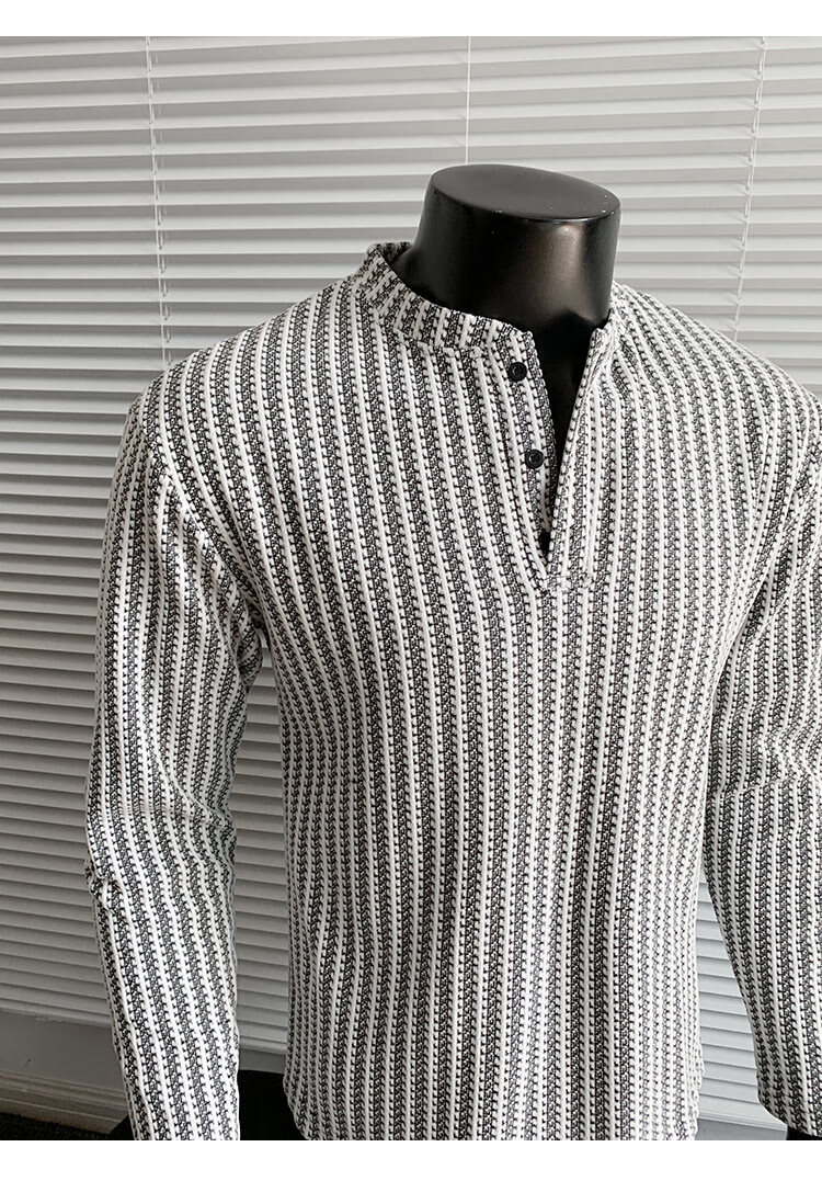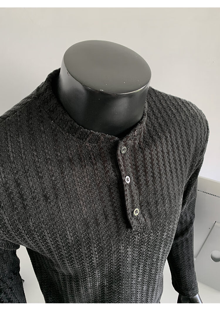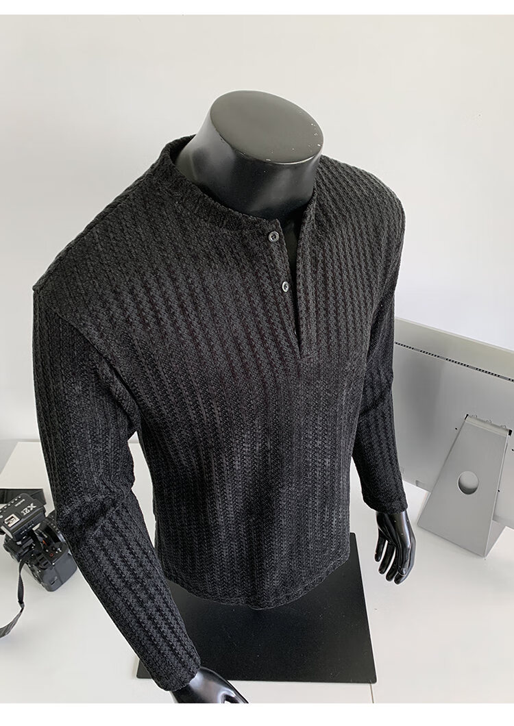 PUGESI American heavy henley shirt men's autumn black and white striped long-sleeved T-shirt herringbone pattern stand-up collar inner base sweatshirt gray 3XL