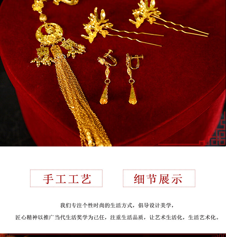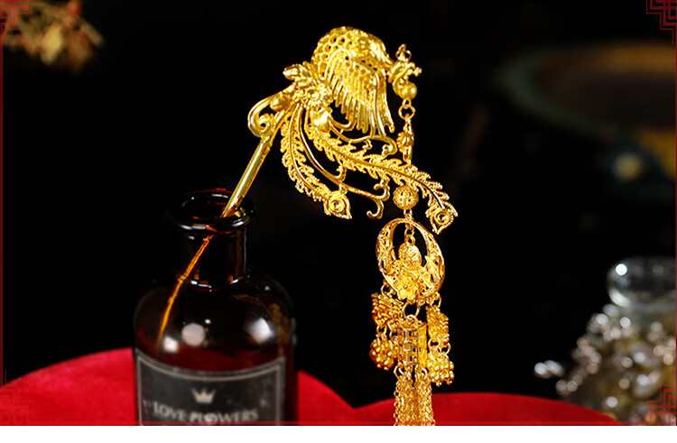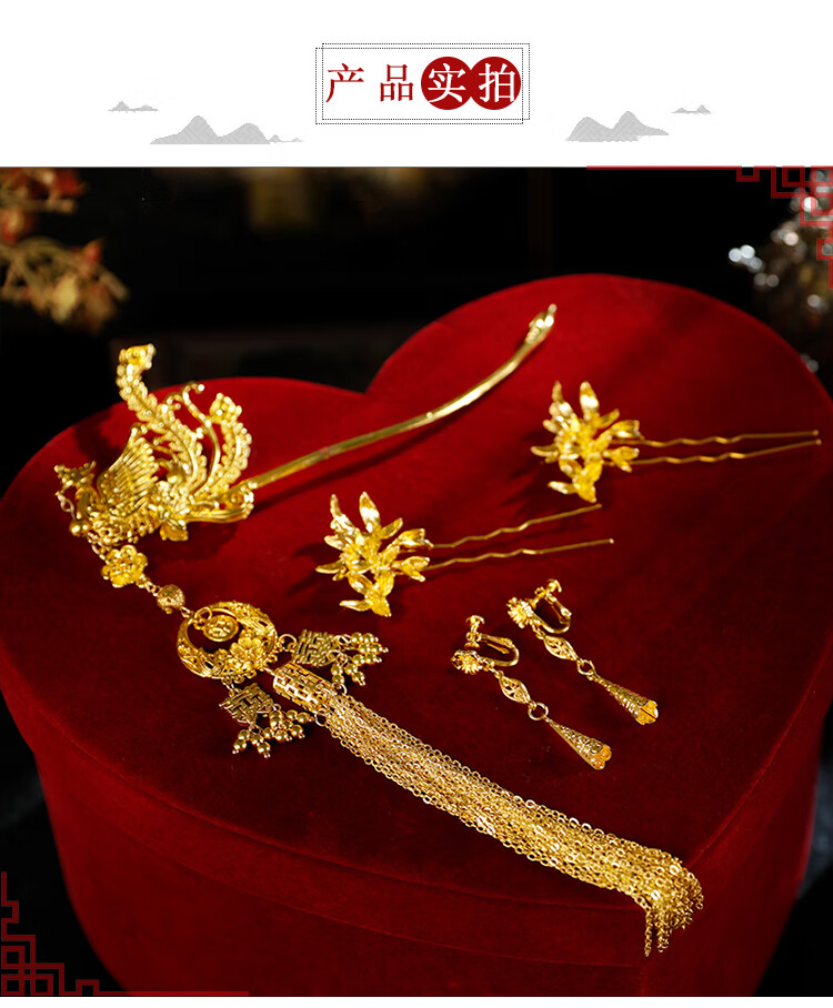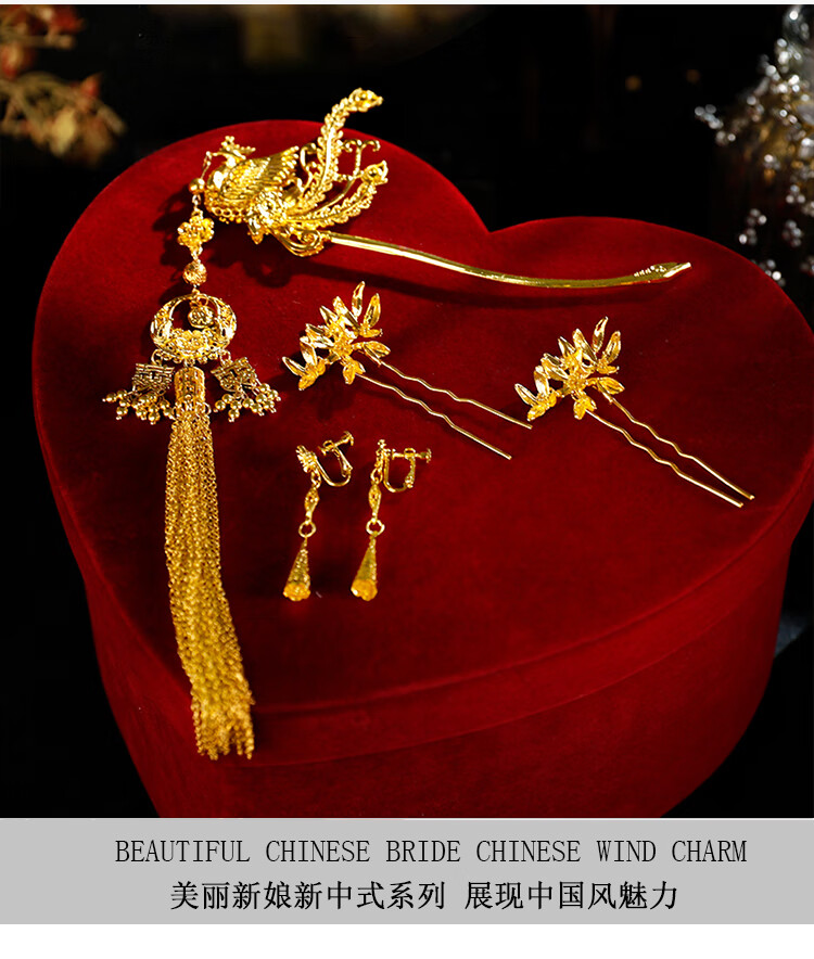 Meng Junchen new Chinese style Xiuhe headdress 2025 new retro golden phoenix hairpin classical hairpin bride cheongsam dragon and phoenix gown hair accessories Phoenix hairpin golden 4-piece set (ear clip style)