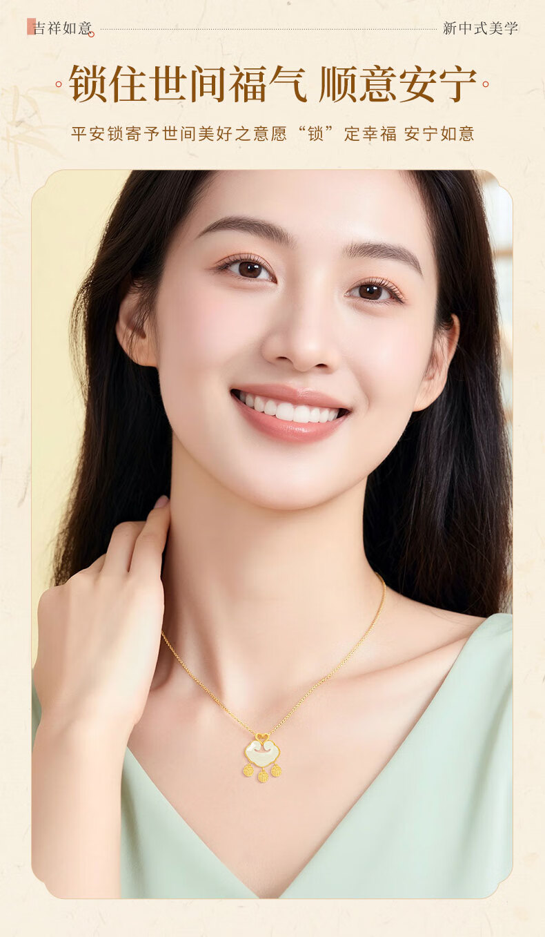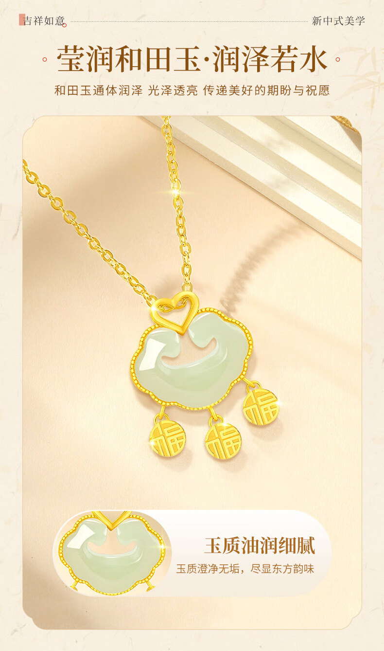 China Gold (CHINA GOLD) 18K Gold Ruyi Blessing Lock Necklace Women's Love K Gold Hetian Jade Pendant Birthday Gift for Girlfriends and Wife Practical to Fulfill Lock Wish 18k Ruyi Love Blessing Lock Pendant Free Silver Chain