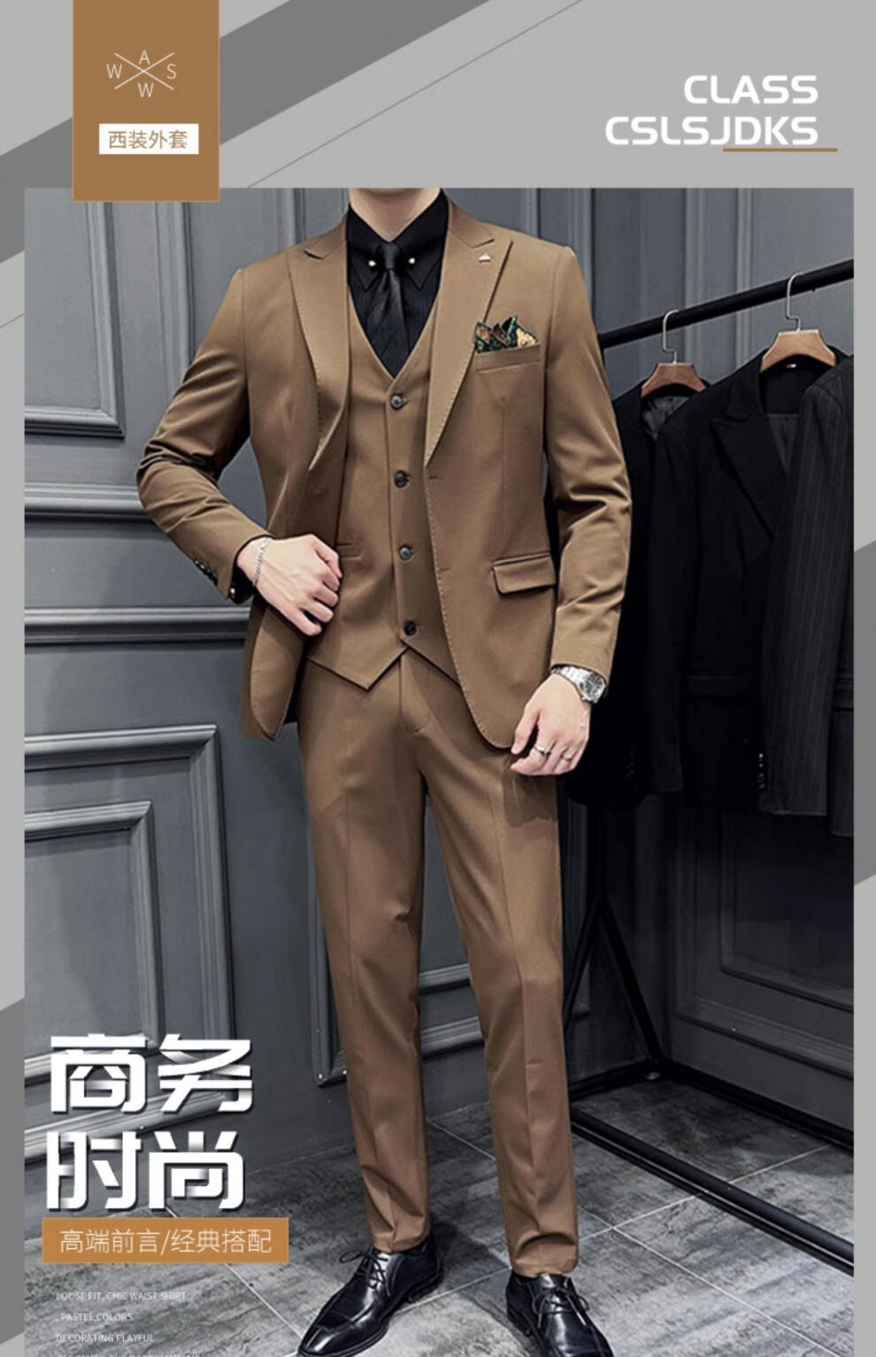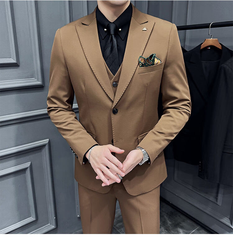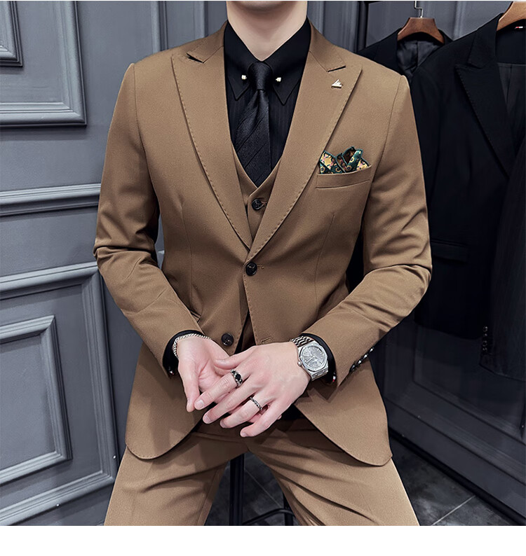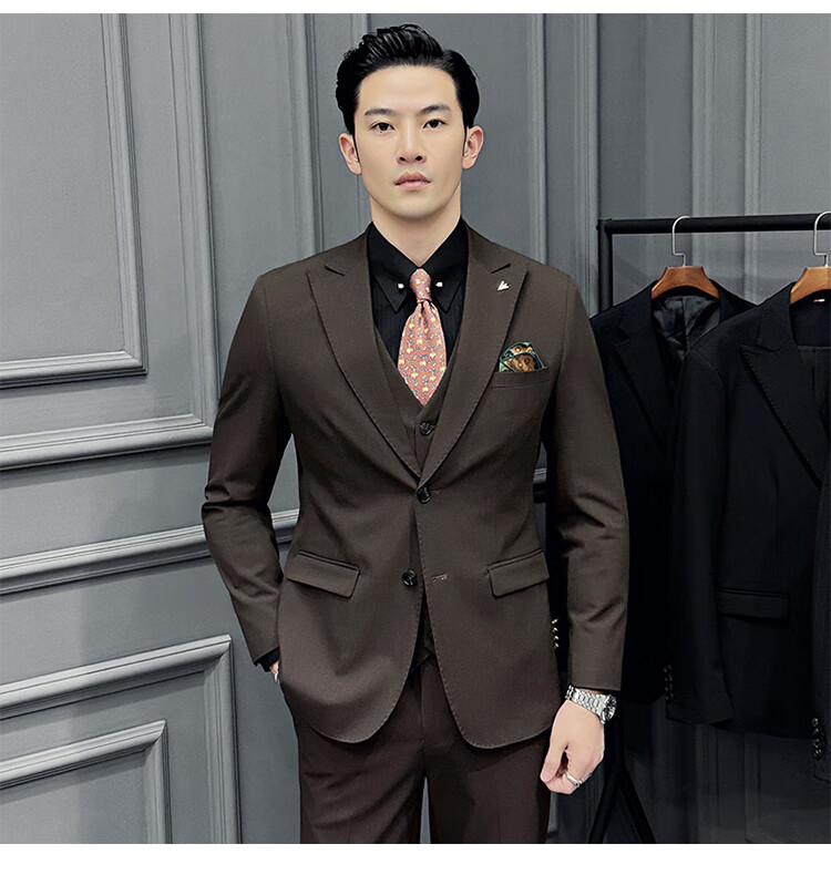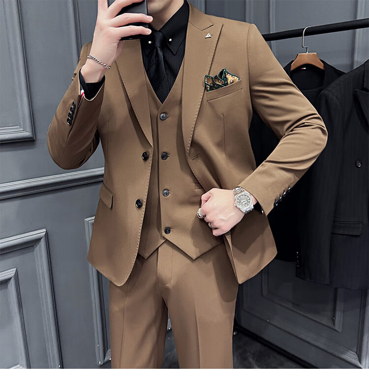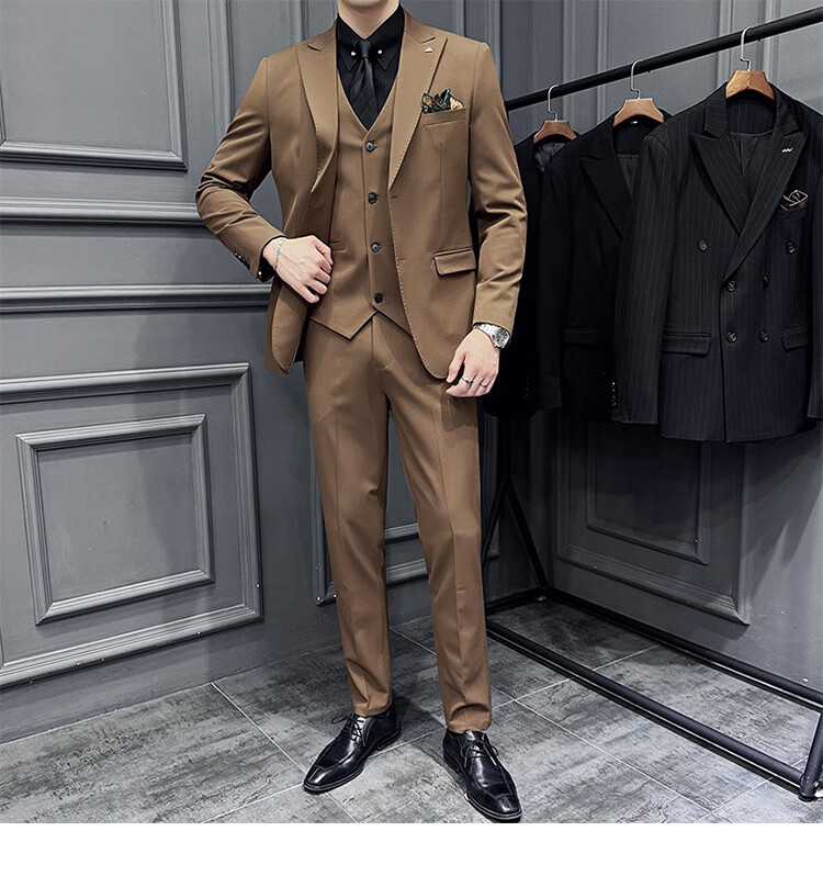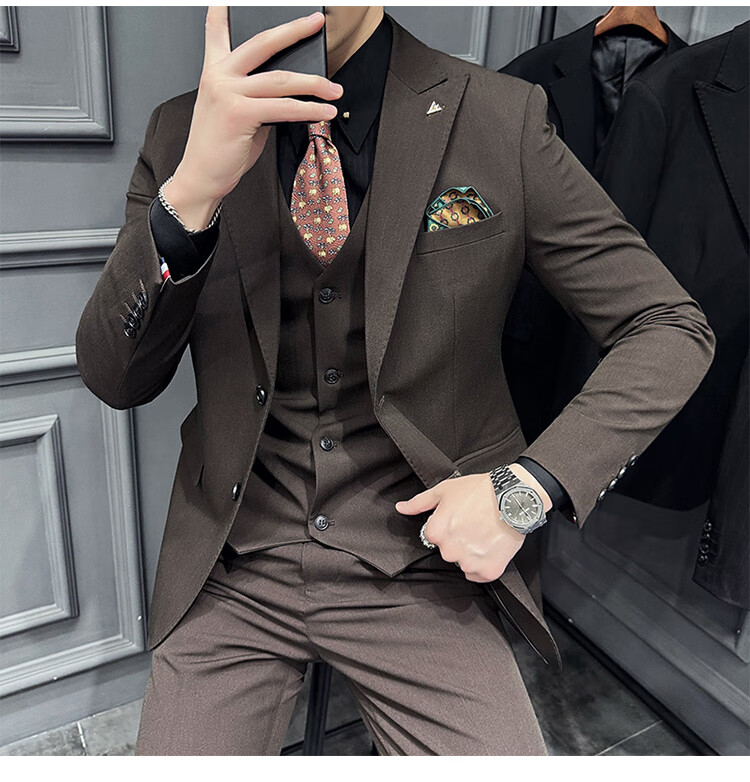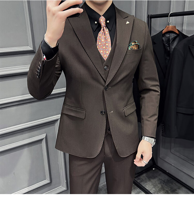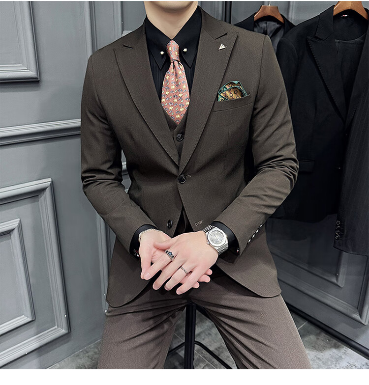 Hengyuanxiang Spring and Autumn Suit Men's Jacket Groom Wedding Dress Coffee Color Business Work Professional Formal Suit Suit Men Coffee Color (suit + vest + trousers, black shirt tie) S 46