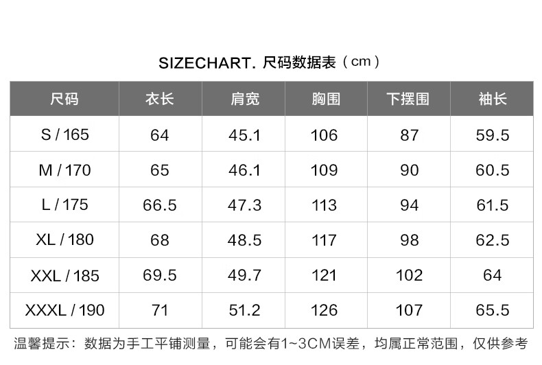 China (cm) 165 / 88-90 170 / 96-98 175 / 108-110 180 / 118-122 185 / 126-130
