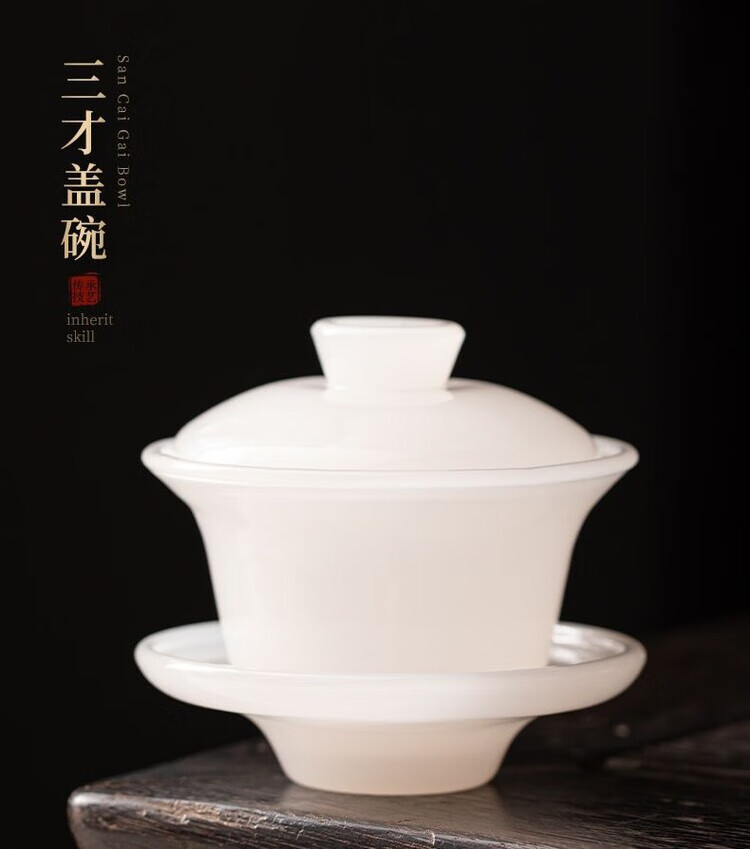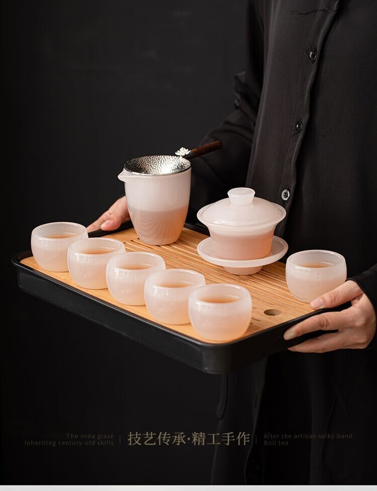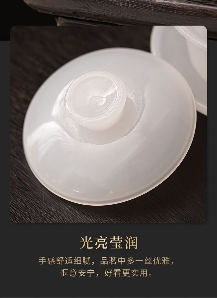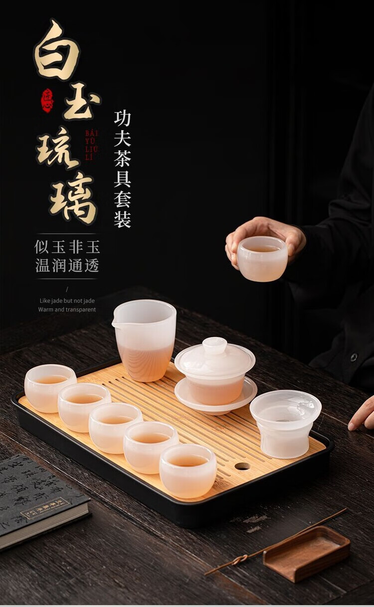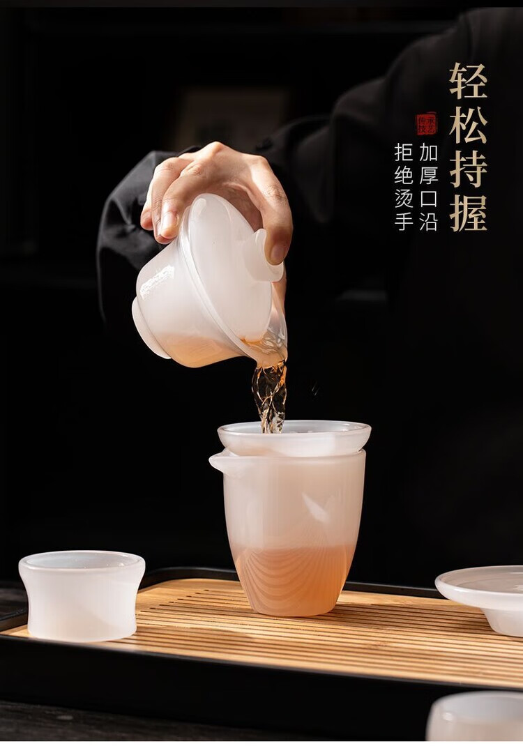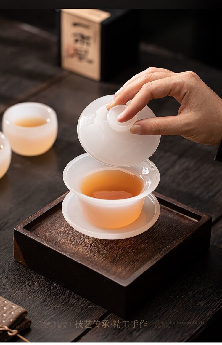Jian Yang Bingzhong Glaze Tea Set Home High-end White Jade Kung Fu Covered Bowl Tea Cup Heat-Resistant Anti-scalding Chinese Office Tea Set 10 Pieces/Tea Strainer Set/Tea Tray