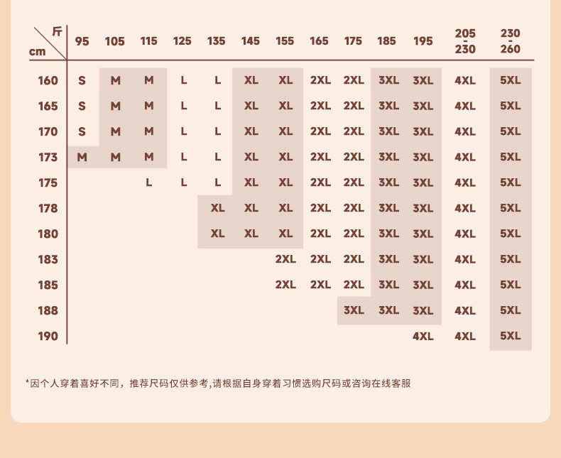 China (cm) 160-165/84-86 165-170 / 88-90 167-172 / 92-96 168-173 / 98-102 170-176 / 106-110