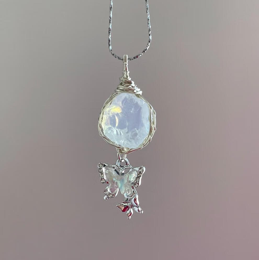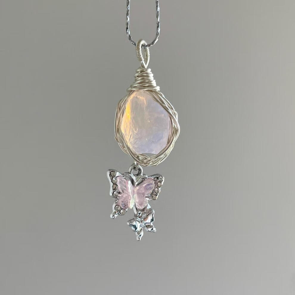 Xidian original design aquamarine rough stone butterfly necklace women's niche clavicle chain hand-wound crystal pendant Youdieyu