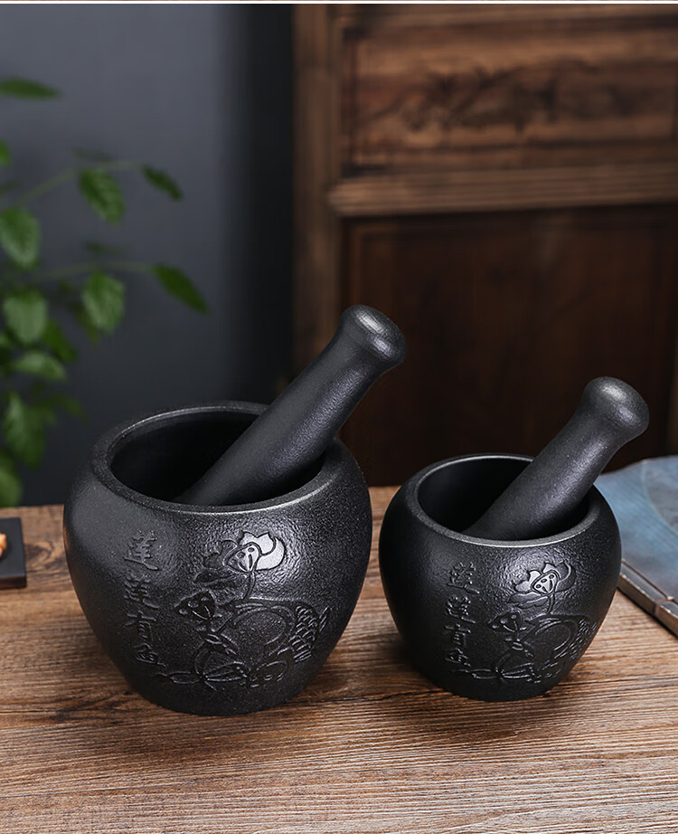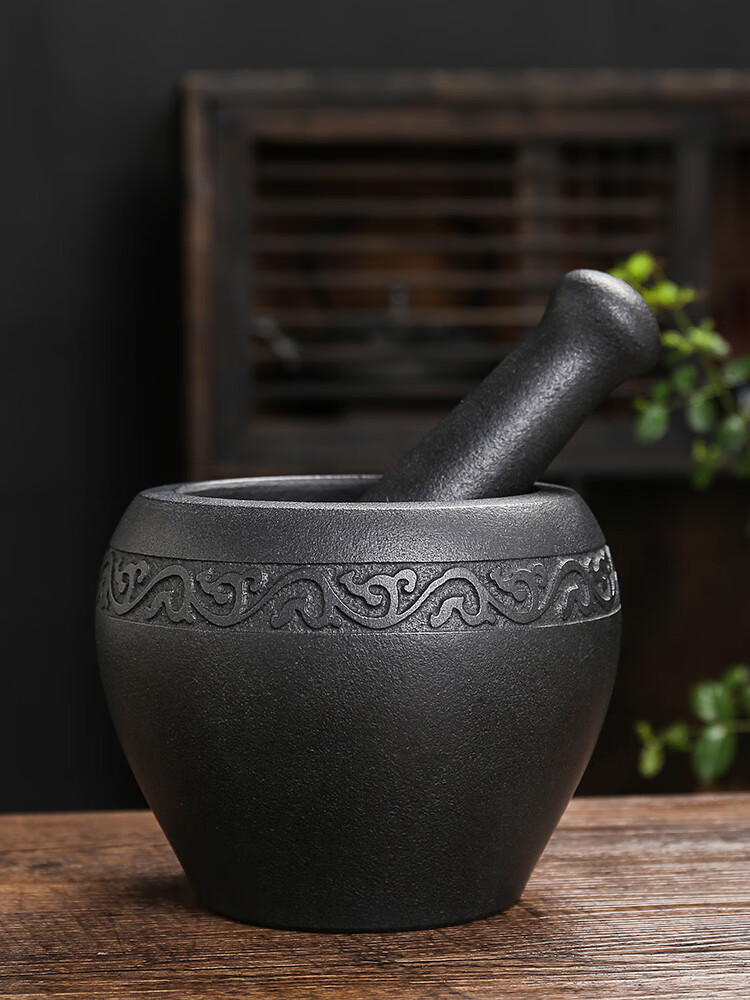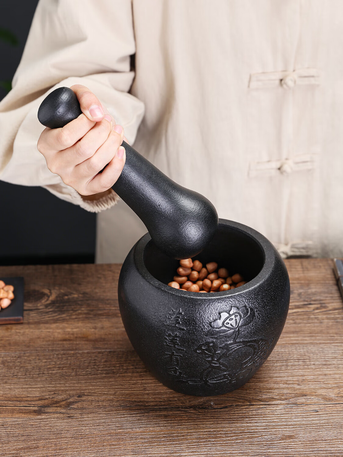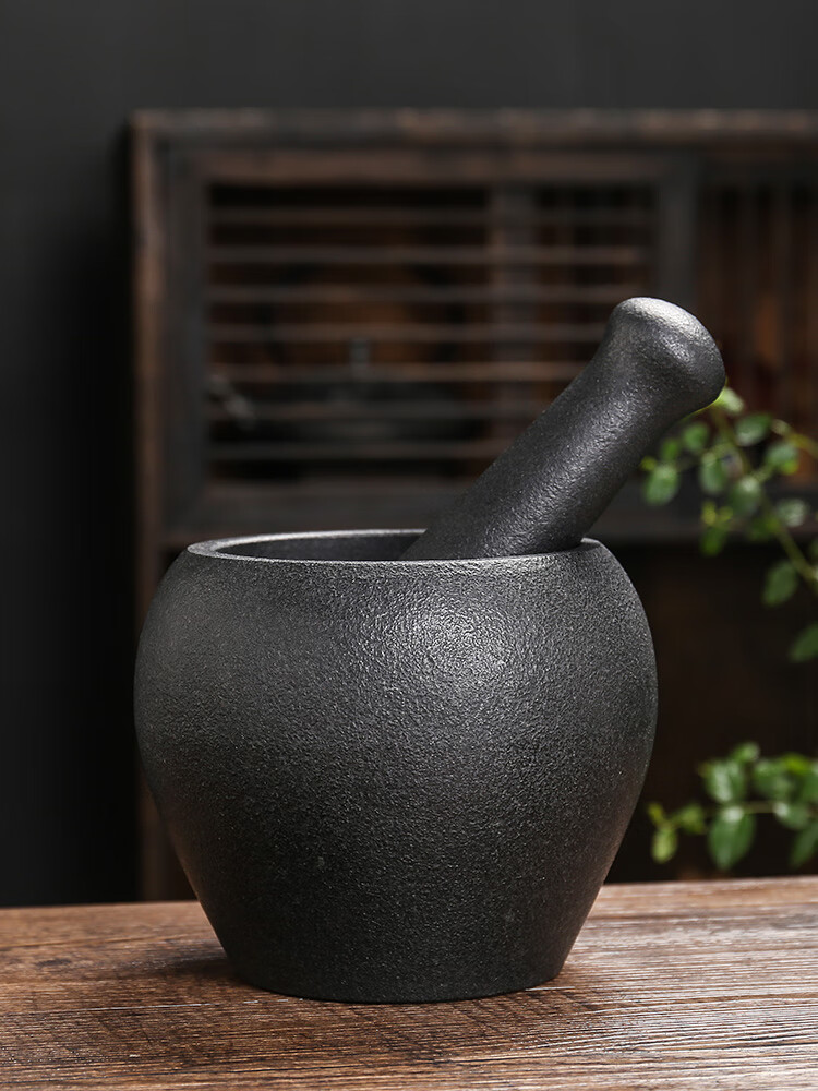 Yiyuanxuan household natural black gold garlic mortar, stone mortar, medicine jar, stone cup, garlic pounder, mashing Wo Leibo pepper, Lianlian fish outer diameter 13CM
