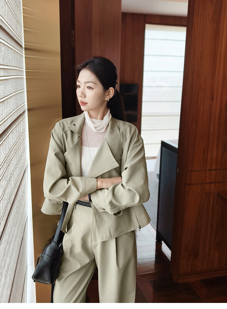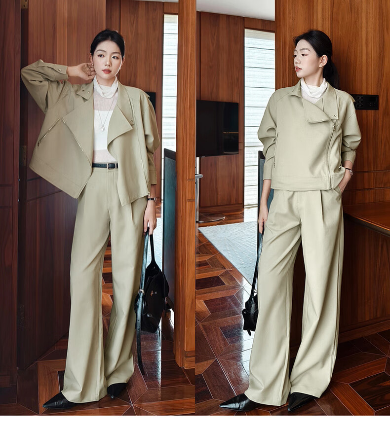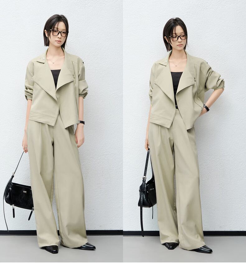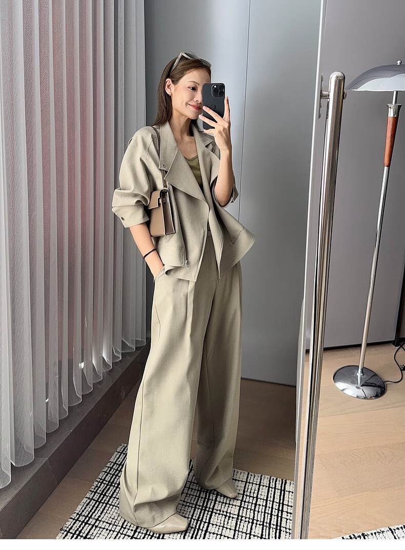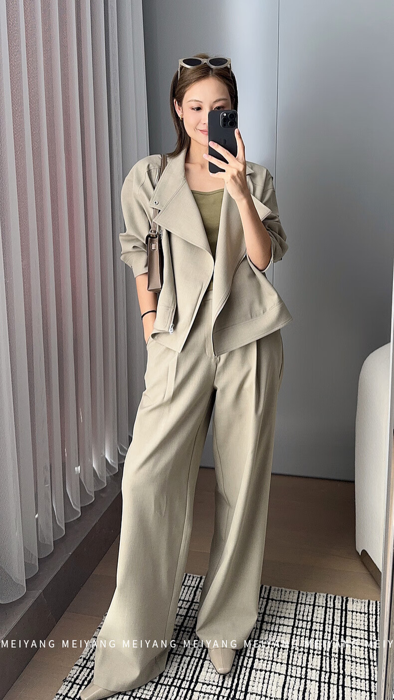 MEIYANG Melbourne No. 6 Suit Hemp texture commuting casual lapel jacket trousers cool temperament autumn new gray green (jacket + casual pants regular version) S