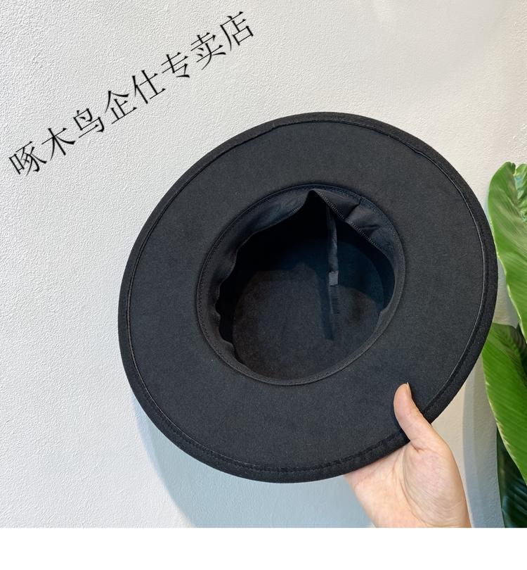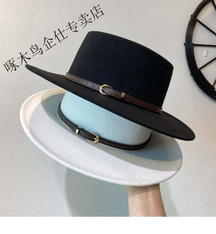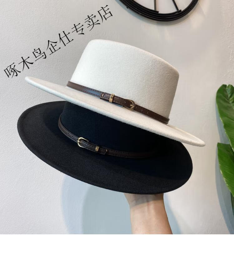 Woodpecker autumn and winter British European and American style belt buckle flat top hat for men and women wide brim sunshade retro woolen black jazz hat white brown belt M (56-58cm)
