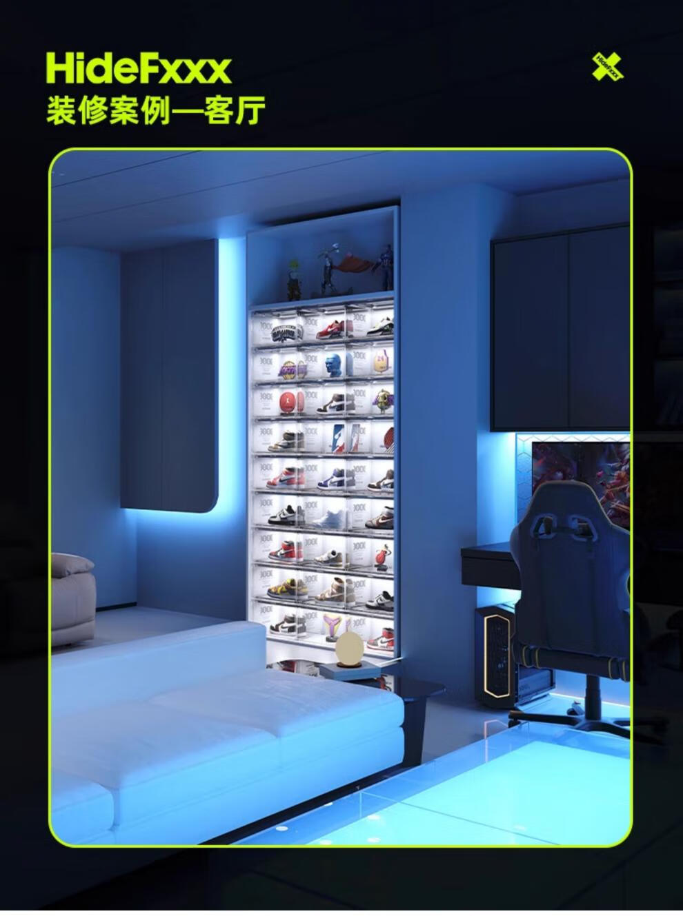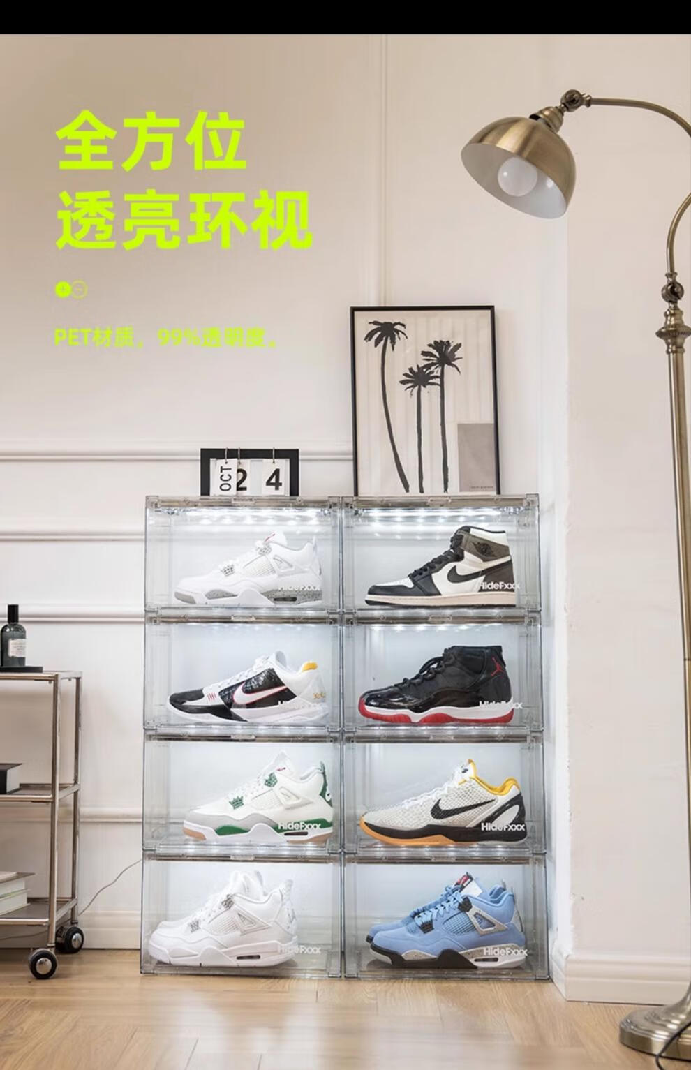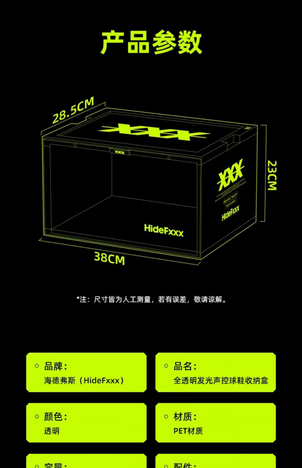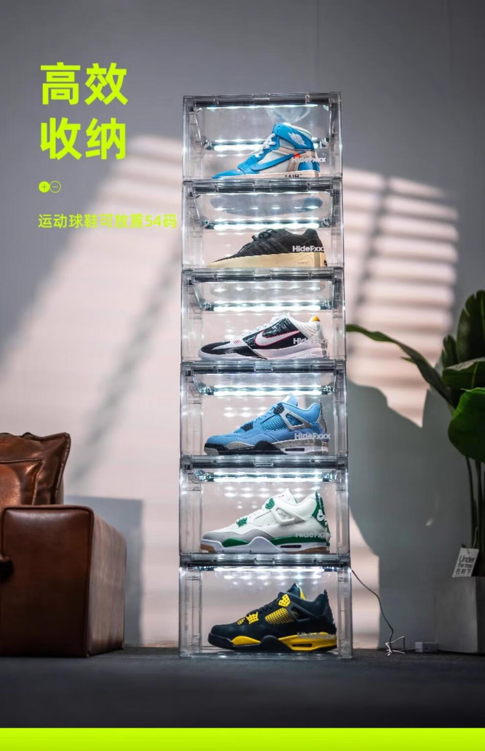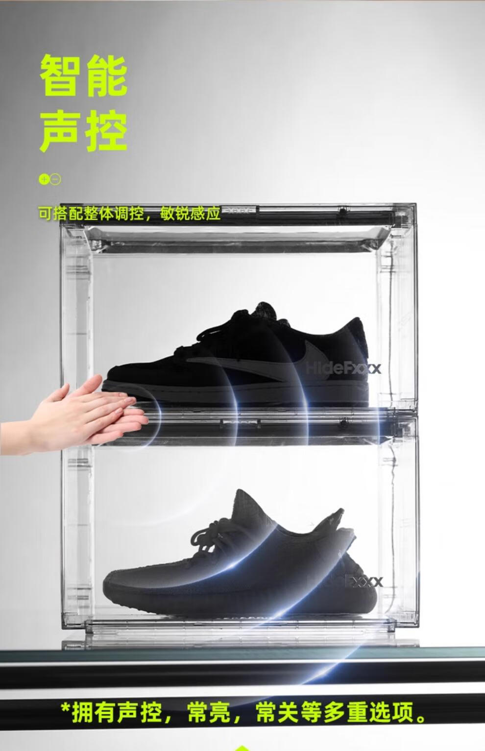 HideFxxx voice-activated light shoe box PET transparent sneaker storage box LED light-emitting display wall cabinet can hold 54 yards. No installation required. Fully transparent with 16 lights. Free power adapter 380x285x230mm