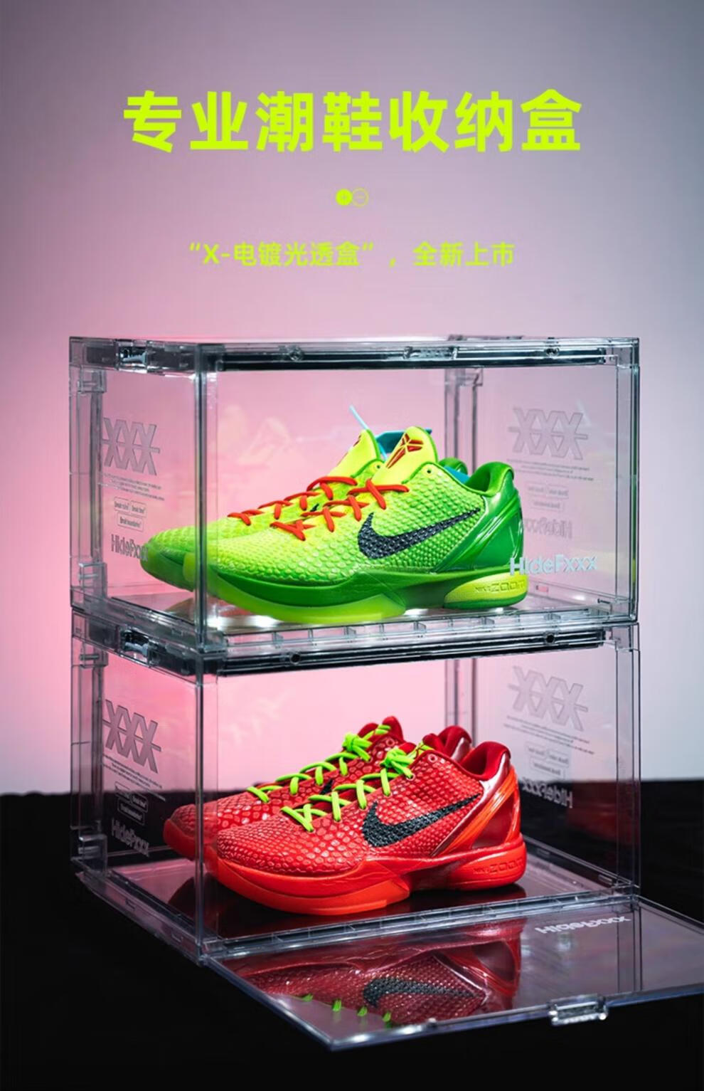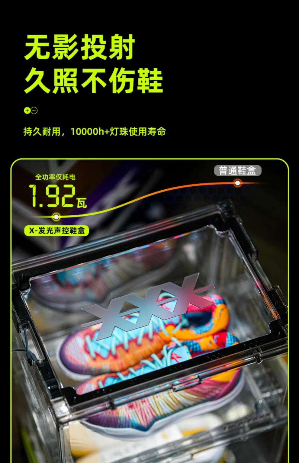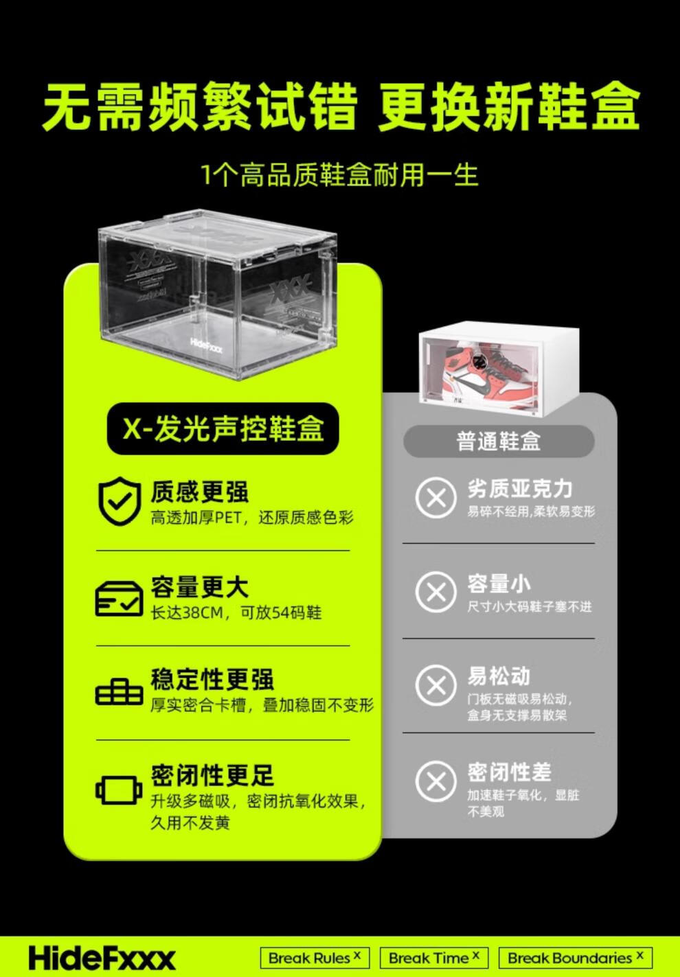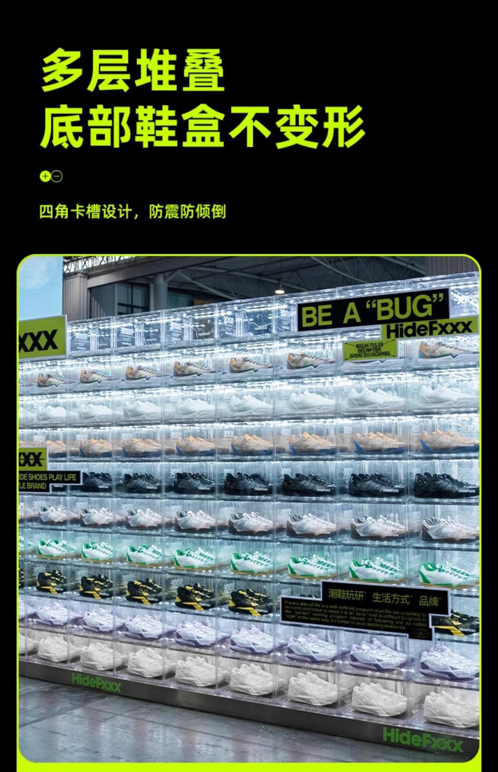 HideFxxx voice-activated light shoe box PET transparent sneaker storage box LED light-emitting display wall cabinet can hold 54 yards. No installation required. Fully transparent with 16 lights. Free power adapter 380x285x230mm
