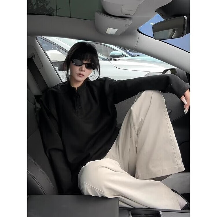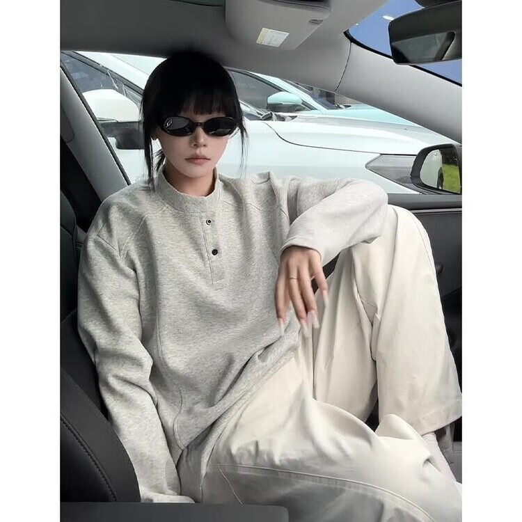 Space(konzen)丨Henry collar right shoulder sweatshirt men's autumn American deconstructed splicing design long-sleeved T-shirt base shirt KONZEN丨White gray Henry boxy version air cotton S recommended 70-85 regular size regular shooting