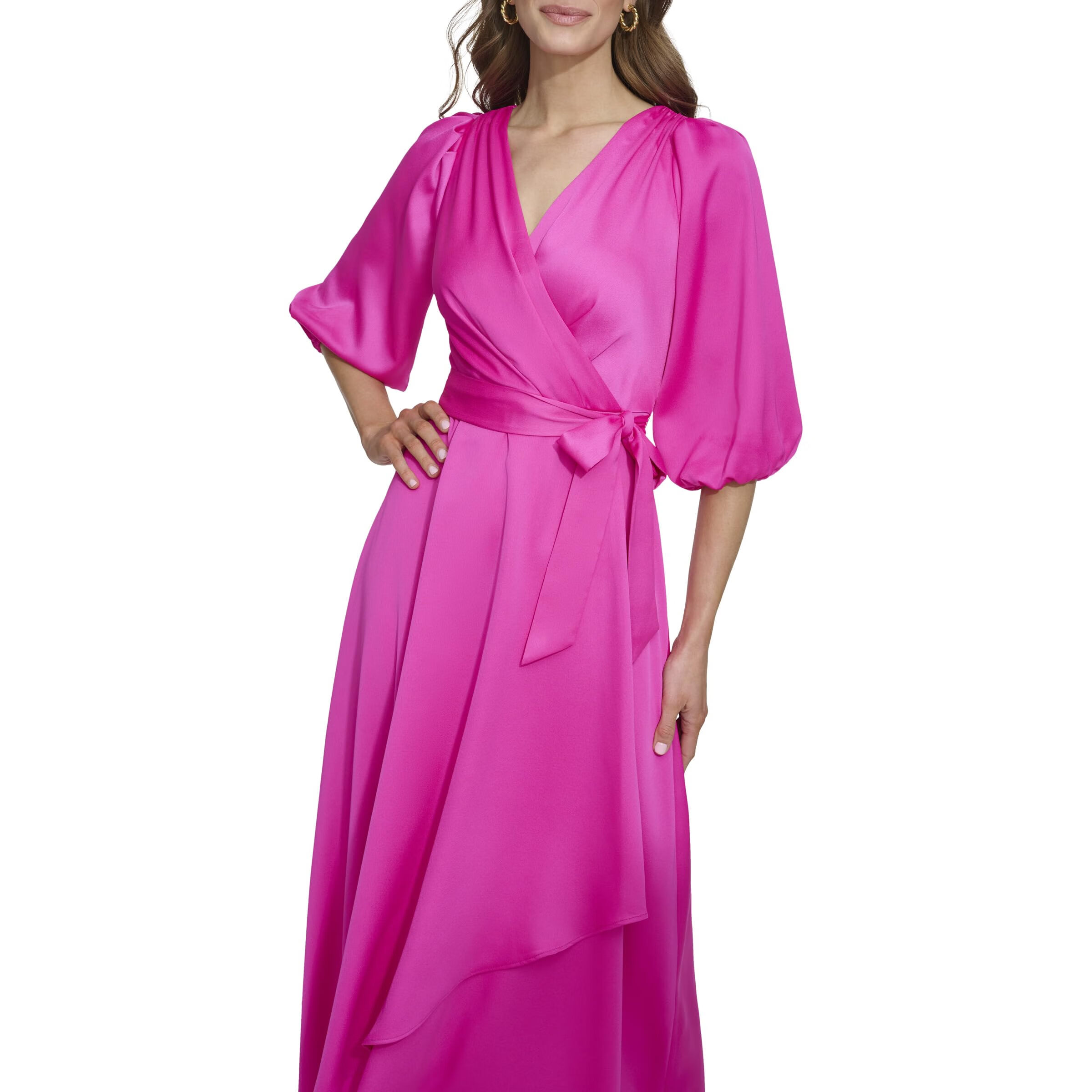 DKNY Women's Balloon Sleeve Satin Faux Wrap Maxi Dress, Pink, 14