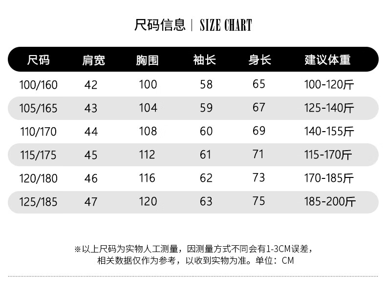 China (cm) 165 / 88-90 170 / 96-98 175 / 108-110 180 / 118-122 185 / 126-130