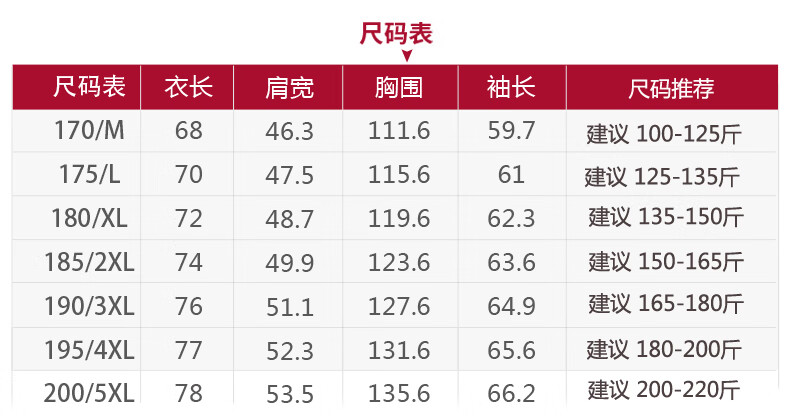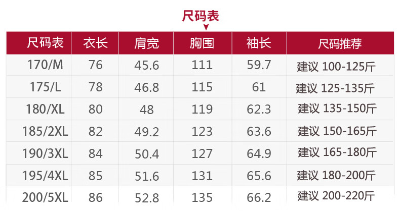 China (cm) 165 / 88-90 170 / 96-98 175 / 108-110 180 / 118-122 185 / 126-130