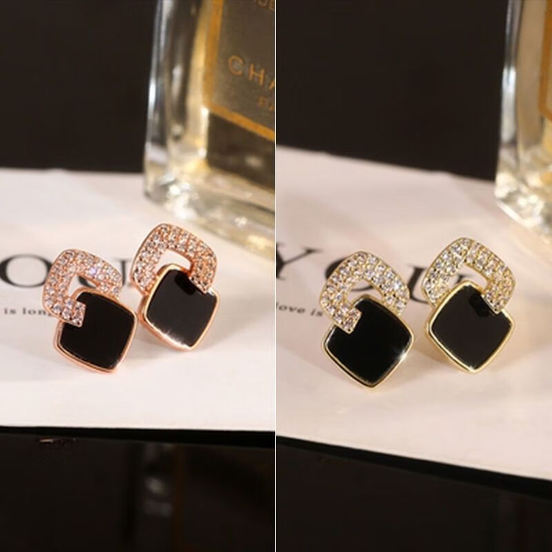 RSRDDY Old Phoenix 9999 sterling silver black earrings, the same style, new style earrings for women with autumn and winter temperament, niche round faces, silver needles, gold rhinestone earrings + geometric square earrings, two pairs, the same style as Lao Fengxiang