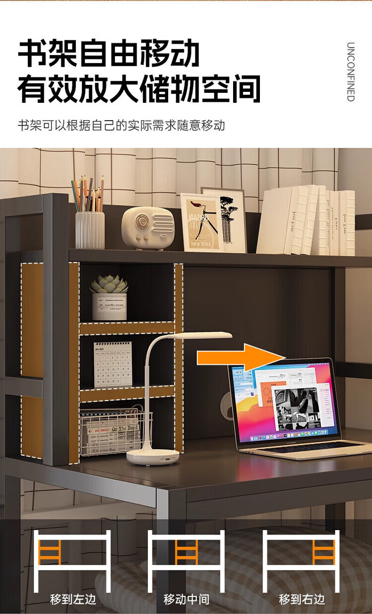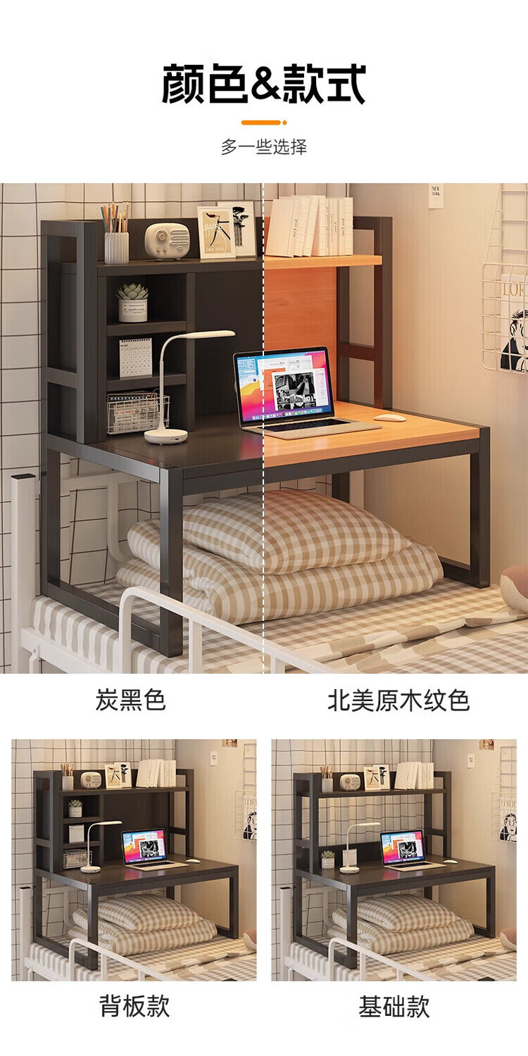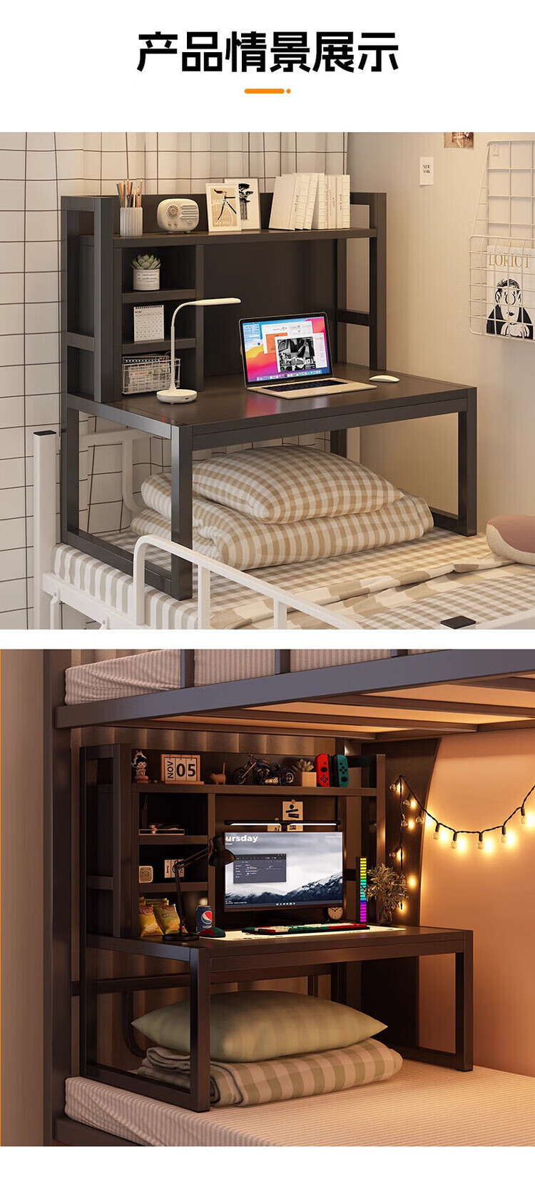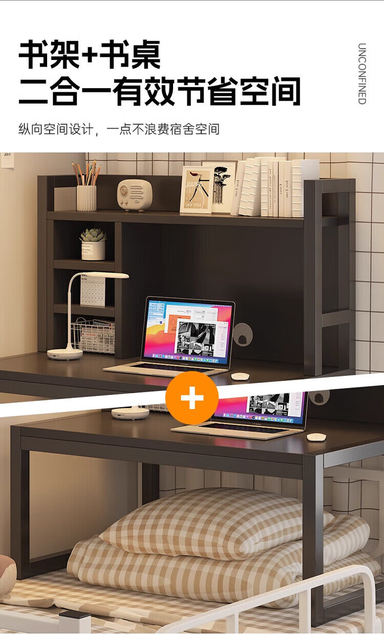 Dormitory artifact college student bed computer desk with bookshelf lazy desk upper and lower bunk steel frame bedside storage table full back panel + mobile bookshelf + LED light maple color + white shelf 80 40 86cm