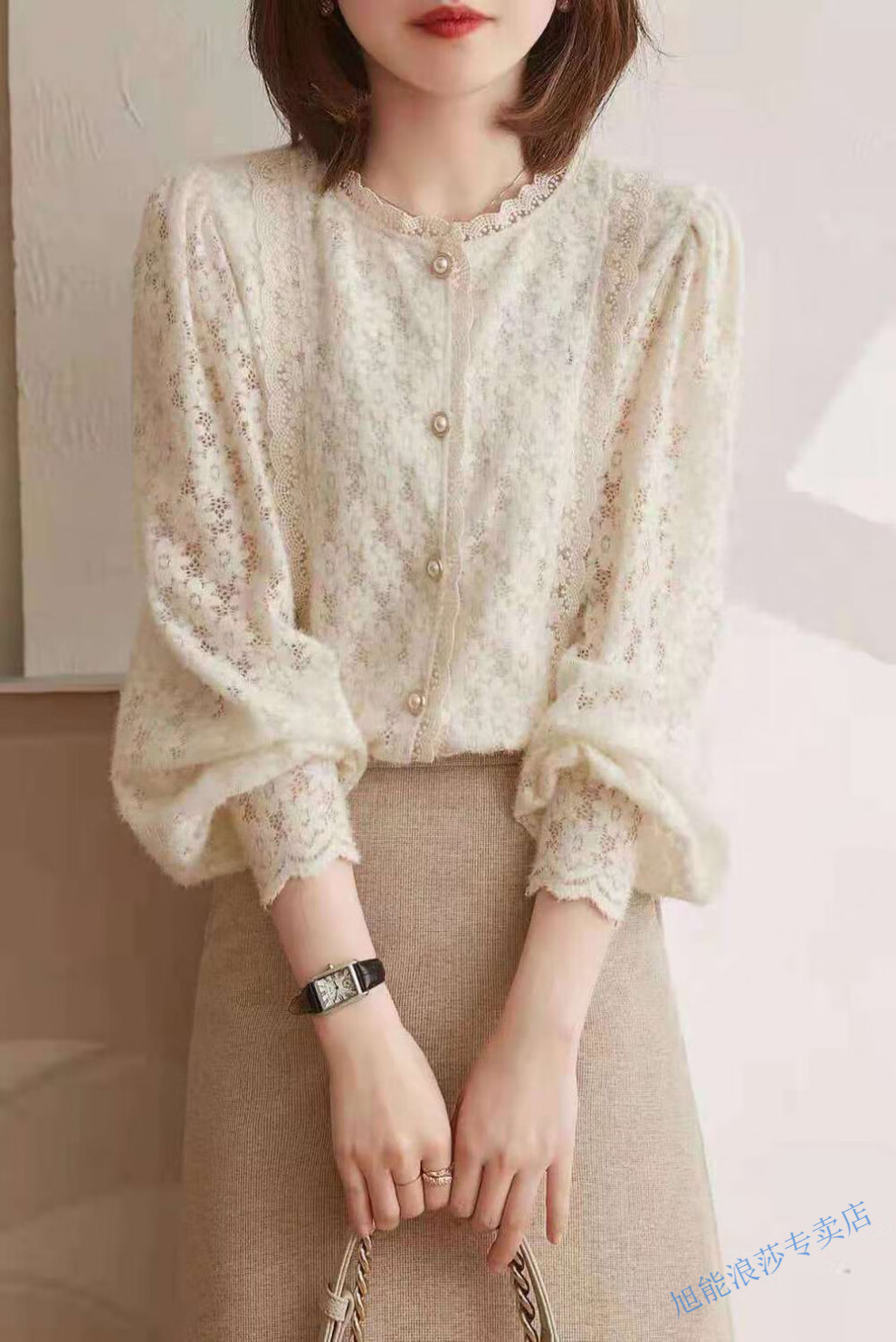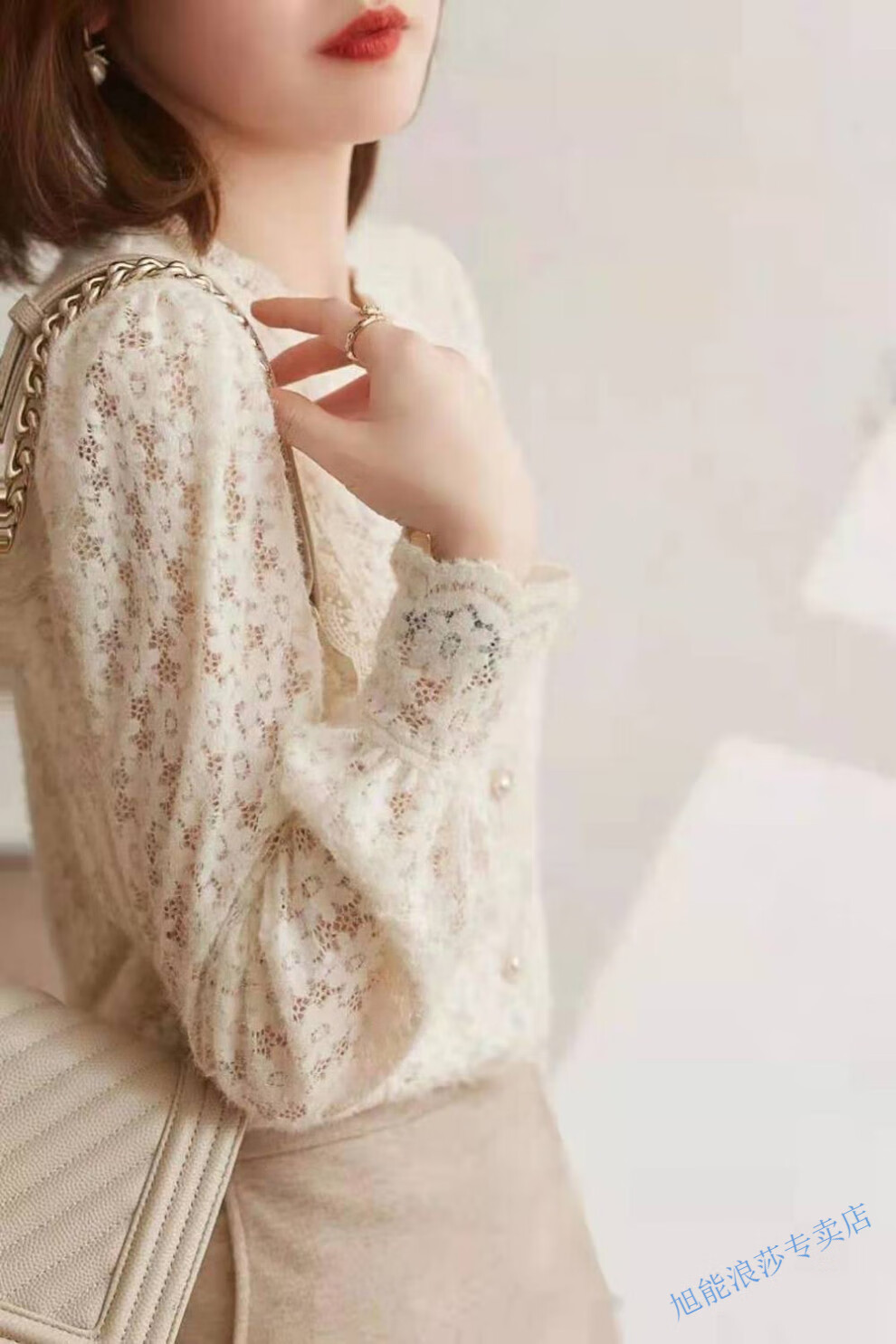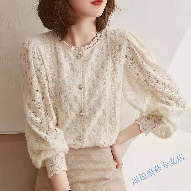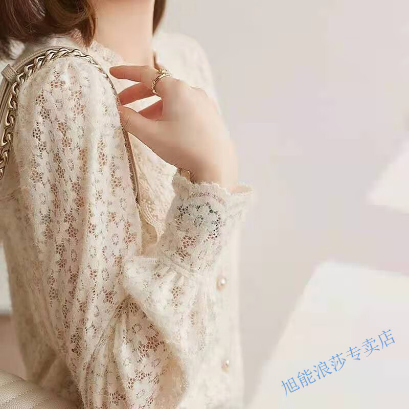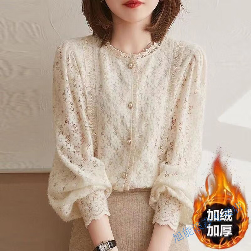 Langsha velvet thickened autumn and winter new shirt women's fashion slim brushed lace shirt Western style versatile loose top velvet apricot L 100-110Jin Jin equals 0.5 kg