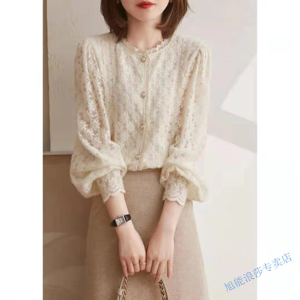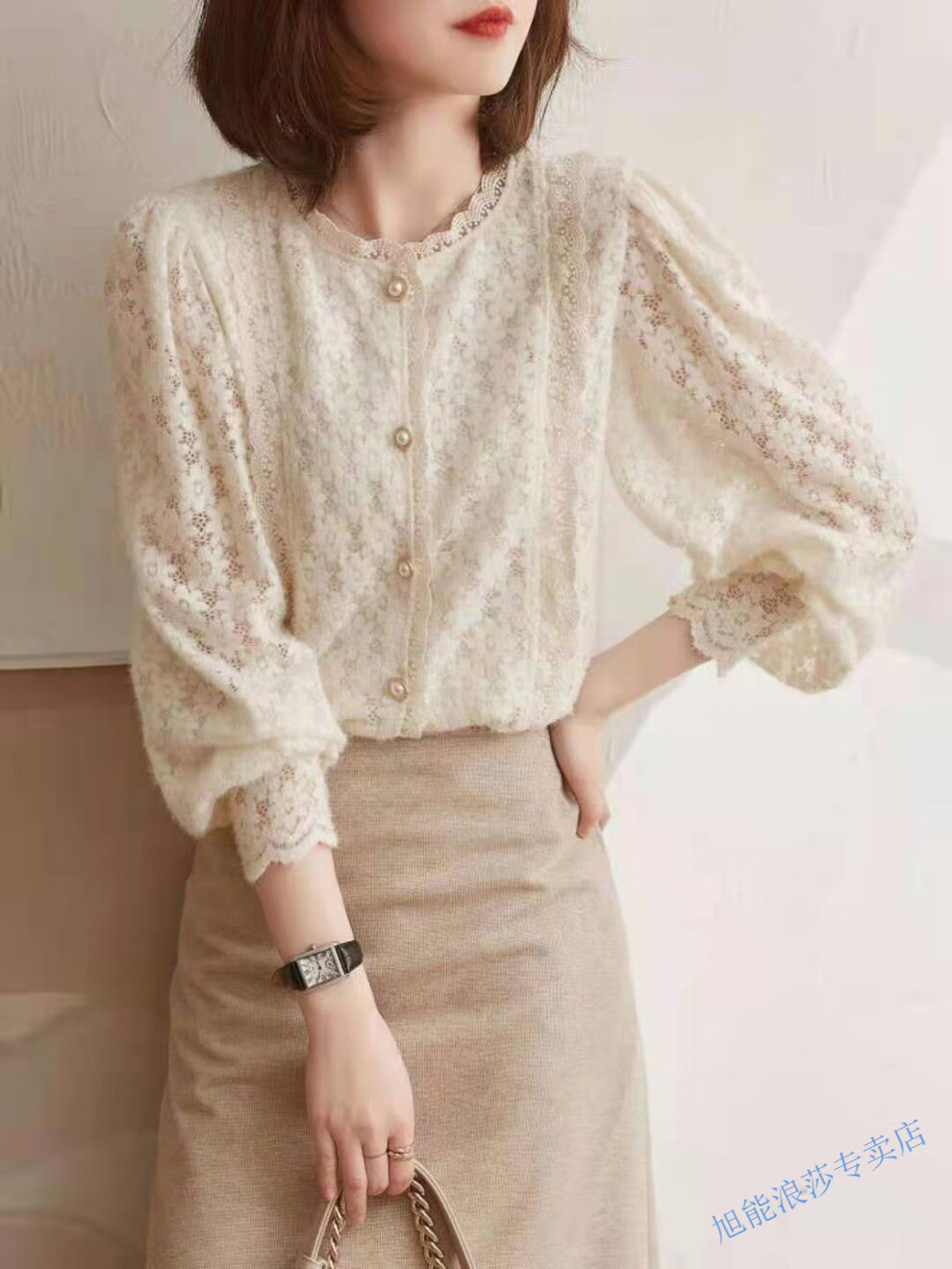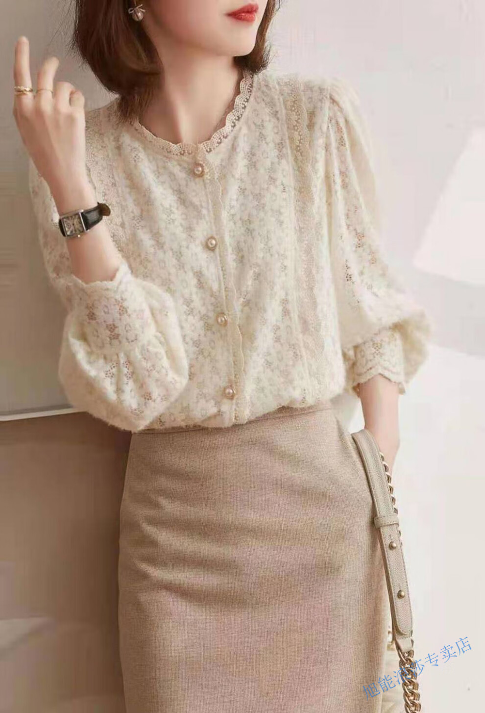 Langsha velvet thickened autumn and winter new shirt women's fashion slim brushed lace shirt Western style versatile loose top velvet apricot L 100-110Jin Jin equals 0.5 kg