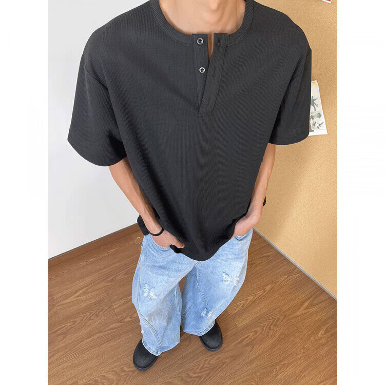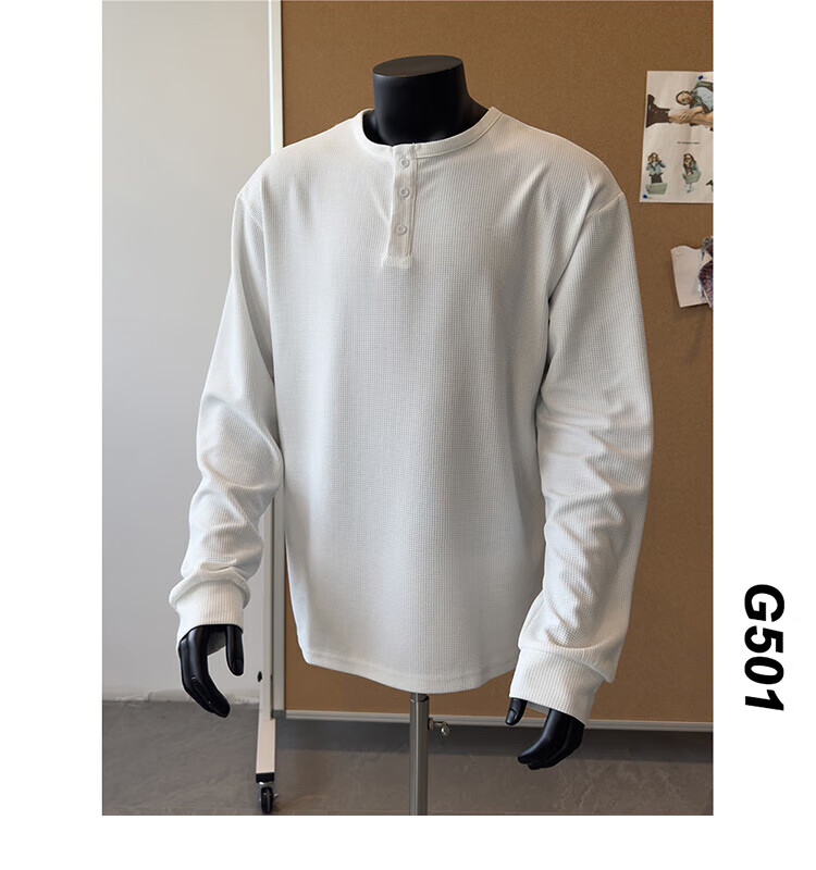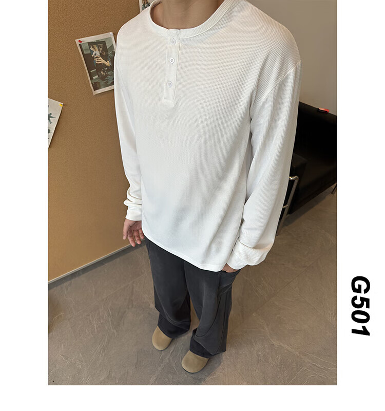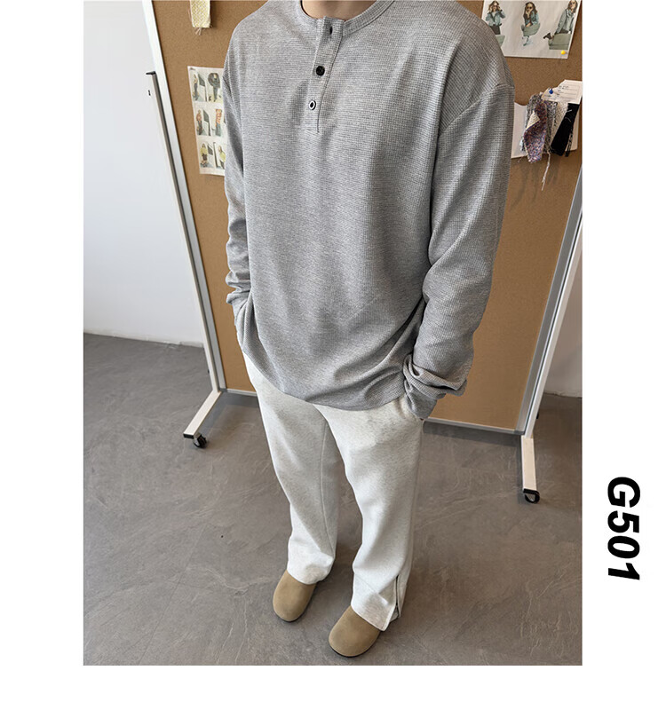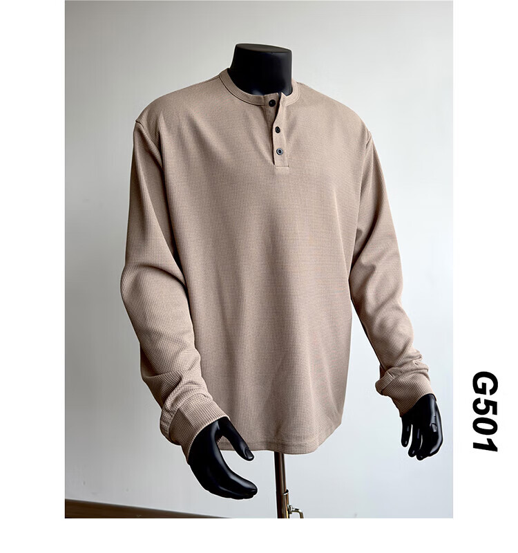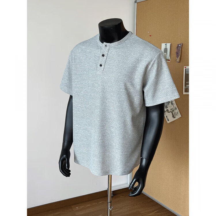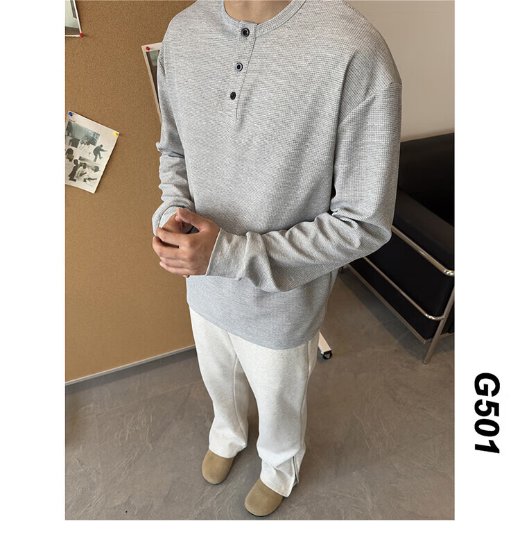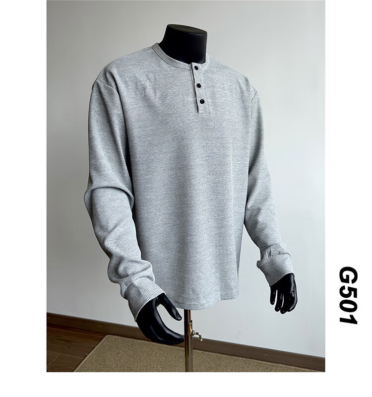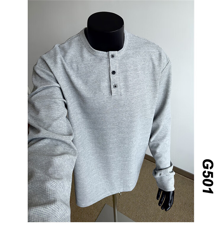 Jiaojing 2025 spring and autumn versatile henley collar long-sleeved T-shirt men's casual sports waffle Polo shirt T-shirt top light gray L