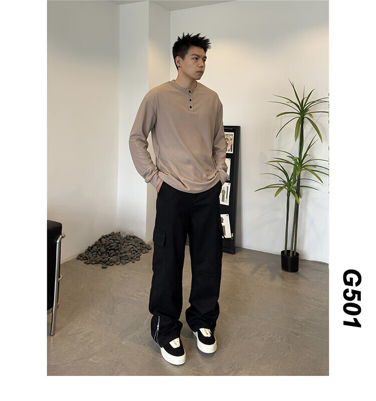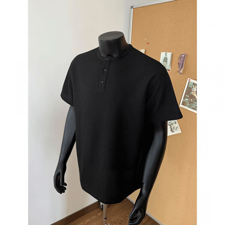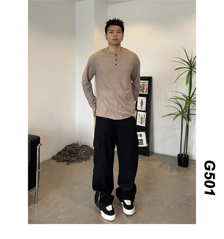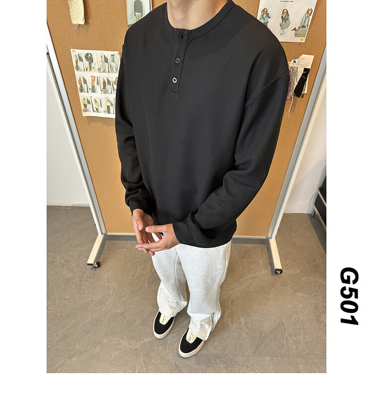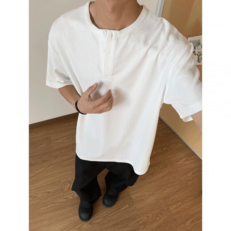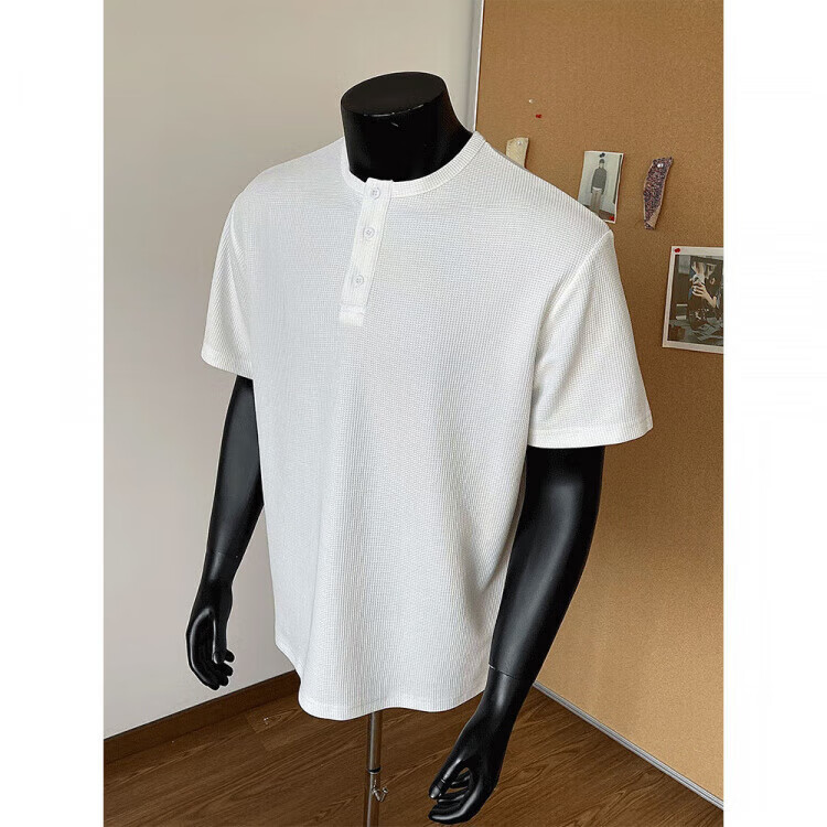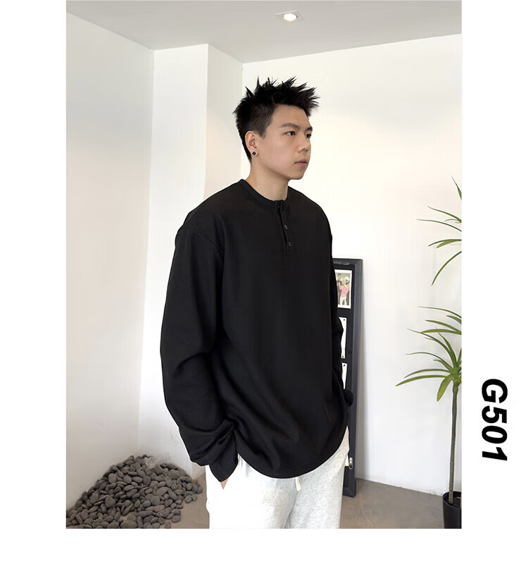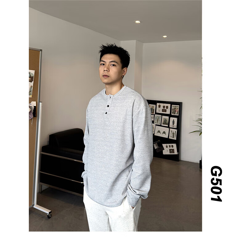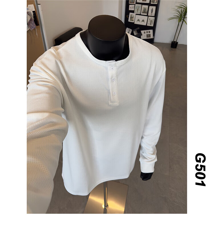 Jiaojing 2025 spring and autumn versatile henley collar long-sleeved T-shirt men's casual sports waffle Polo shirt T-shirt top light gray L