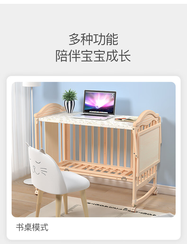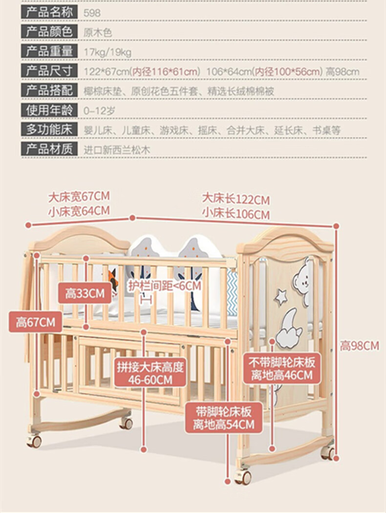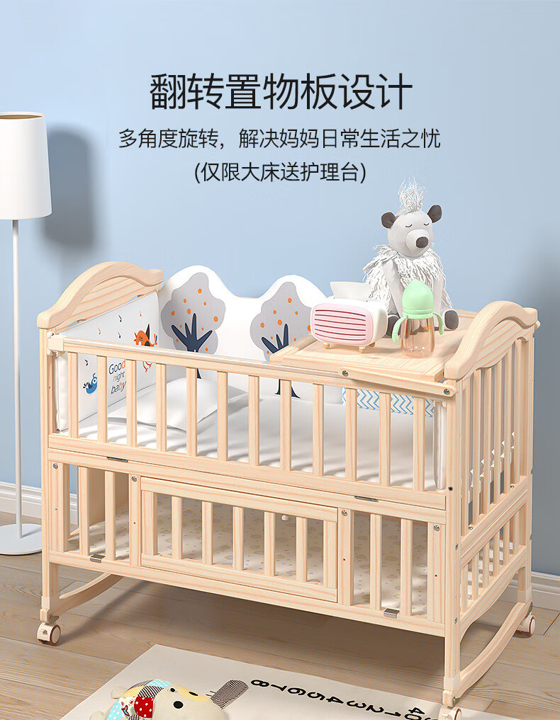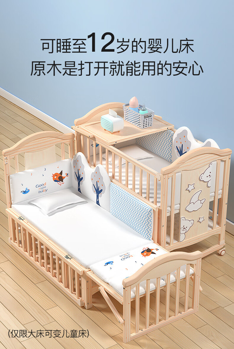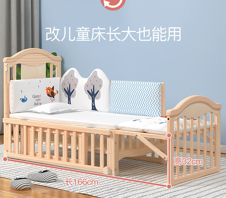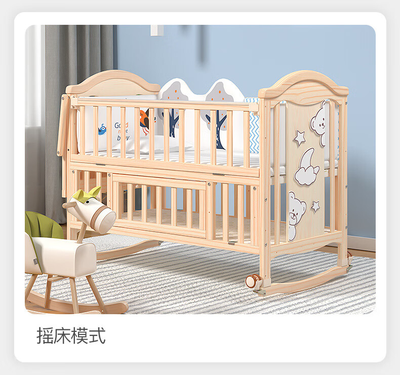 Crib solid wood unpainted multifunctional newborn baby cradle bed children's removable and splicable baby bed 598 log bed + mosquito net + brown mat large bed 120*65*98cm (changeable children's bed)