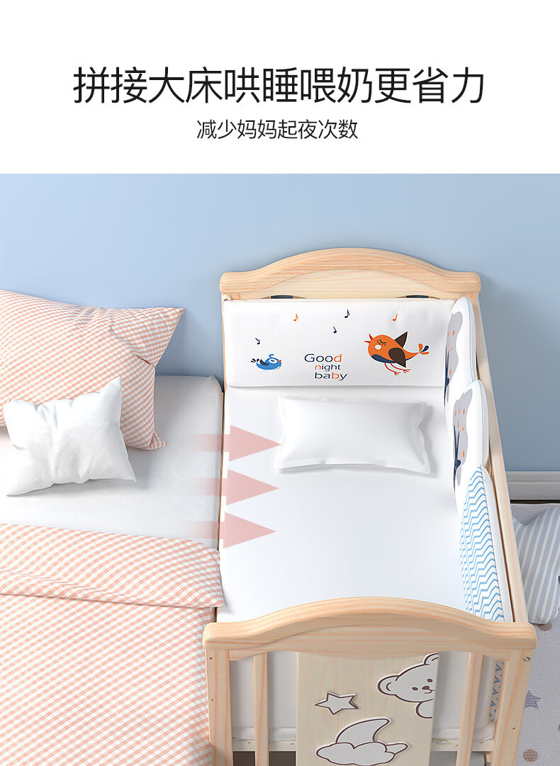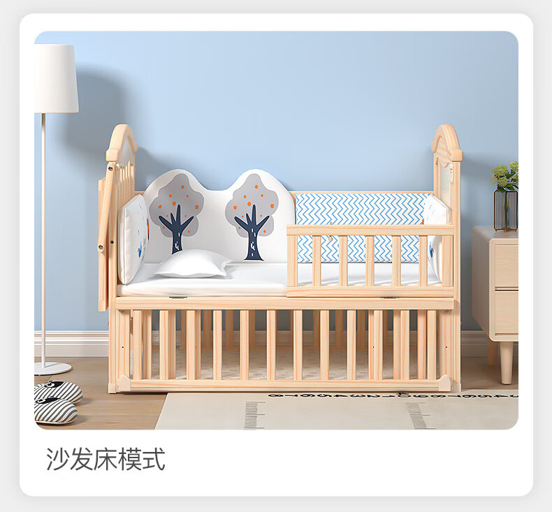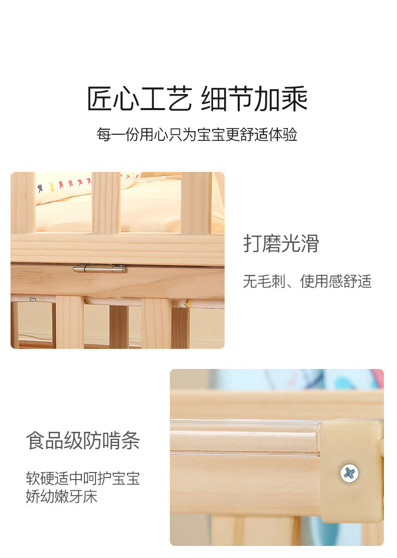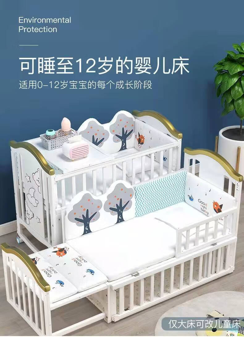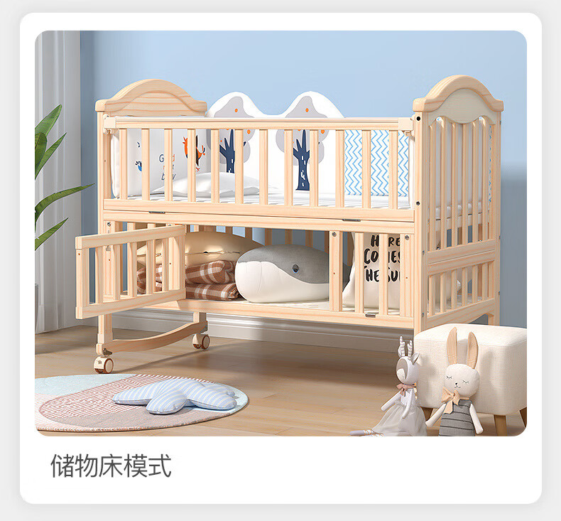 Crib solid wood unpainted multifunctional newborn baby cradle bed children's removable and splicable baby bed 598 log bed + mosquito net + brown mat large bed 120*65*98cm (changeable children's bed)
