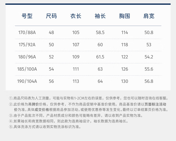 China (cm) 165 / 88-90 170 / 96-98 175 / 108-110 180 / 118-122 185 / 126-130